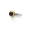 A show-stopping dark pink tourmaline gemstone sits atop of a sterling silver band. The gemstone is rounded ( cabochon) and set in 18ct solid gold with a gold surround. The band has been lightly hammered to add a textured feel to the ring. Please note we only have one of these rings in stock.