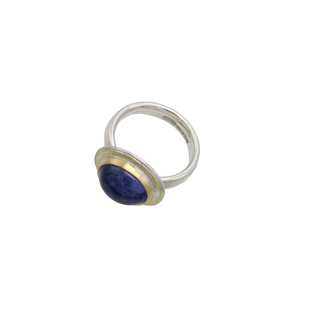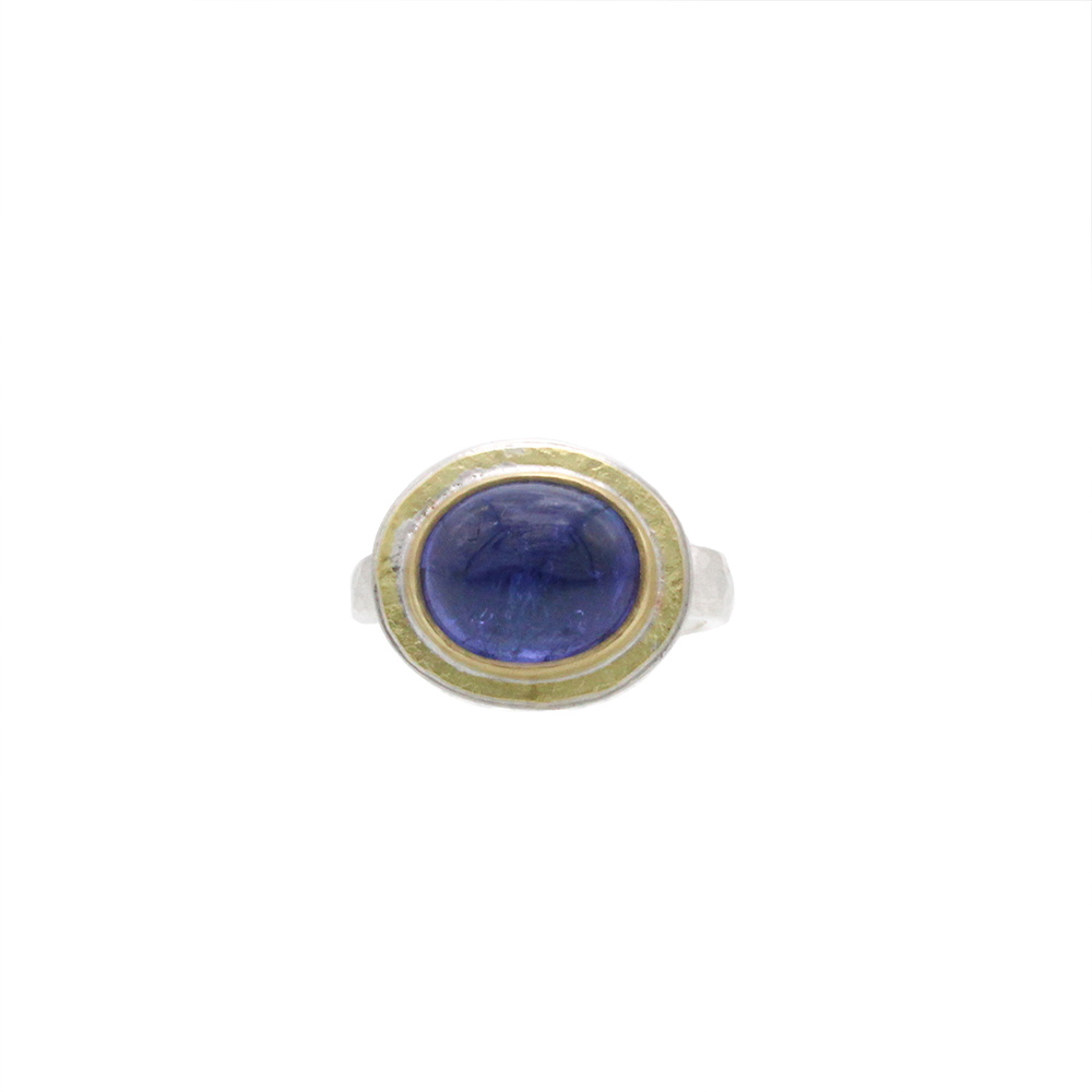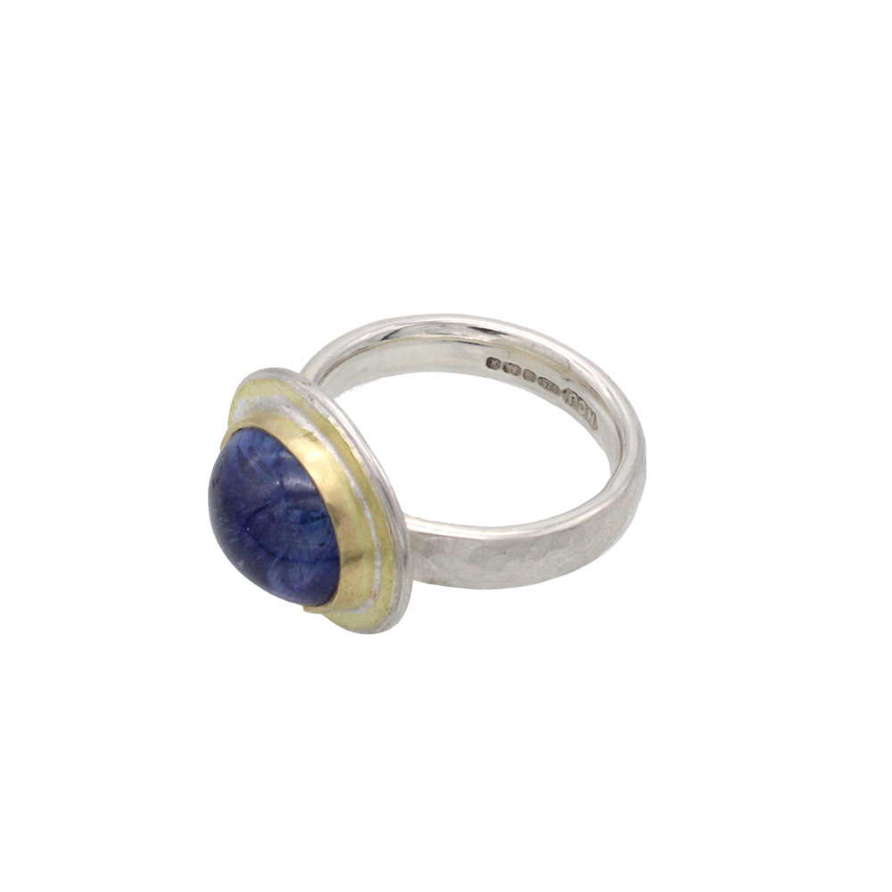 Such a beautiful handmade ring! Did you know tanzanite continues to be one of the rarest gemstones in the world, only being found in one place on earth? This ring features a rounded tanzanite cabochon, which is bezel set in solid 18ct gold with a gold surround, and set upon a lightly hammered sterling silver band. Please note we only have one of these in stock.