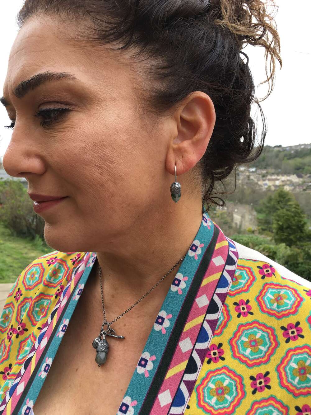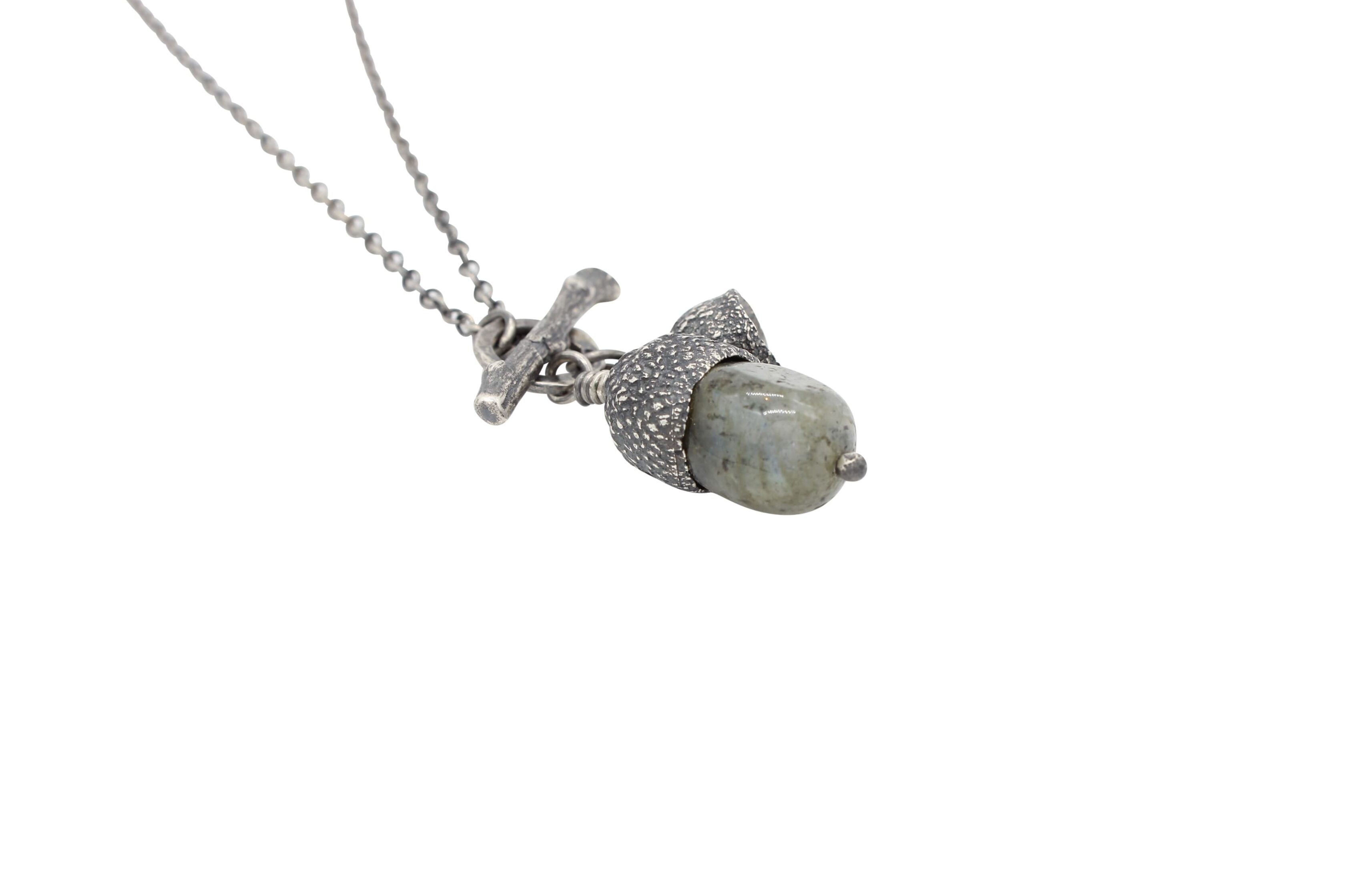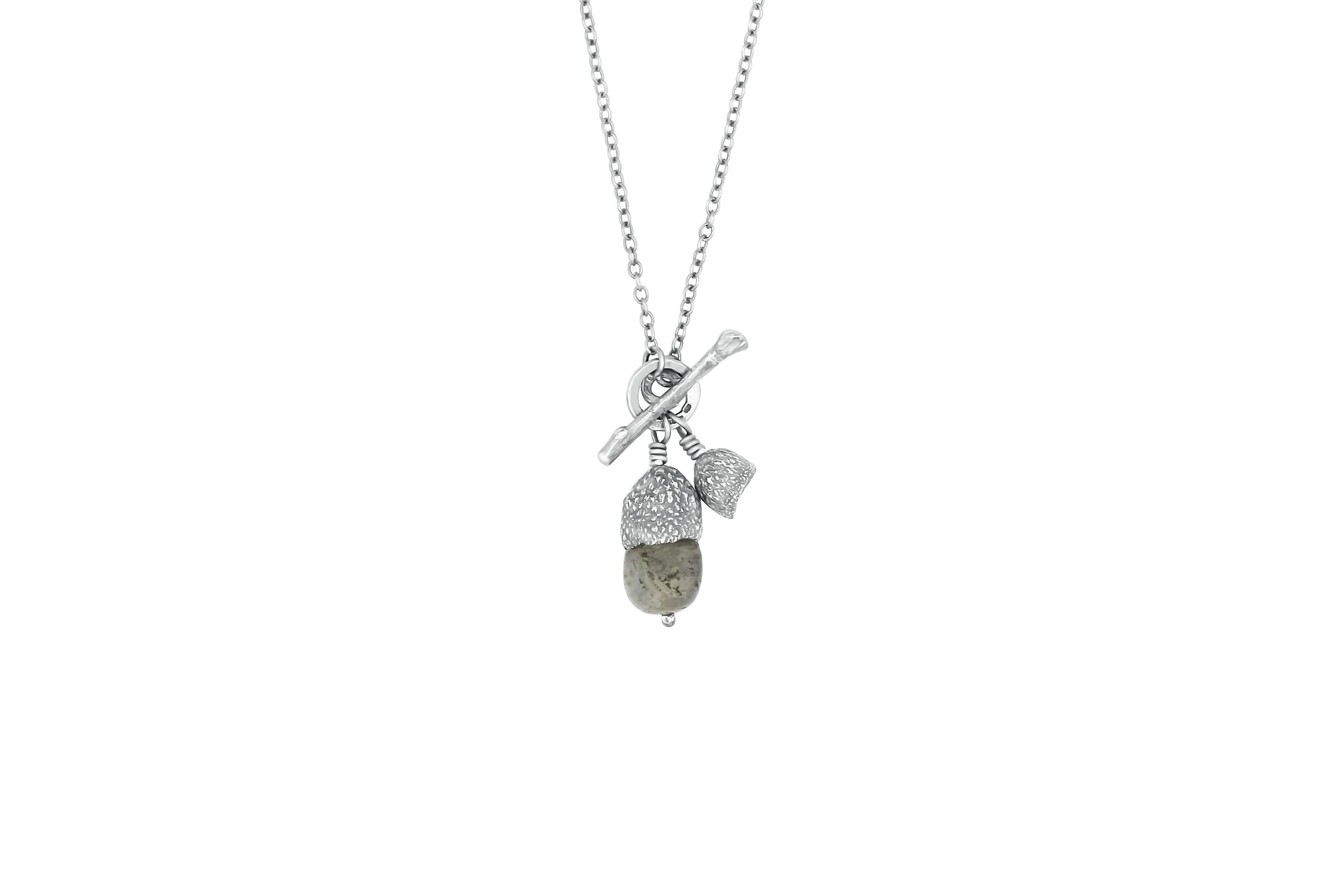 A stunning necklace featuring an oxidised cast acorn cap with a semiprecious Labradorite gemstone body and a second cast acorn cap. The necklace is fastened with a twig toggle, with a lovely tactile and textured finish. This necklace is perfect for Nature lovers.