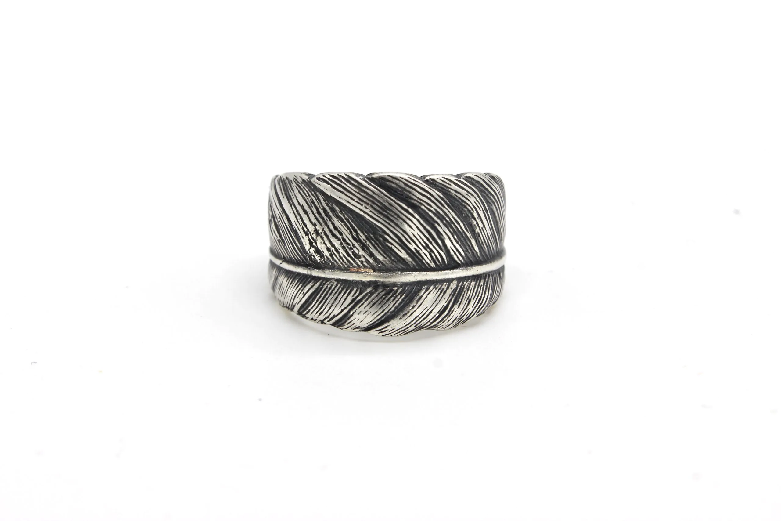 A unique oxidised sterling silver ring with a detailed feather wrap style. Matching feather earrings available here.