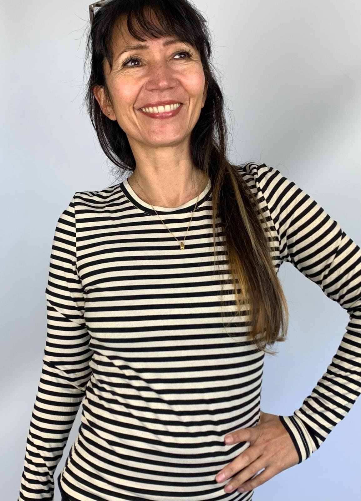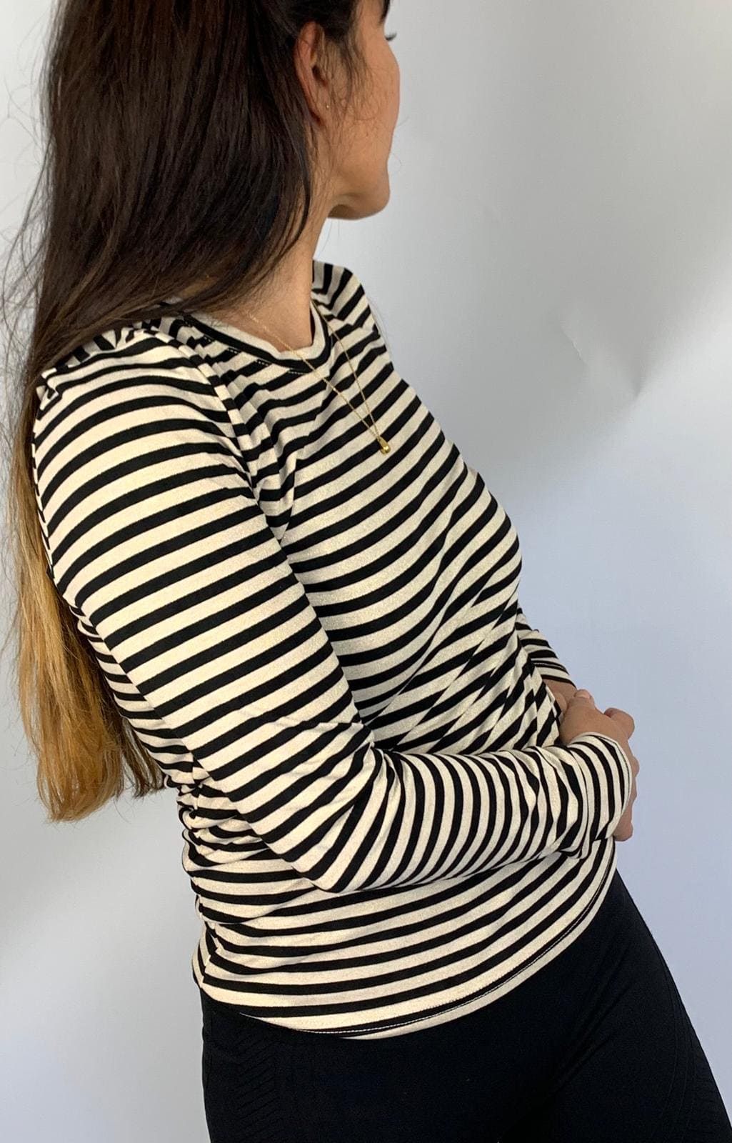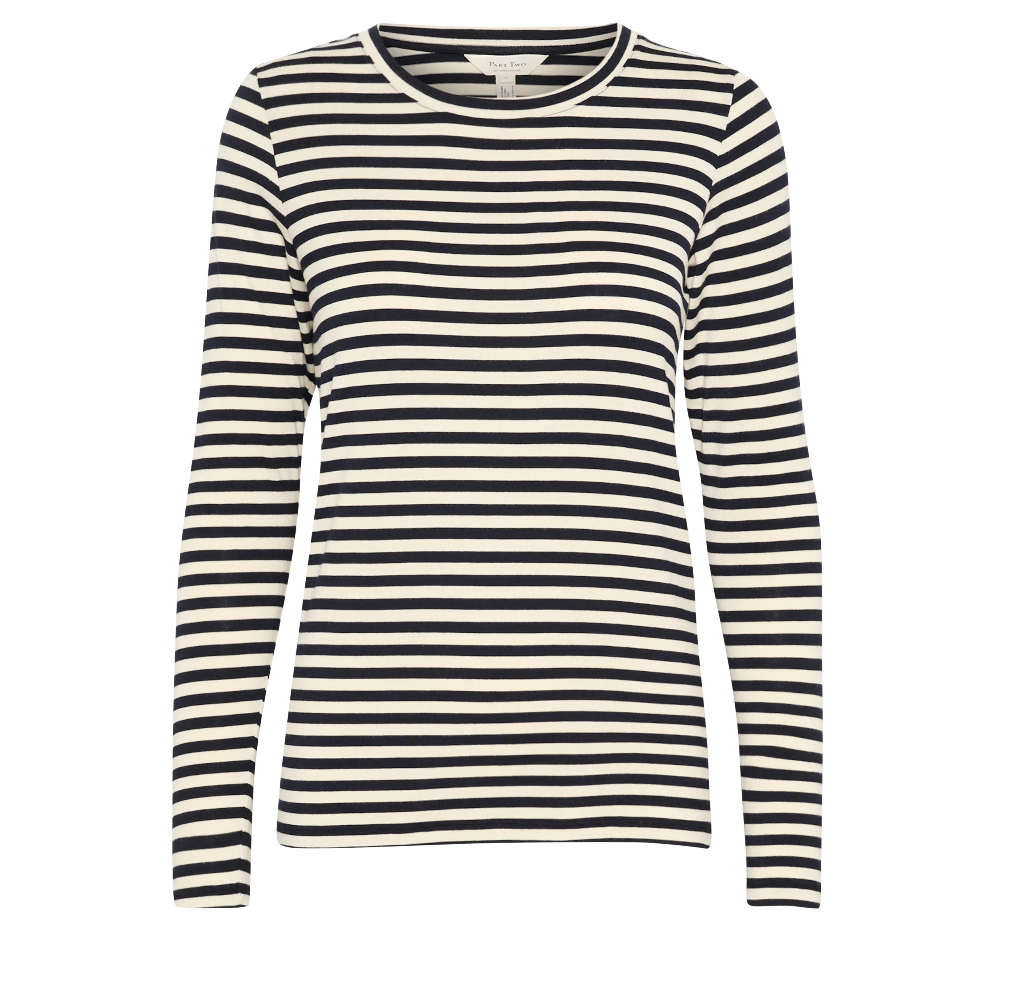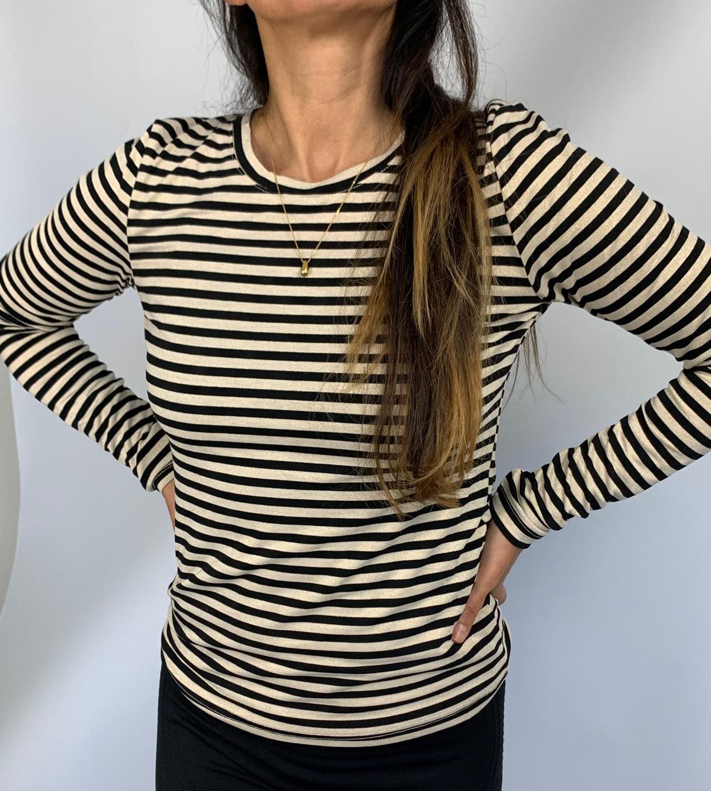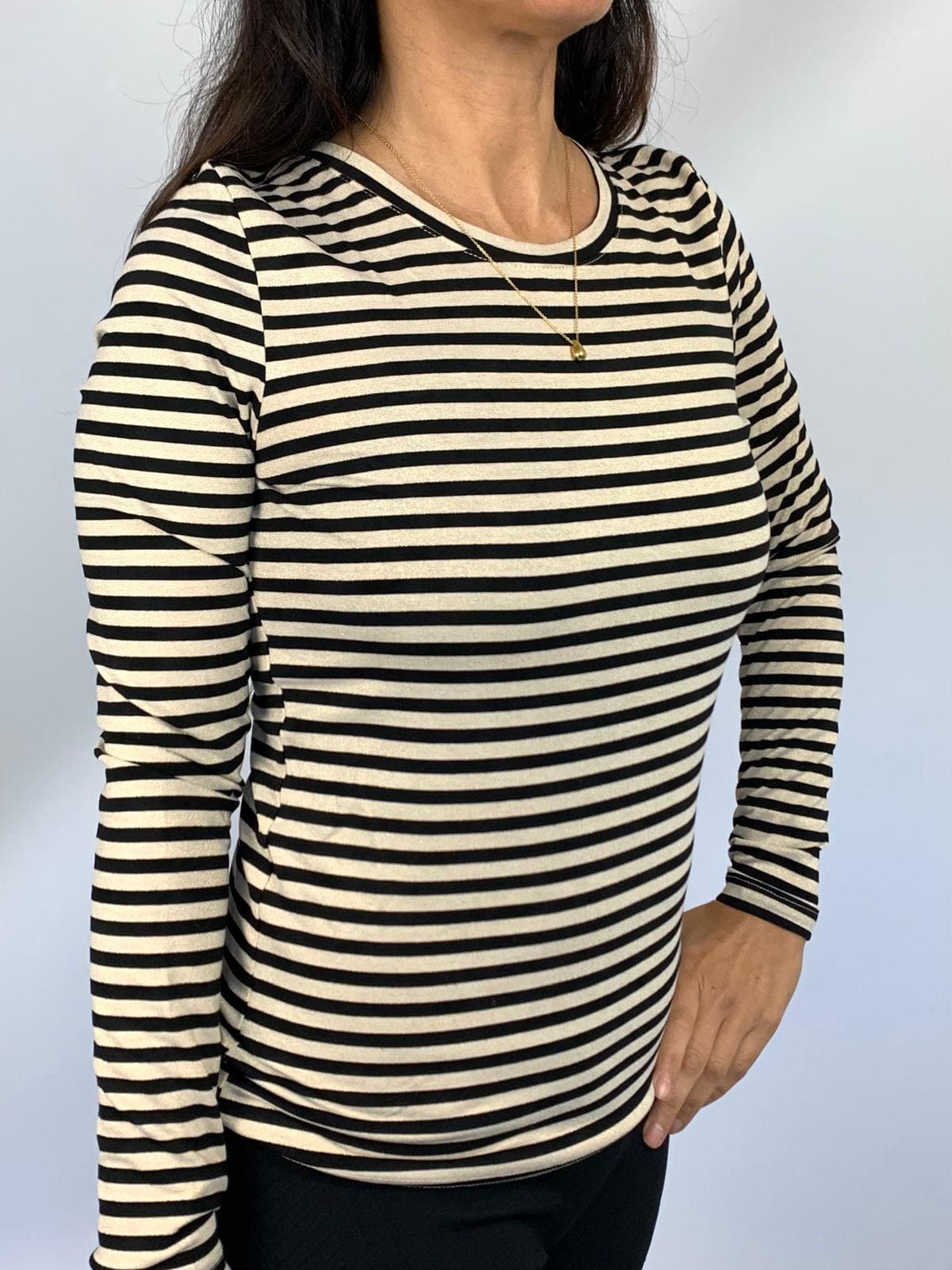Elevate your casual wardrobe with this timeless striped long-sleeve top. Crafted from soft, breathable fabric, it features a classic round neckline and a flattering fit. Perfect for layering or wearing on its own, this versatile top is a must-have for any season.