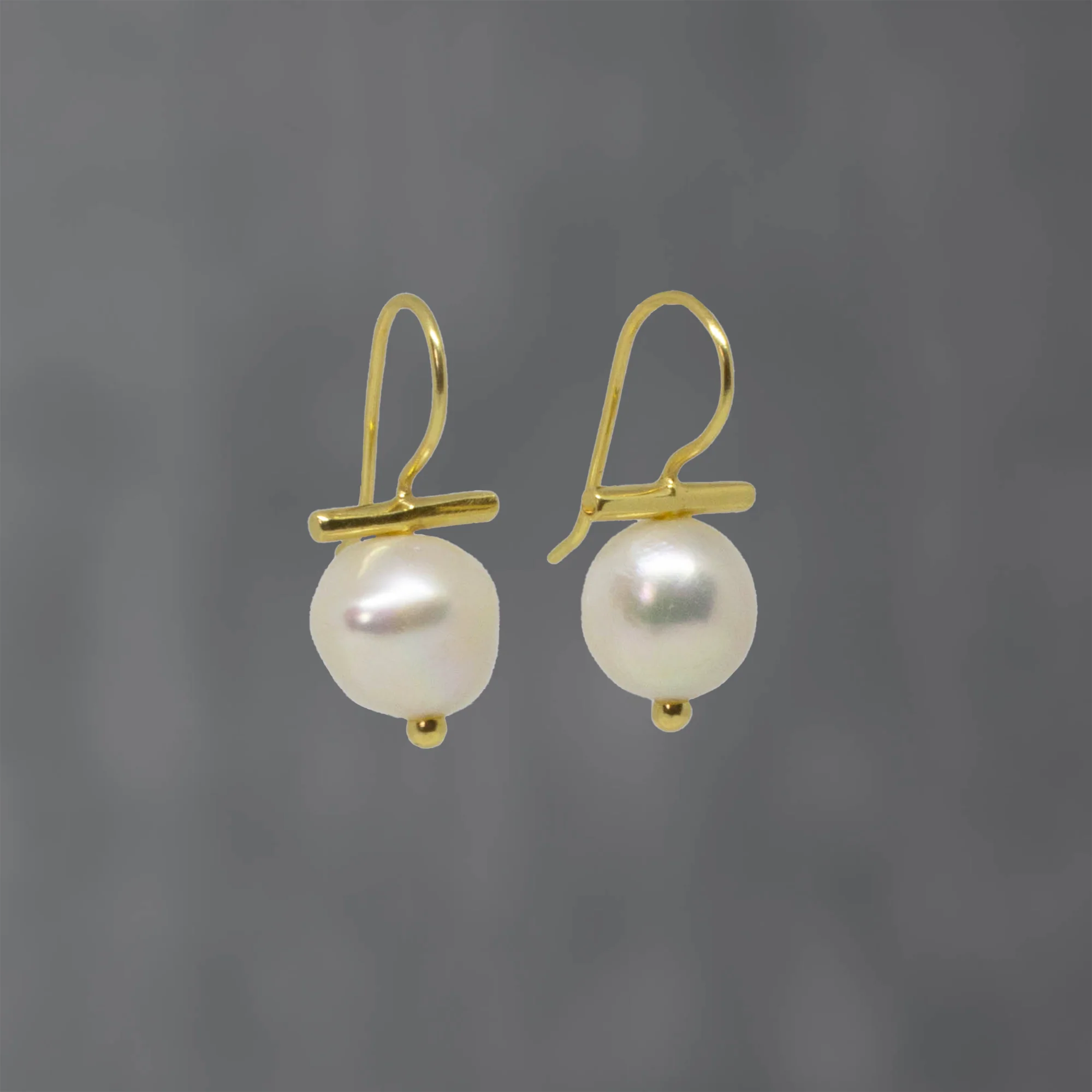 Classic pearl earrings with a modern twist. These contemporary earrings feature irregular freshwater pearls with a minimal bar design. Handmade in sterling silver or 18k gold plated silver.