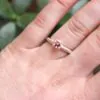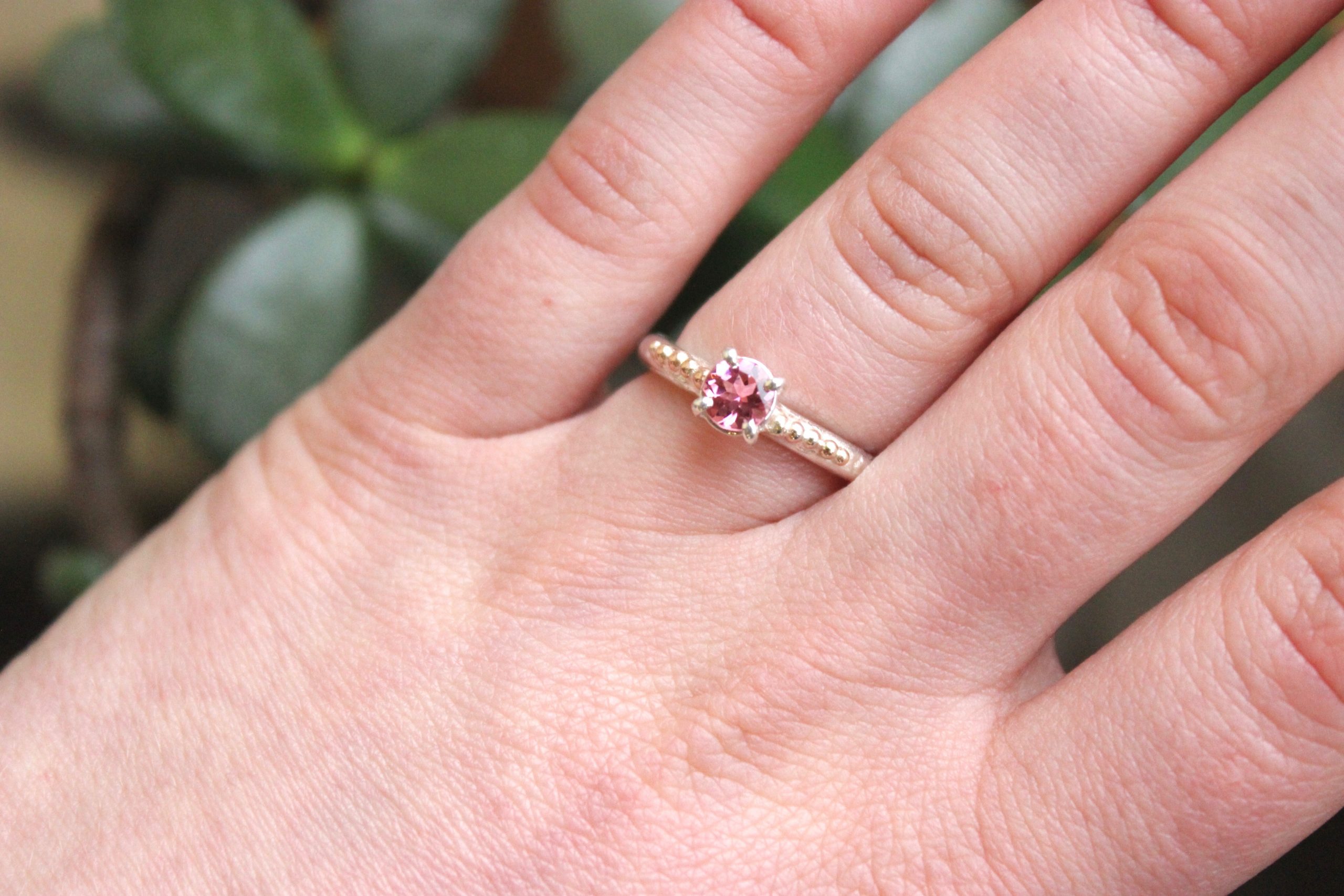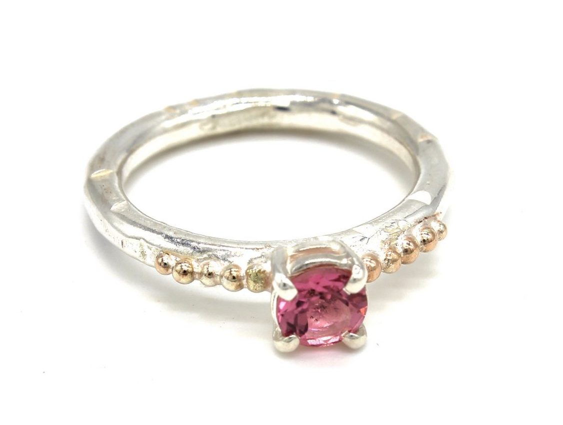 A stunning sterling silver handmade ring with a mesmerising pink tourmaline gemstone in a silver basket setting with rose gold dot details either side.