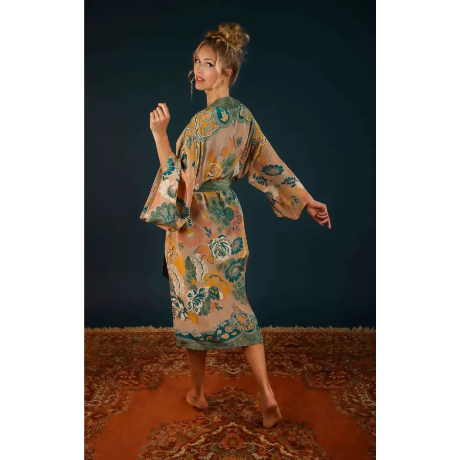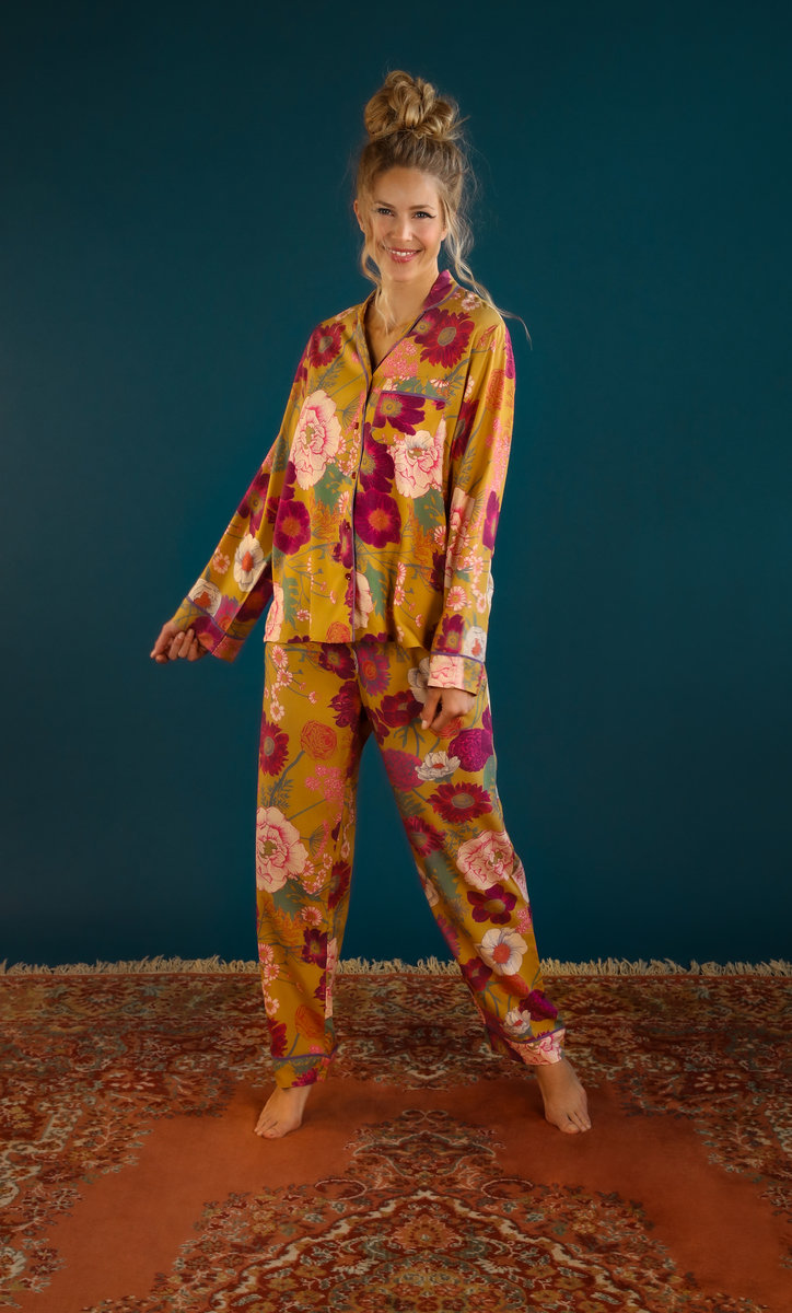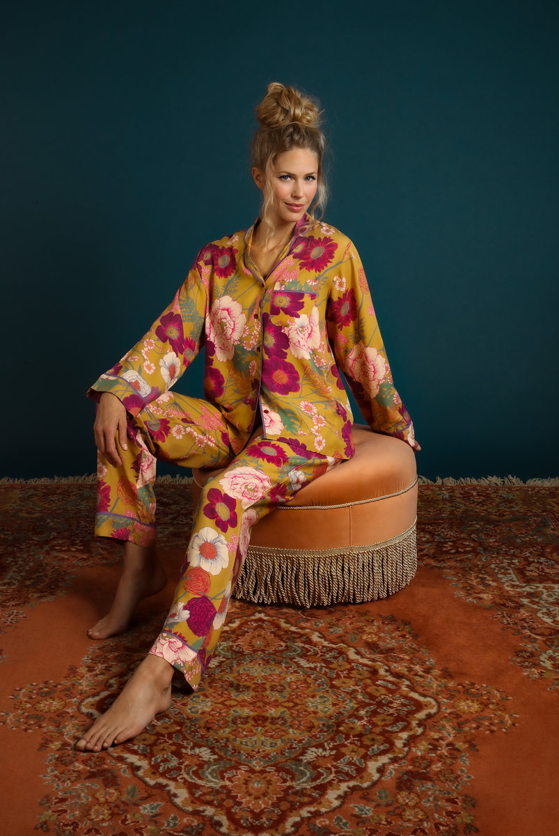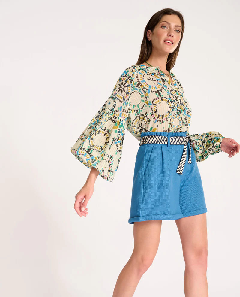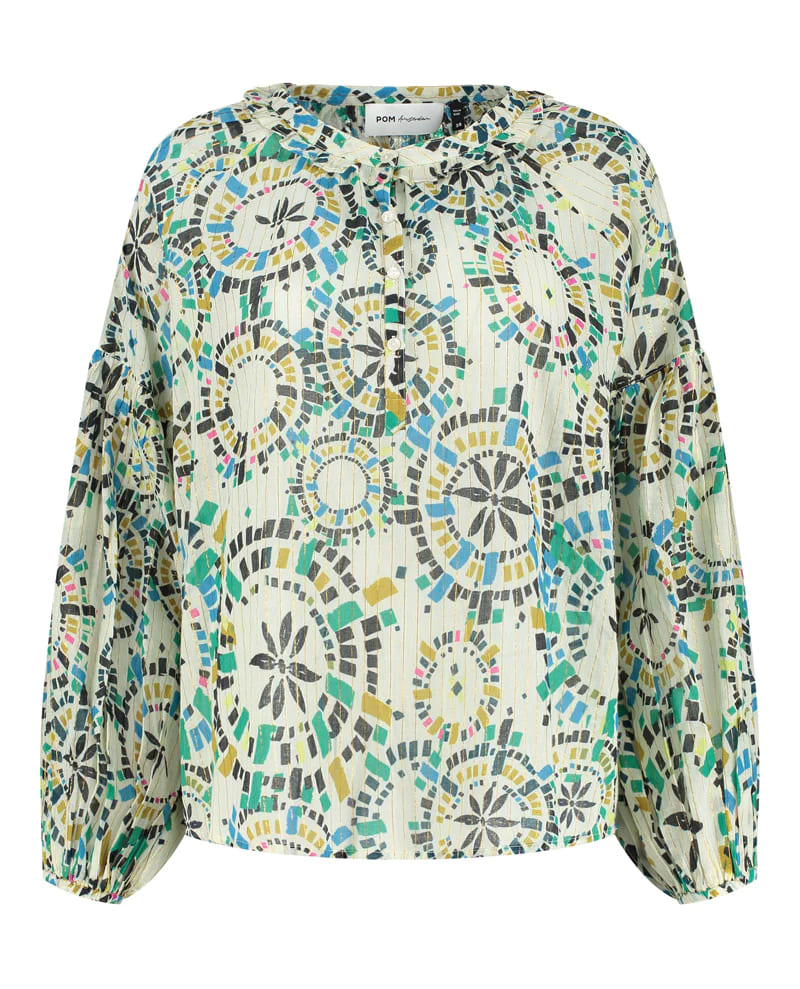 Pom Amsterdam Sunny World Ivory Top, a lightweight tile print cotton blouse with subtle metallic stripes. Made up from shades of green, blue, mustard and black the Sunny World top has long voluminous sleeves an a round neck that fastens at the front with 3 buttons. POM is available online and in the Edinburgh stores.