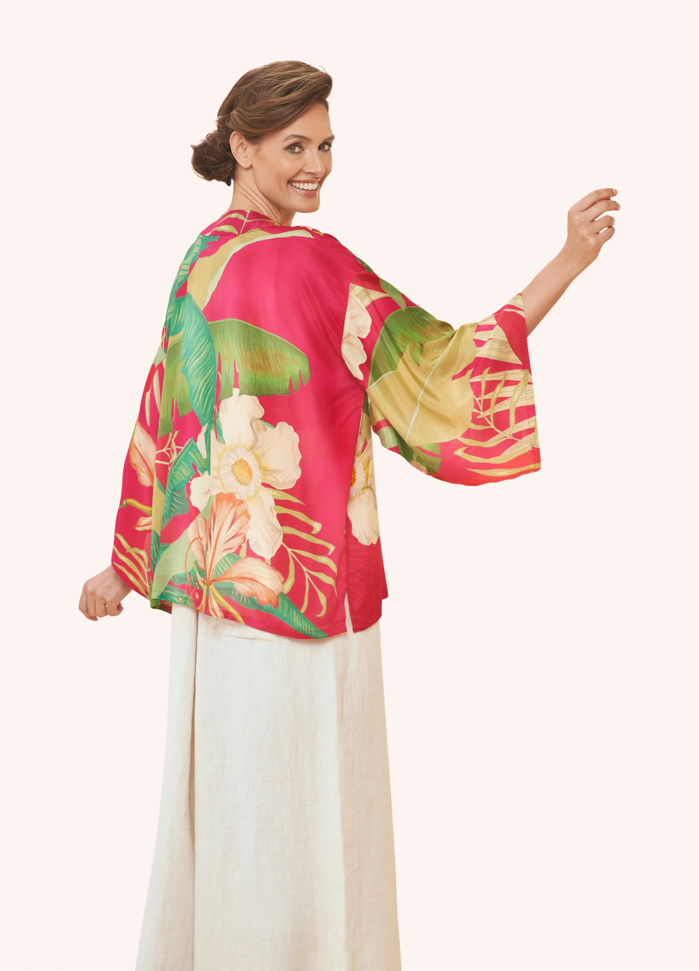This Delicate Tropical Jacket in Dark Rose is where sophistication meets everyday luxuries. Vibrant tones combined with jungle florals are sure to elevate every capsule wardrobe. Wear with jeans and a top for the ideal coverup. Go on, treat yourself!