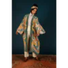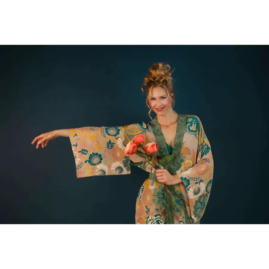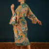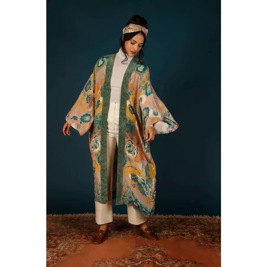 With a luxurious crepe de chine feel for Winter, this Folk Art Floral print is gloriously detailed and elegant! The perfect piece for draping over any outfit to add style and sophistication – you will be sure to turn heads wherever you go! Equally suited to wrap around your sleepwear – you will never want to take it off! Notes on Kimono Sizing: Our Kimonos are unsized, and it really depends how you would wish to wear them how the fit will be! Some of us in the office wear them open with the belt tied behind, some closed and tied more like a robe – so that part is really up to you. These will look great on anyone from around 5”2 in height to 5”10, they will just be a little longer on some than others!