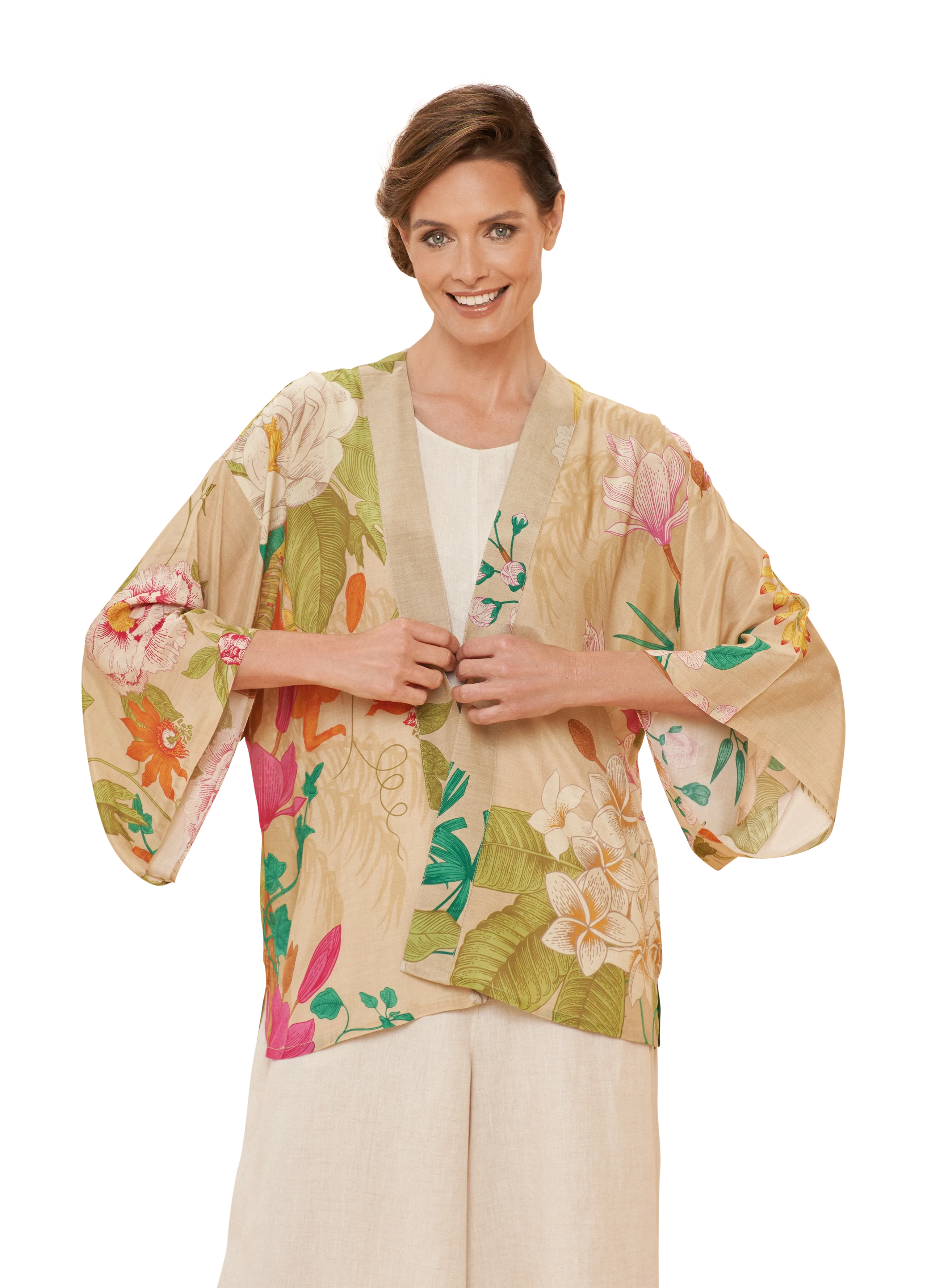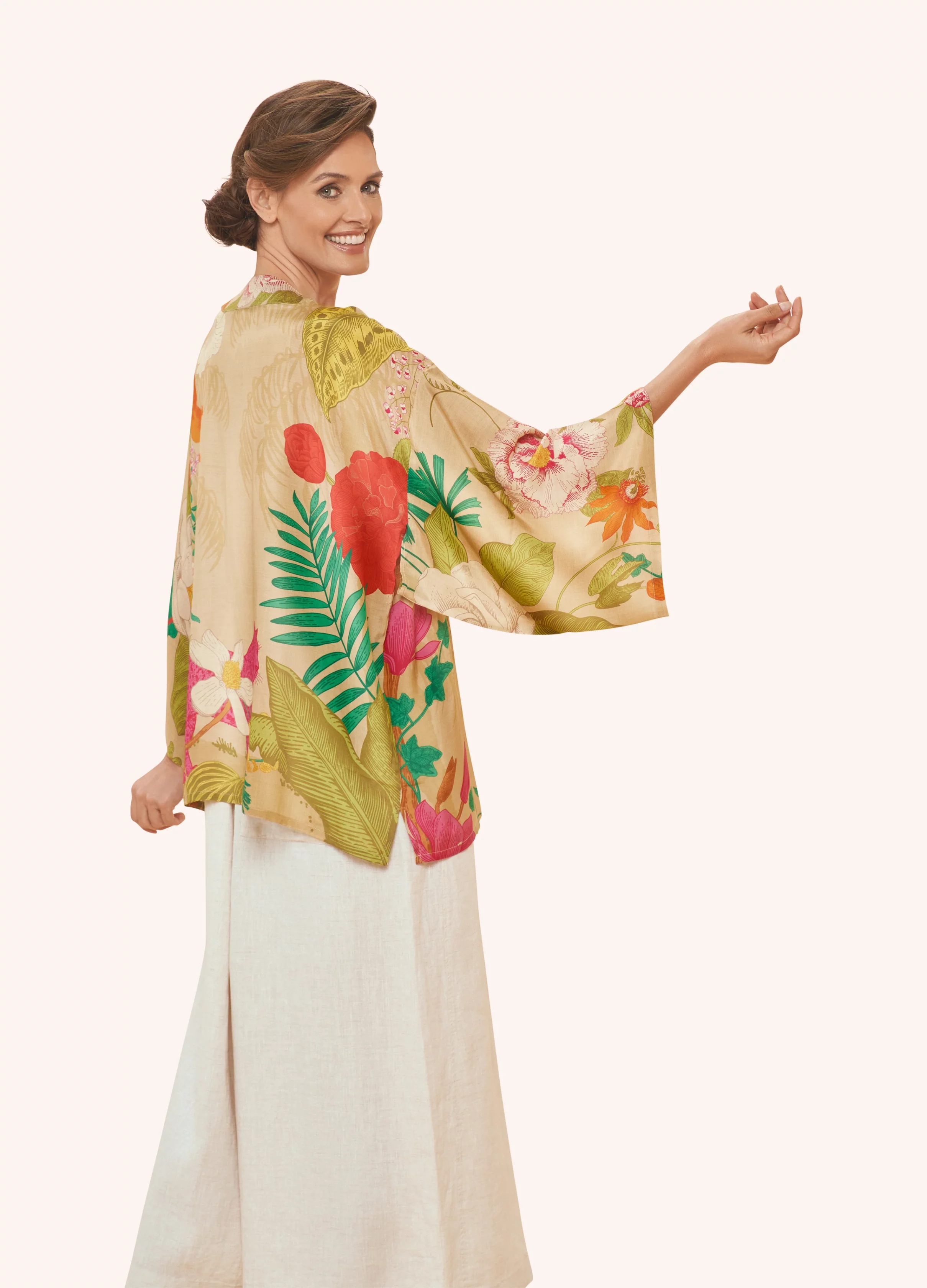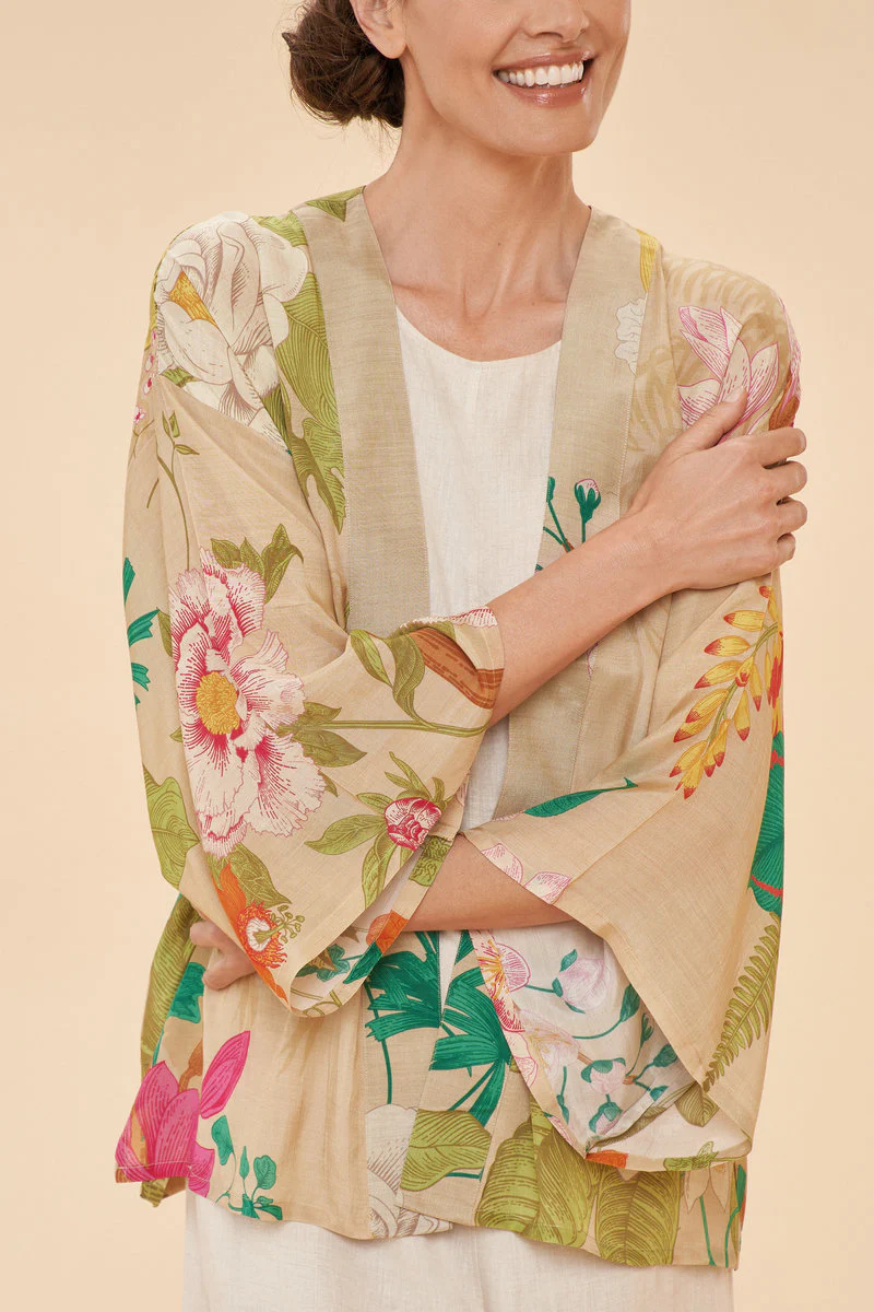 This Kimono Jacket is where art nouveau inspiration meets modern high-end design. Our Tropical Flora and Fauna Kimono Jacket in coconut is perfectly decorative and feminine with equal measure. Command a room – effortlessly! This can be worn so many ways – combine with a jumpsuit or with your favourite jeans and top combo for chic styling.