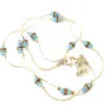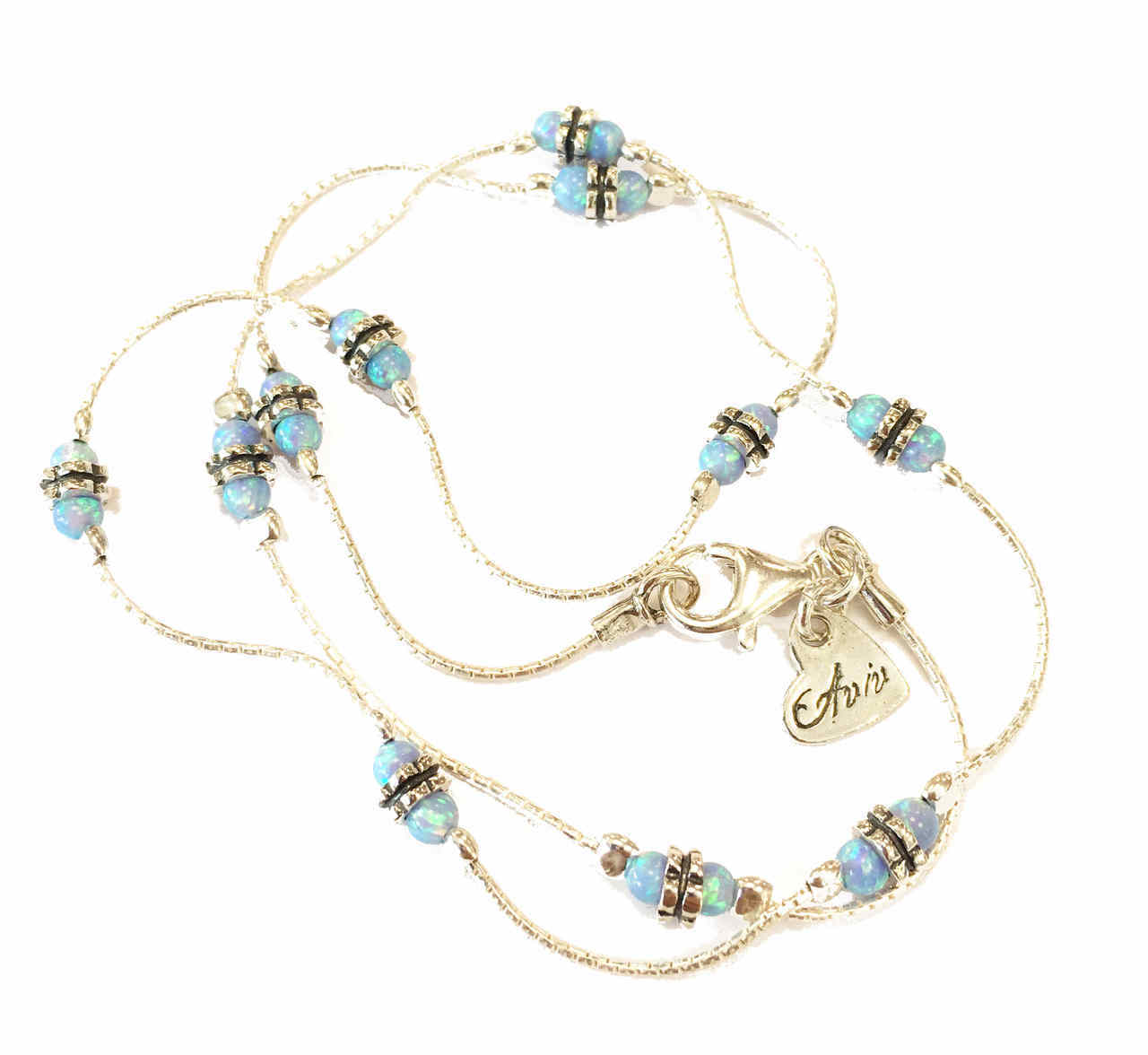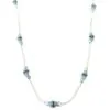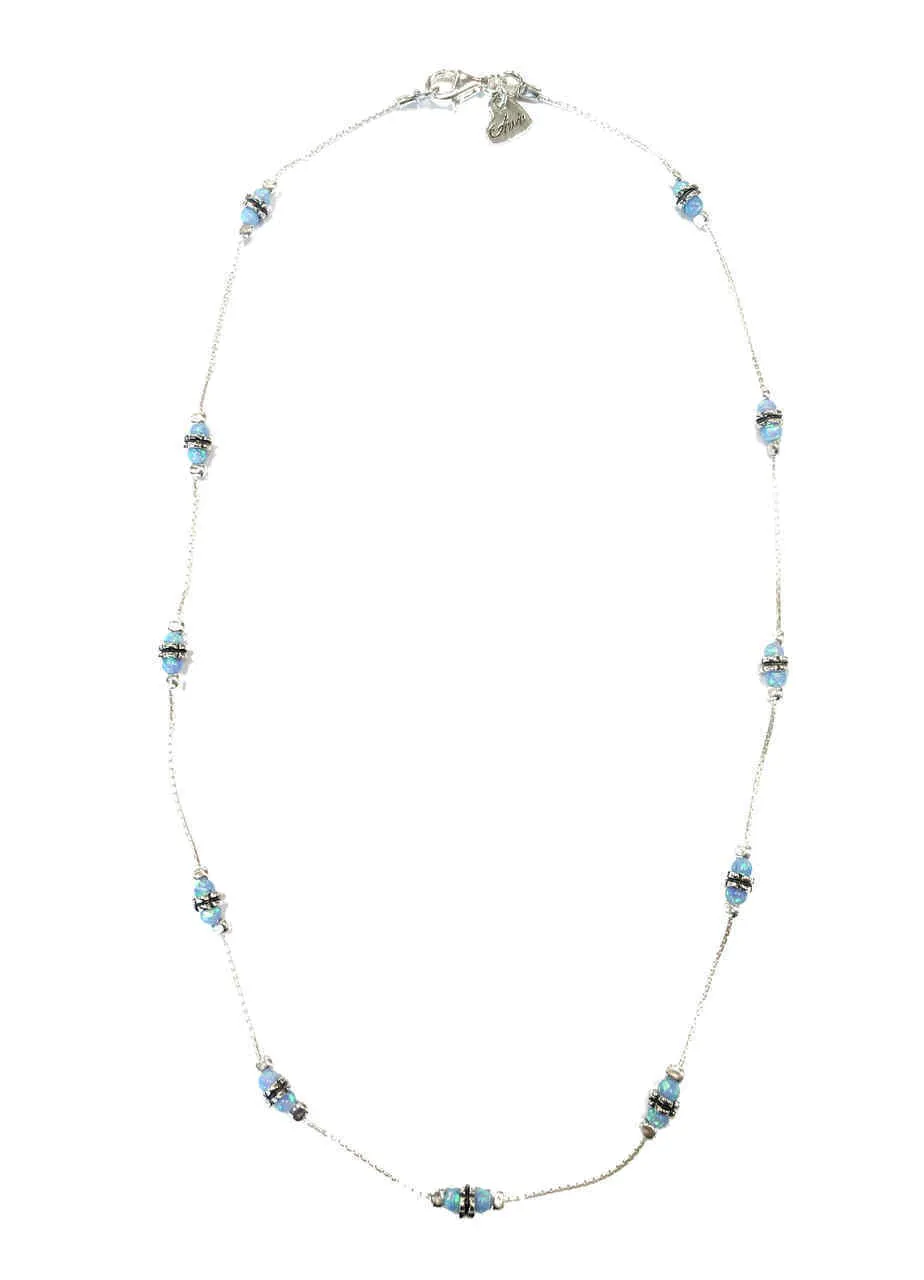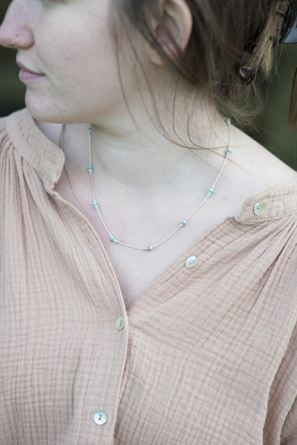 Beautiful sterling silver thin box-chain necklace with pairs of tiny opalite beads all along with subtle flower petal detailing in between. Absolutely stunning. The aqua blue looks marvellous against the silver.