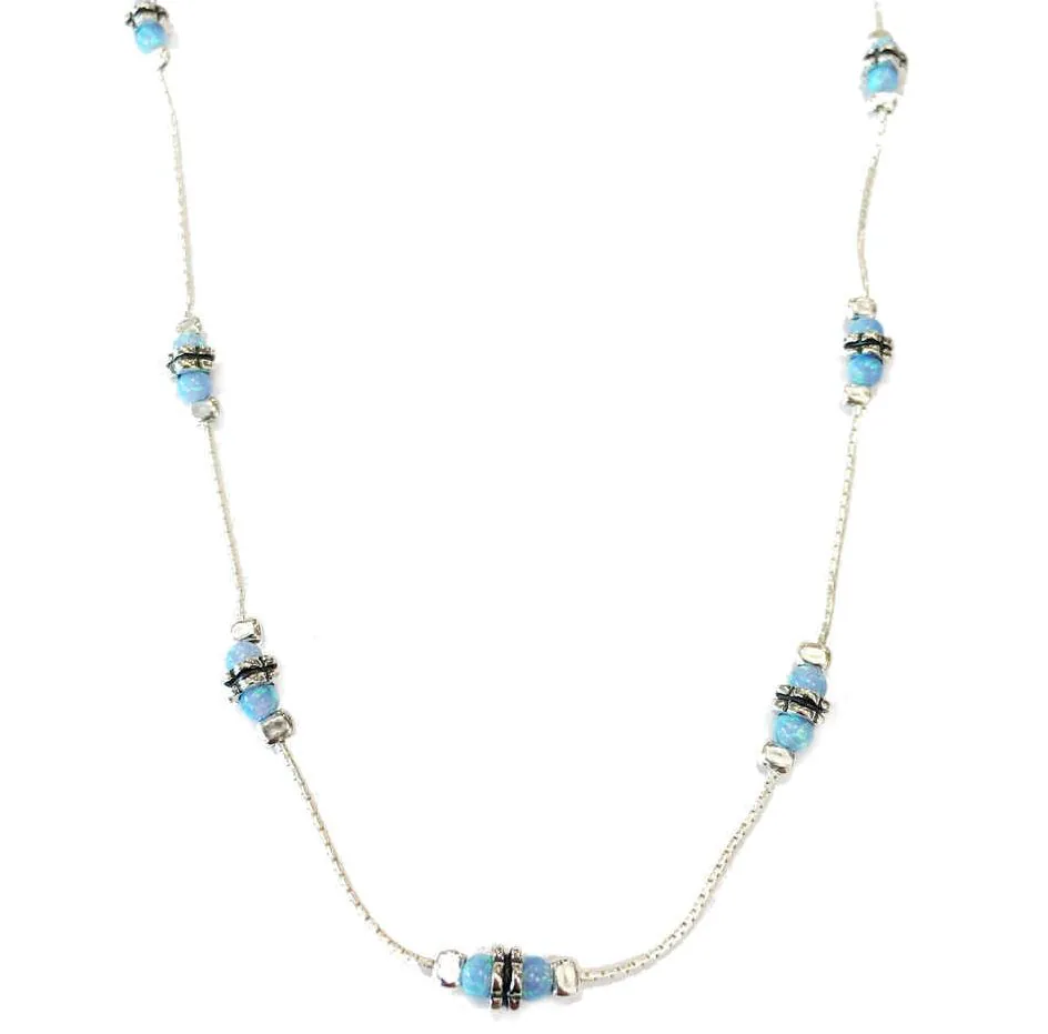 A unique, handmade 925 solid sterling silver thin box-chain necklace with small silver and opalite beads all along.