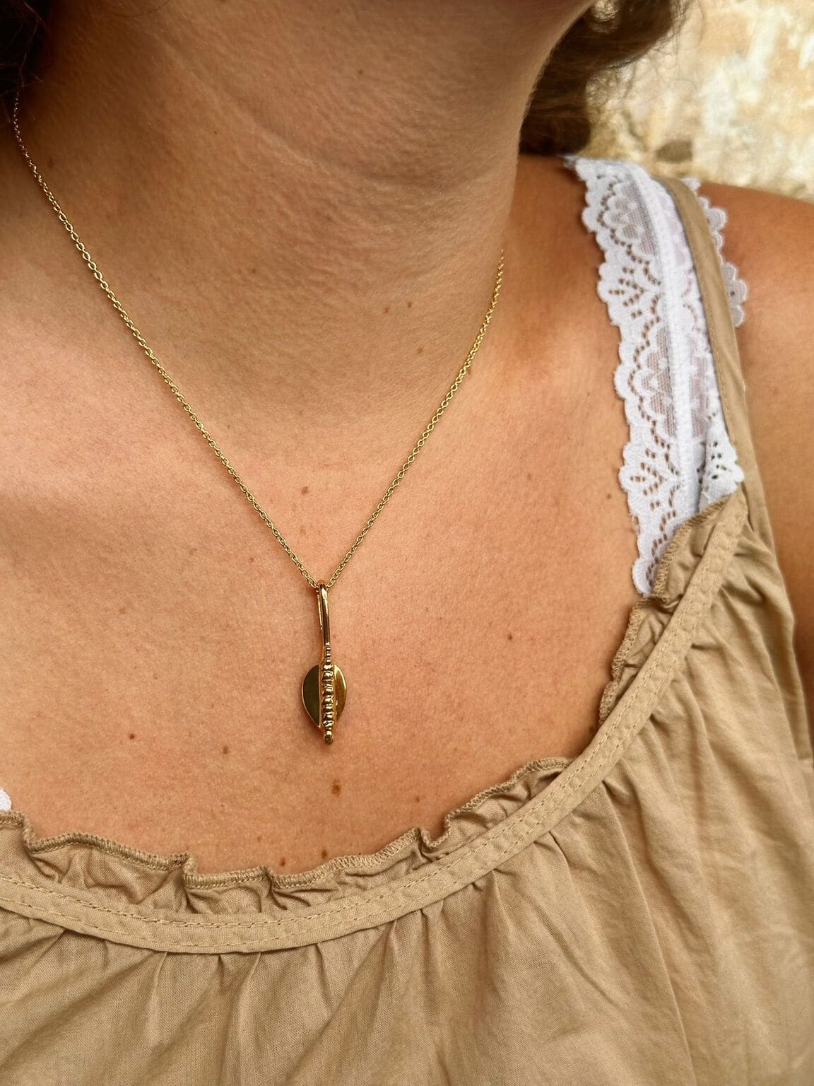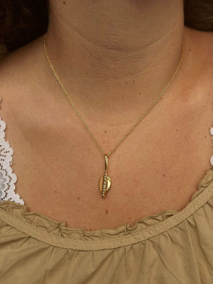 This necklace showcases a minimalist design with a modern, shield-like shape. Its sleek and geometric form symbolizes protection and strength while maintaining a sophisticated, contemporary aesthetic. A subtle yet impactful piece that embodies resilience and elegance.