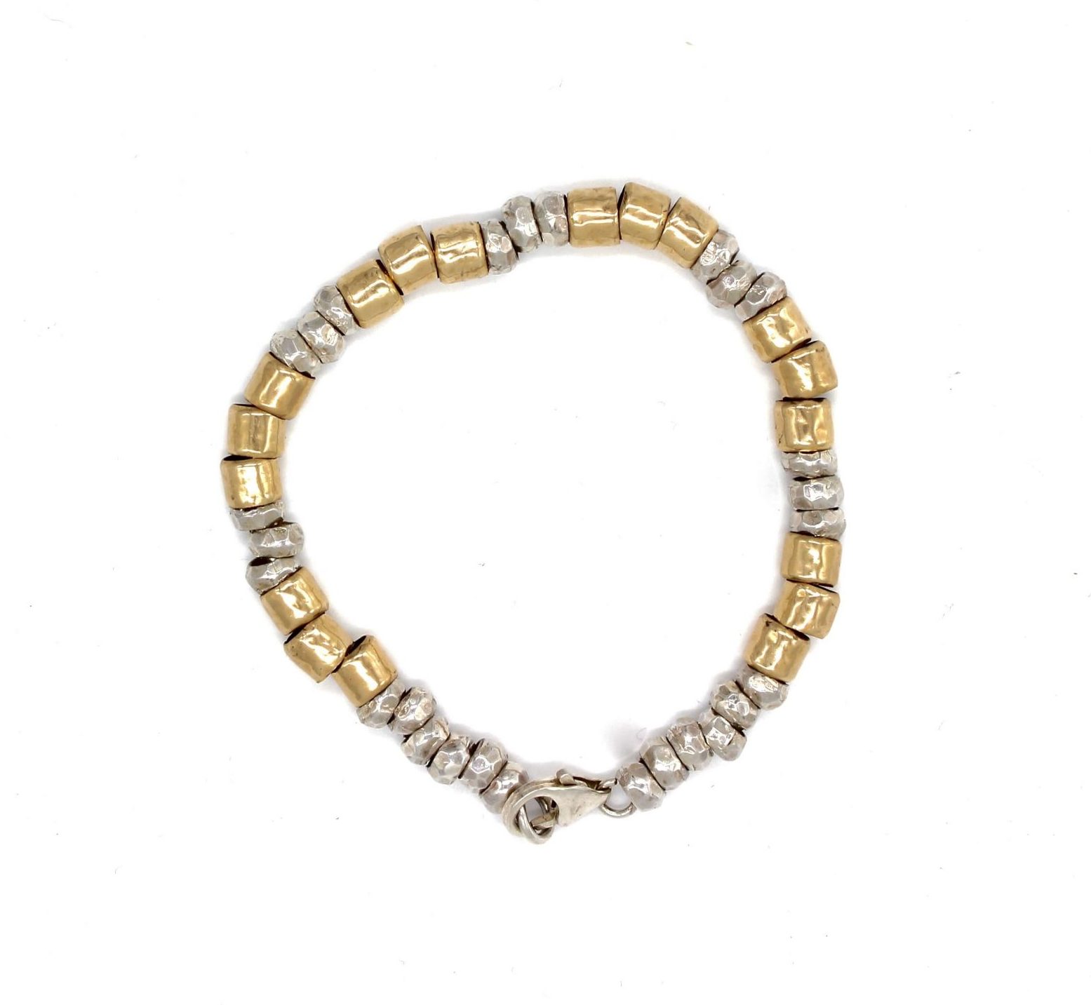 An amazing bracelet with chunky, tactile beads of rolled gold and solid sterling silver. This gold and silver bead bracelet has a subtle and natural textured appearance which allows it to shine and catch the light brilliantly.