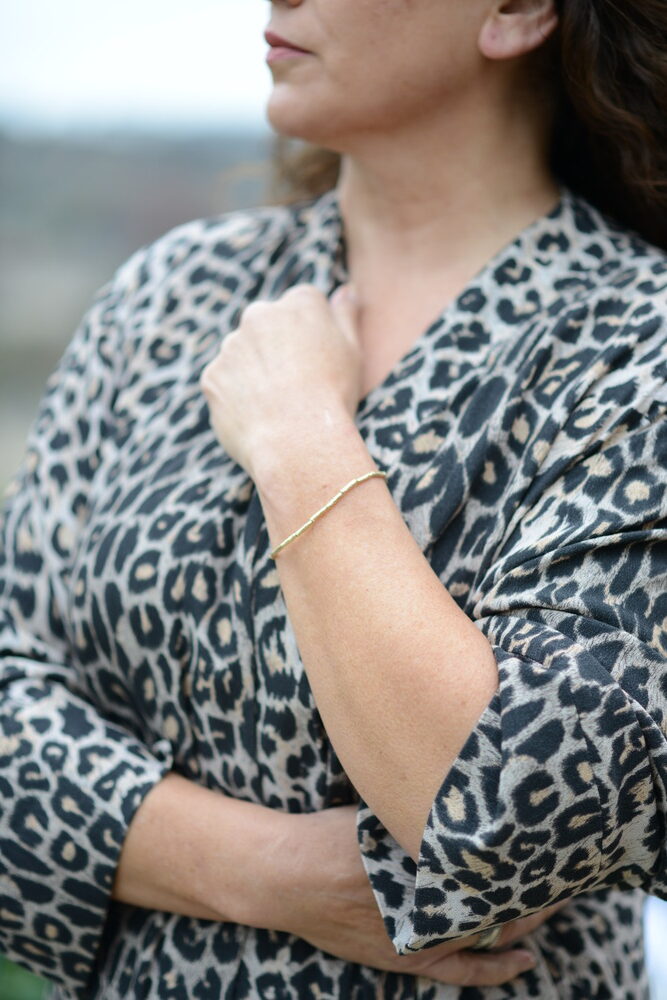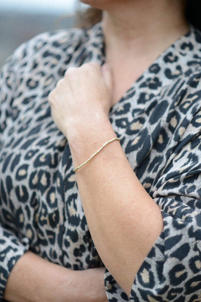 An organically textured sterling silver bracelet with a rolled gold finish. Rolled gold is thicker than gold plating, and therefore is more robust and will last longer.