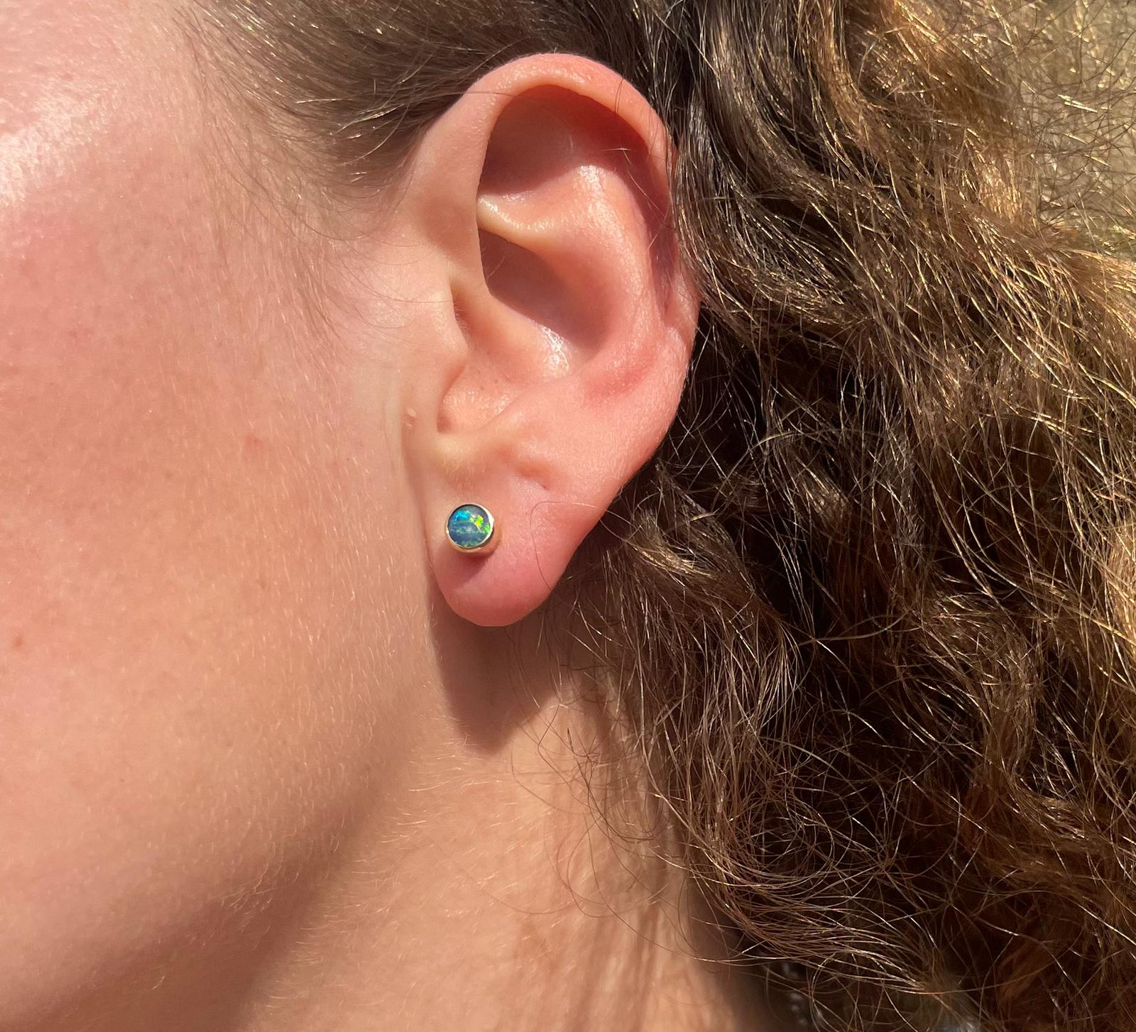 Small is absolutely beautiful in these blue opal 9ct gold set studs, whether worn as a single pair or as a layer, you will look fabulous with these delightful opals sat on your ear. They are so deep in colour and slightly different which makes them very special. They were designed in Devon by this British Designer