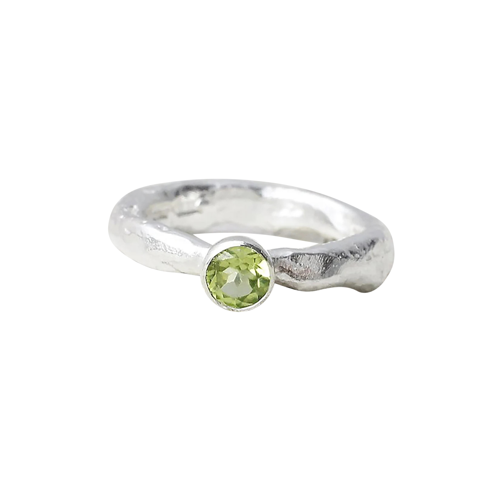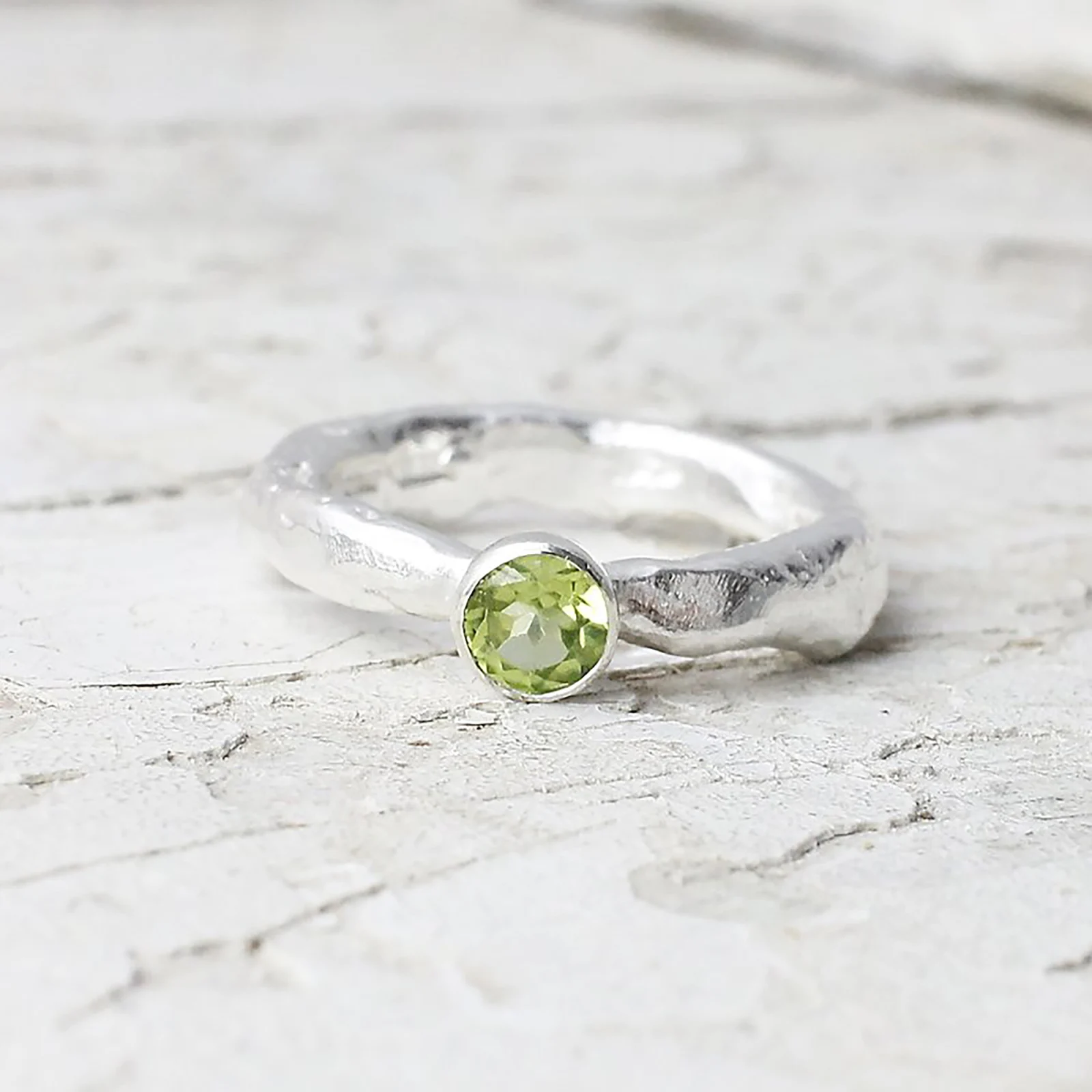 Beautifully simple handmade peridot ring made of solid sterling silver. The ring features a stunning green peridot gemstone of 4mm diameter, and the texture has a lovely organic feel to it – influenced by the Cornwall coastline.