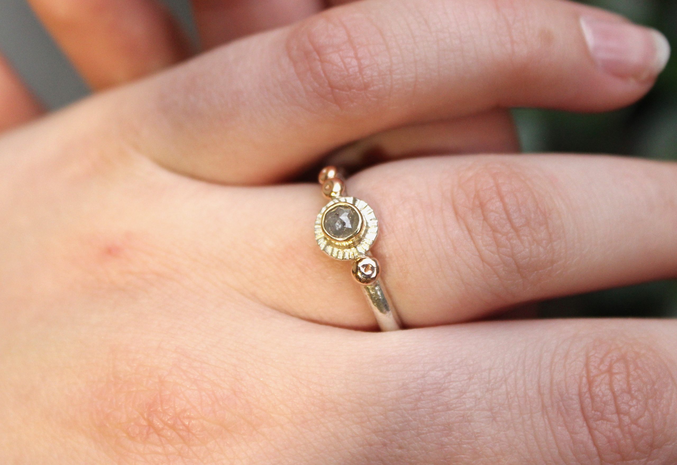 Salt and Pepper Diamond. All the stones are handpicked by this lovely British Designer, with each ring in mind. The diamond is set in 9 ct yellow gold within the starburst and either side on the shank of the ring you will see a rose gold bobble.