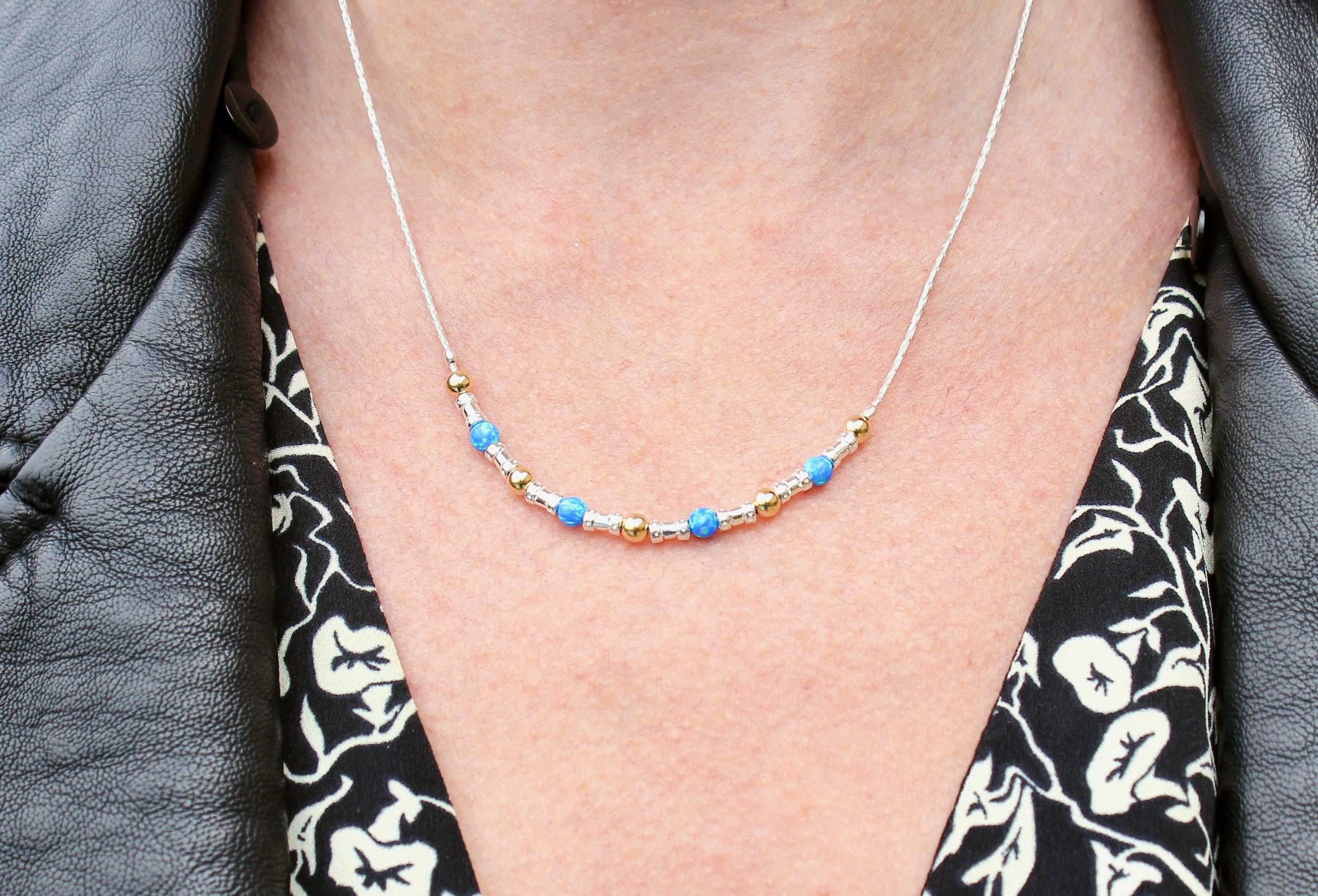 A delicate silver and filled gold stunning dark blue opal necklace, threaded onto a beautiful silver chain, handmade in the UK by Lavan Designer Jewellery.