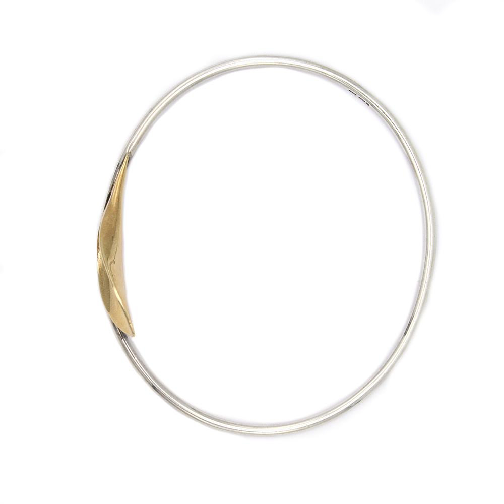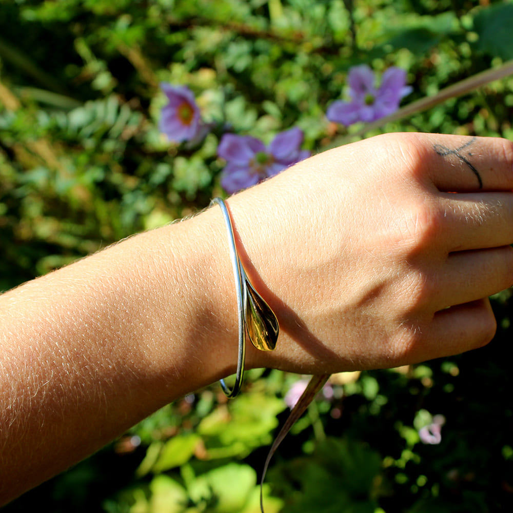 A stunningly elegant bangle, handcrafted from sterling silver and 9ct yellow gold. Features a round sterling silver bangle with a golden lily-inspired petal.