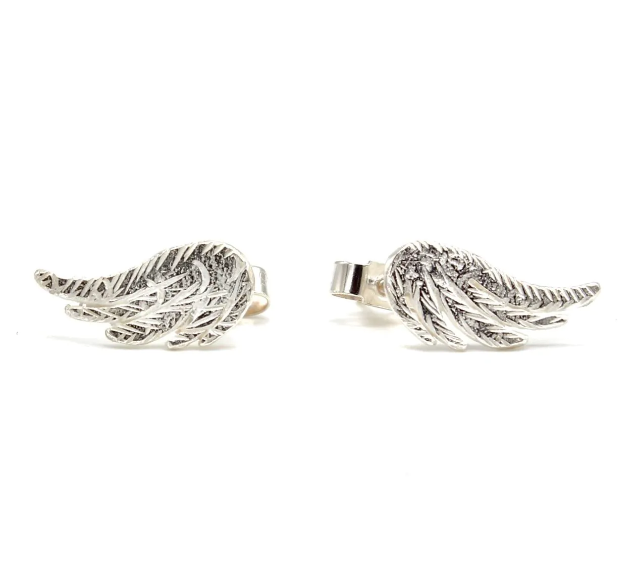Sterling silver angel wings stud earrings with a delicately textured finish.