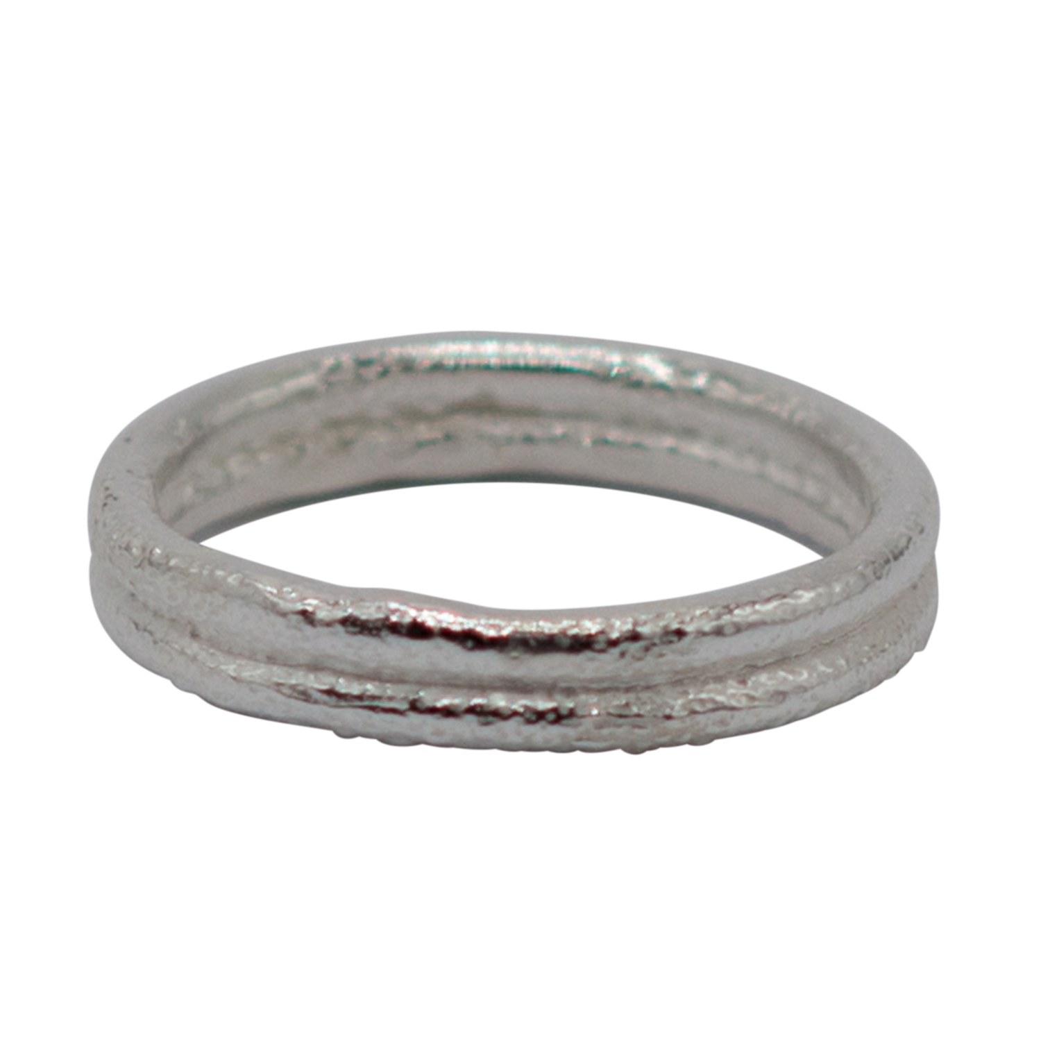 Handcrafted solid sterling silver ring with a double band form and tactile finish.