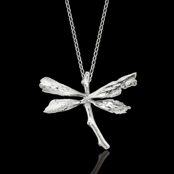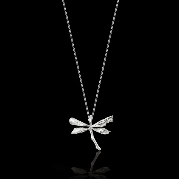 This designer has impeccable eye and style, drawing from magical experiences and surroundings. A pendant, where a playful silver dragonfly is created from an apple twig body and wings cast from Ash seed leaves.
