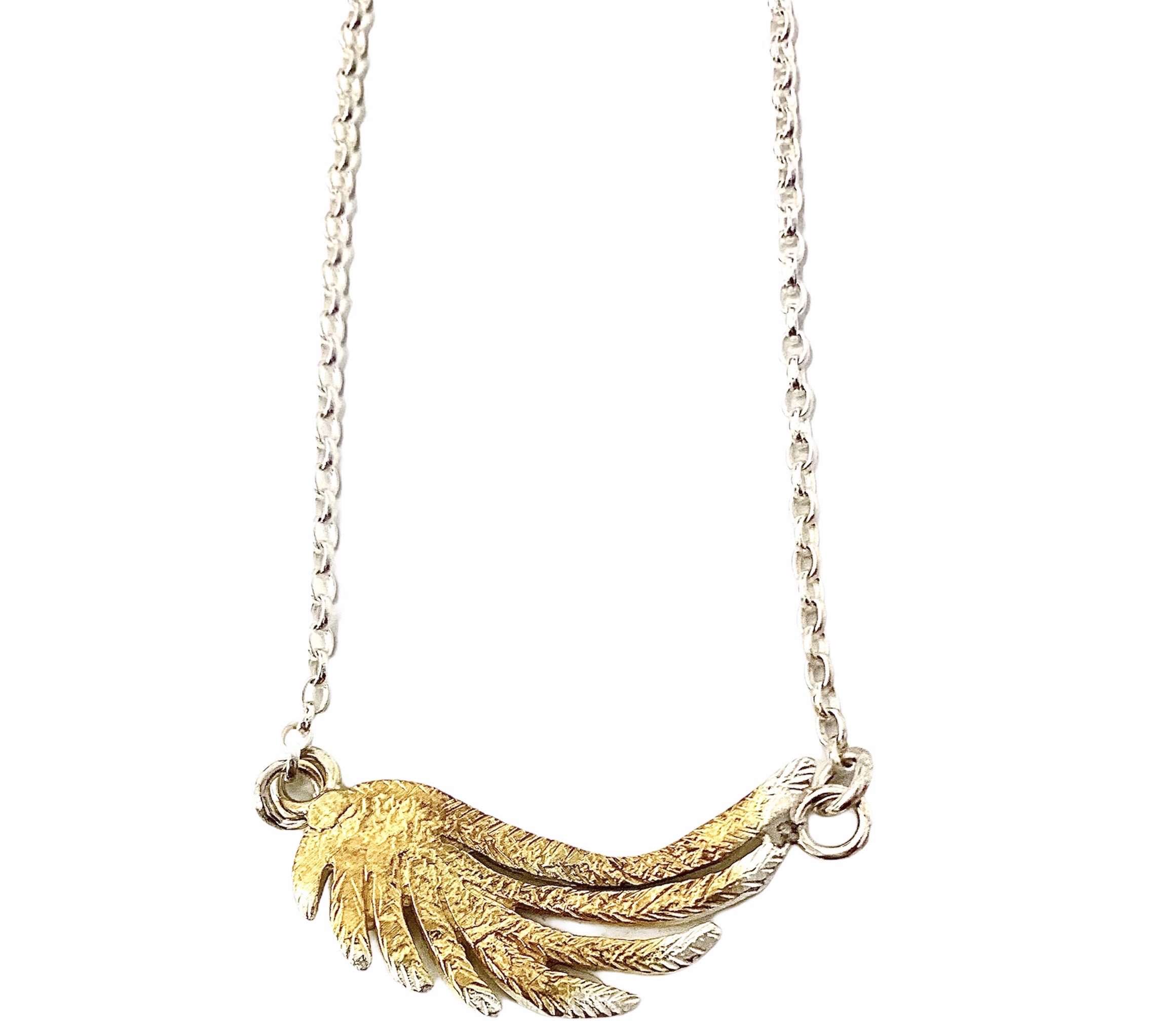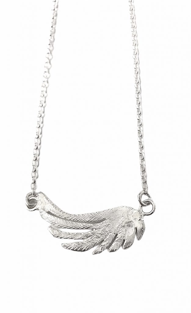 Silver Angel Wing – brushed lightly with gold plating then hung horizontally to sit just at the nape of your neck. Wear on its own or add a longer layer to create a new look.