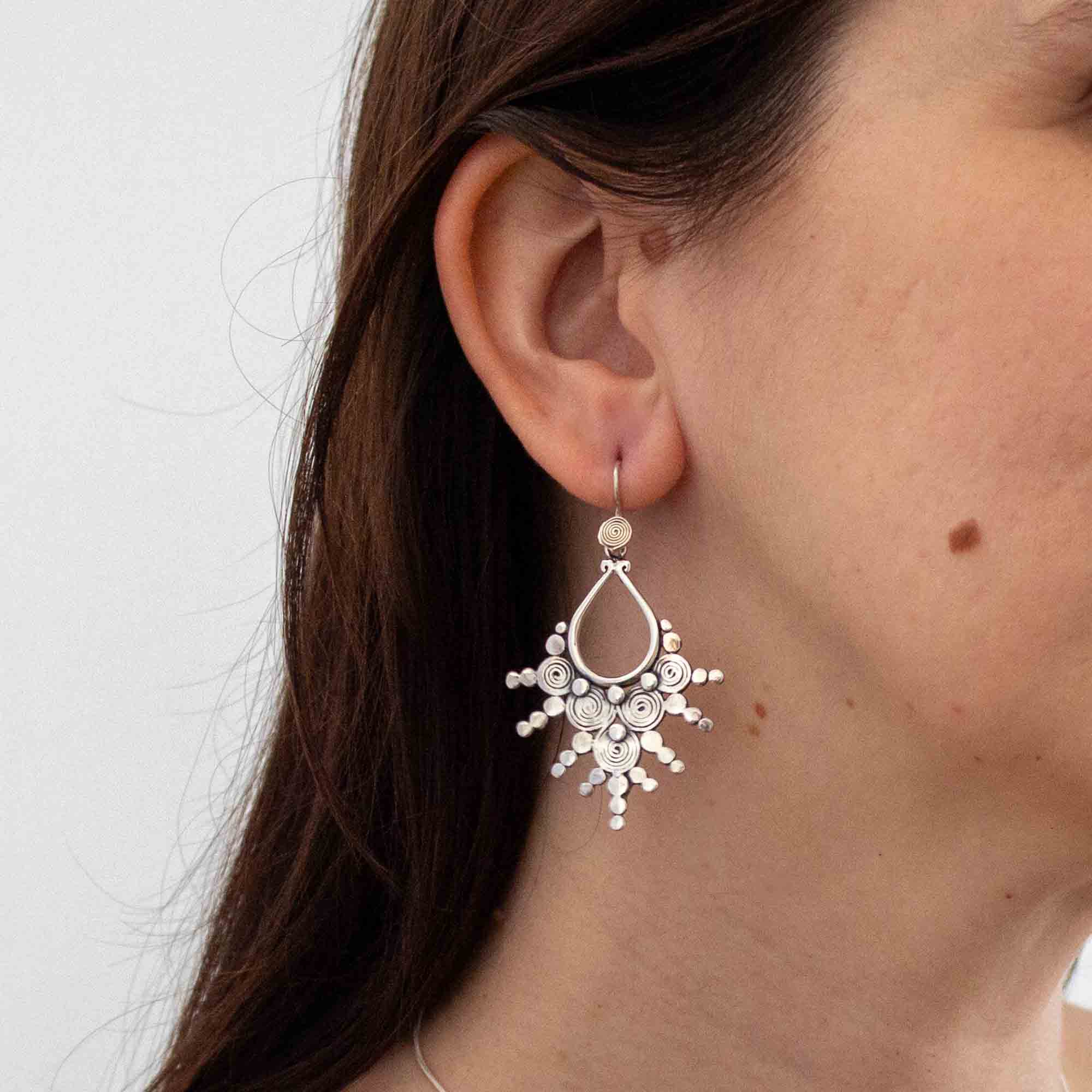 A stunning pair of sterling silver drop earrings with a teardrop centre and five spiral rays. The earrings have been oxidised to give an antique finish.