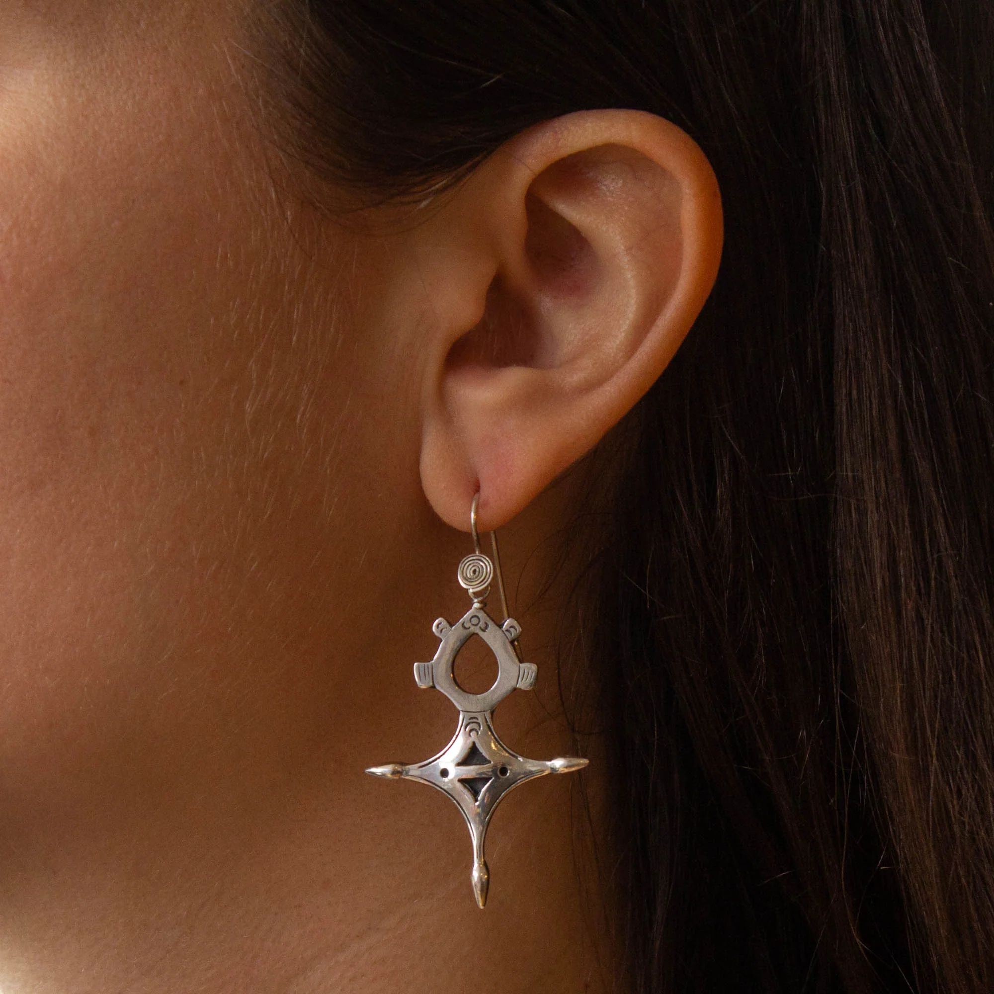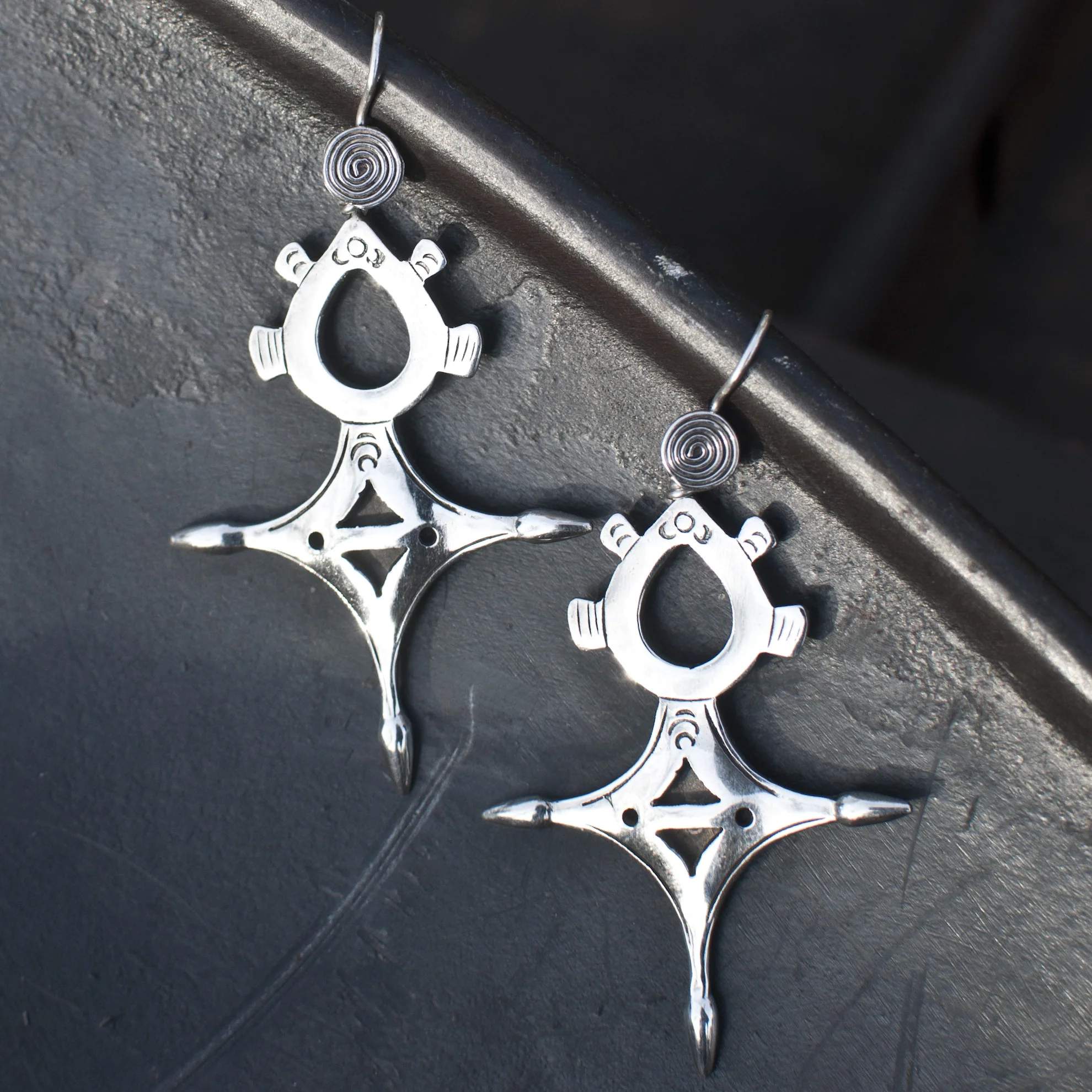 These striking sterling silver drop earrings are inspired by the ‘Tahoua’ cross pendant worn by the Tuareg people of North Africa. The earrings have been oxidised to give an antique finish.