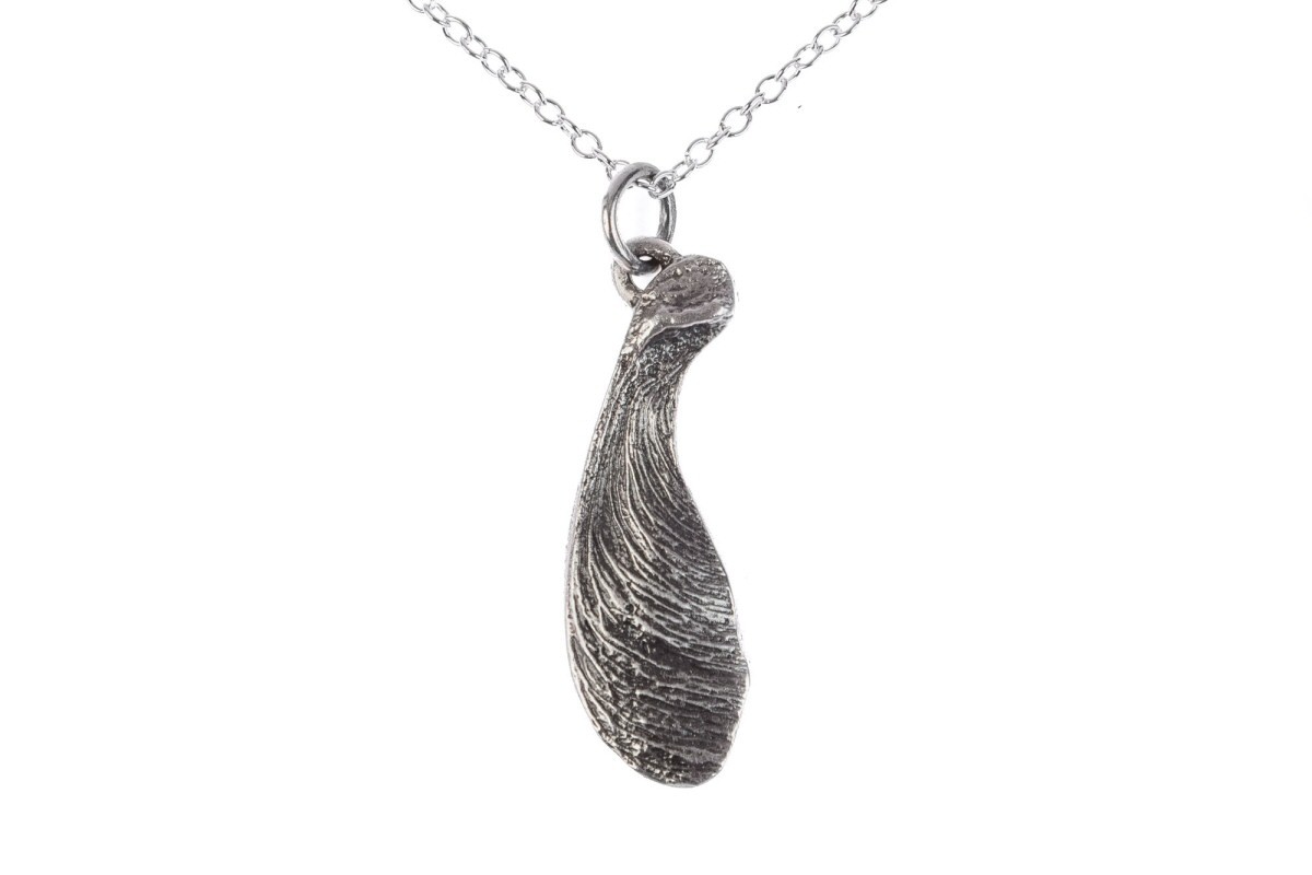 Sycamore seeds are one of natures most beautifully textured seeds, this seed has been found on a woodland floor, then and moulded to create exact replica in solid silver. The sycamore textures feature on both sides of this pendant, the finest details enhanced through darkening the silver before a final polish.