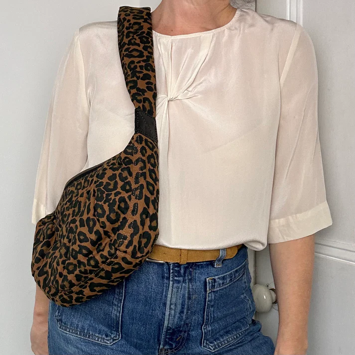 The Brixton bag. A stylish sling bag / cross body style bag in a striking leopard print, made from recycled cotton. The interior features a zipped pocket. Chose from a brown or urban olive green. Either can add a touch of stylish glam to any outfit.
