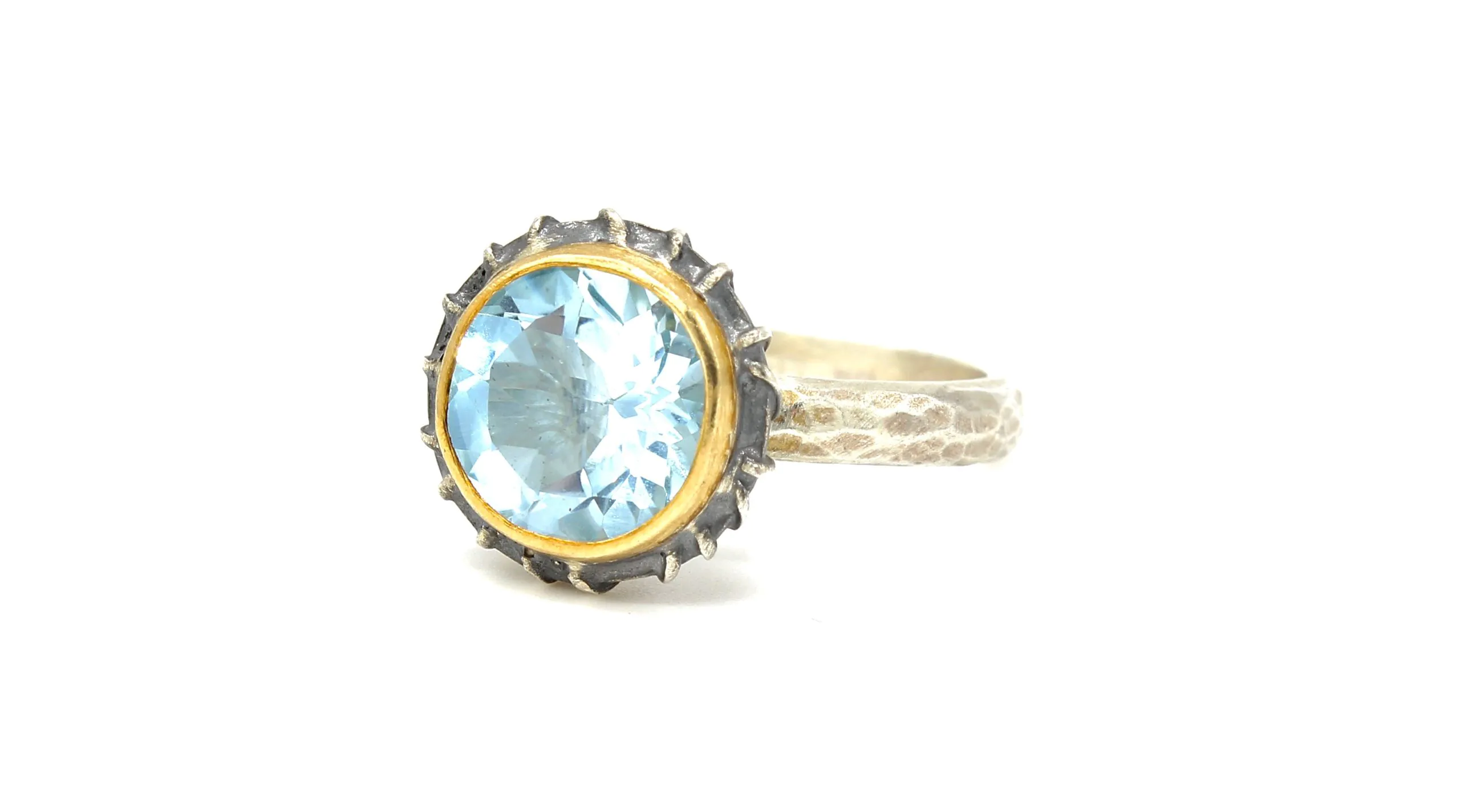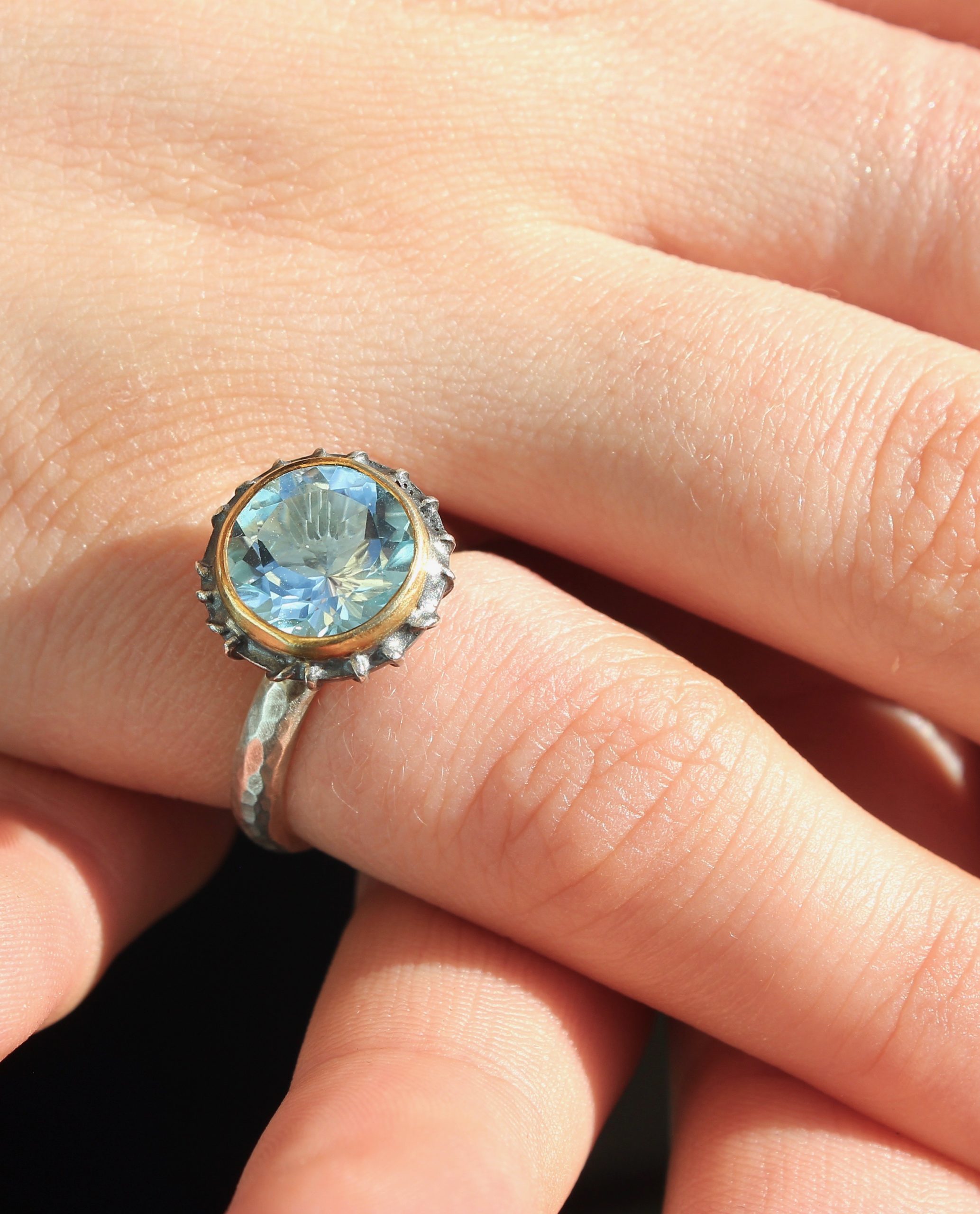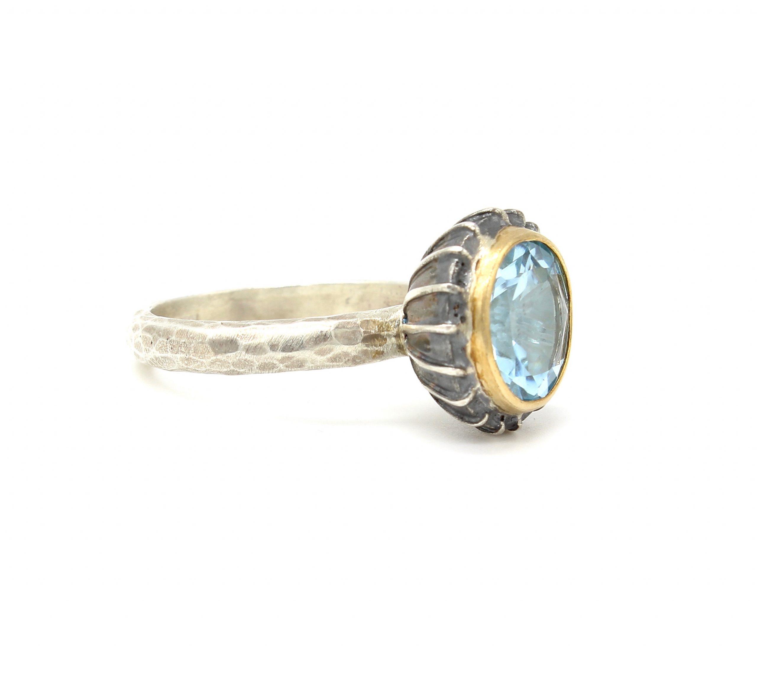 A brilliant large sky blue topaz gemstone is bezel set in 18ct gold. The gold contrasts amazingly with the surrounding oxidised sterling silver, which forms the head on top of a hammered silver ring.