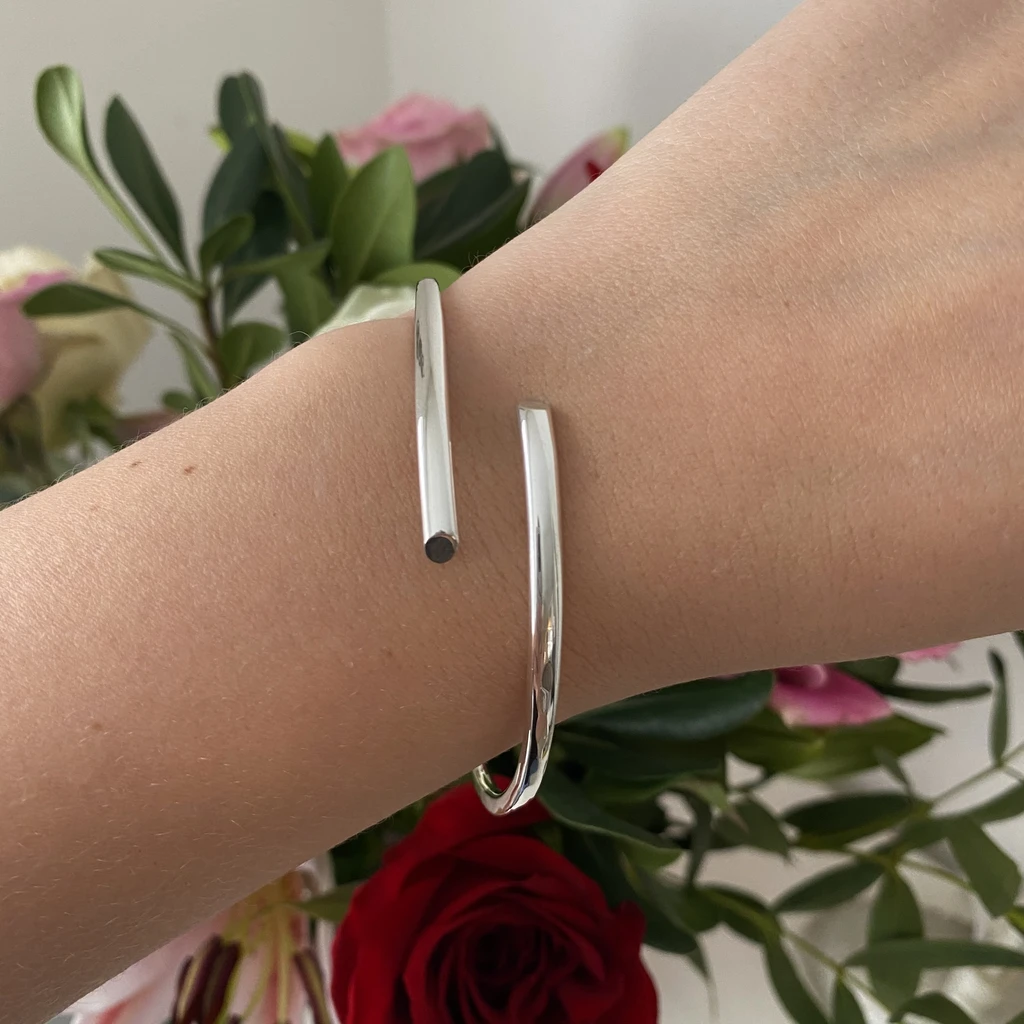 This handmade sterling silver bangle comes with a smooth, sleek finish to create a minimalistic feel with a modern, contemporary twist.