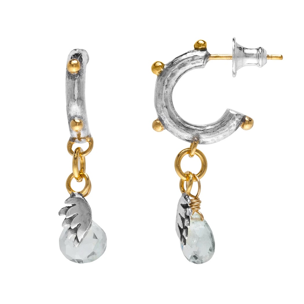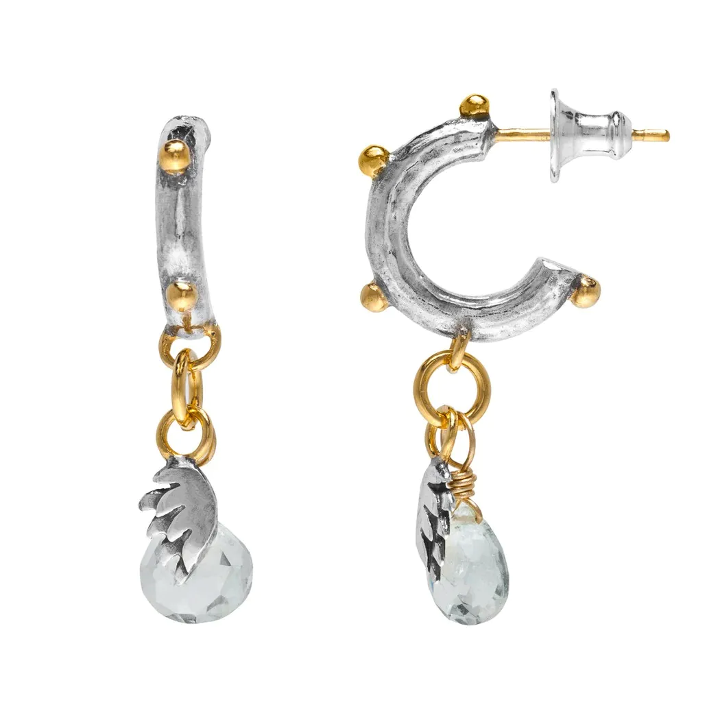 Little nobbly hoops with aquamarine briolette & tiny wing drop earrings made in silver with gold plated detail.
