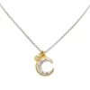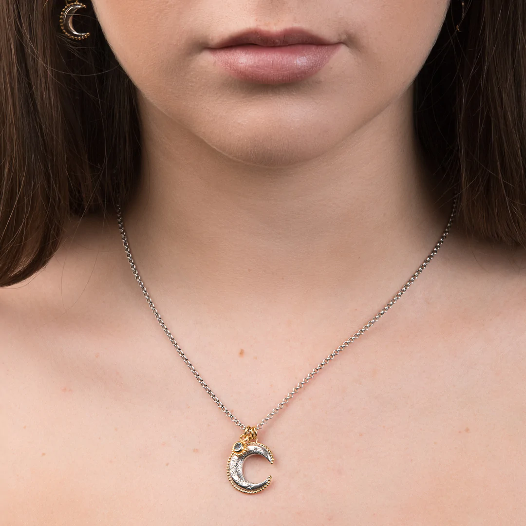 This intricately engraved large luna charm hangs from an 18″ fine round belcher chain which is 2mm wide and has a T bar clasp. Beside the moon, also loose on the chain is a set gem stone which measures 6mm in diameter overall. The stone is 3mm in diameter and the necklace pictured has an aquamarine set stone which is a stunning pale silvery blue colour.