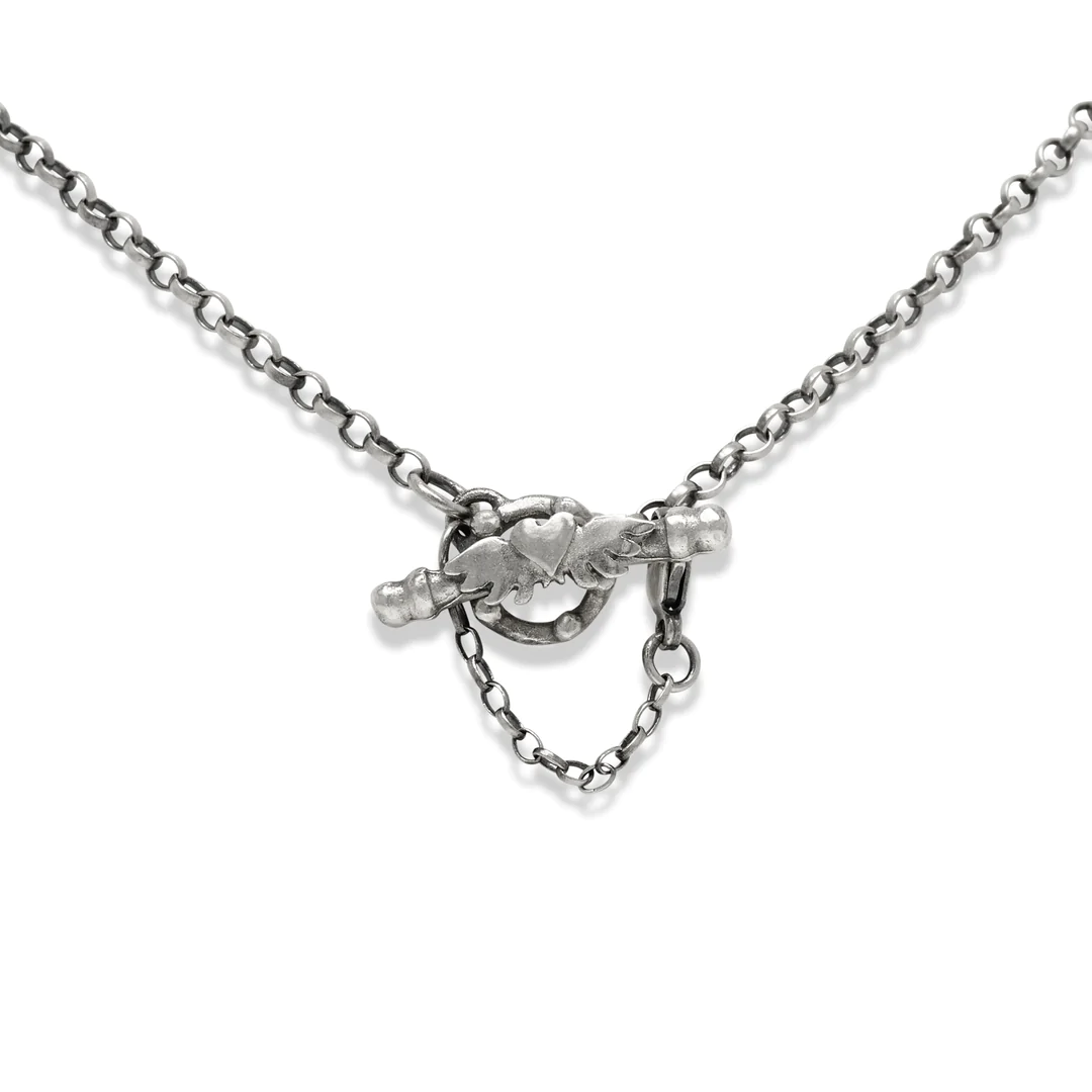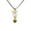Little winged hand with heart drop on a 16″ fine belcher chain with T bar clasp with winged heart detail.