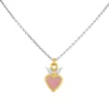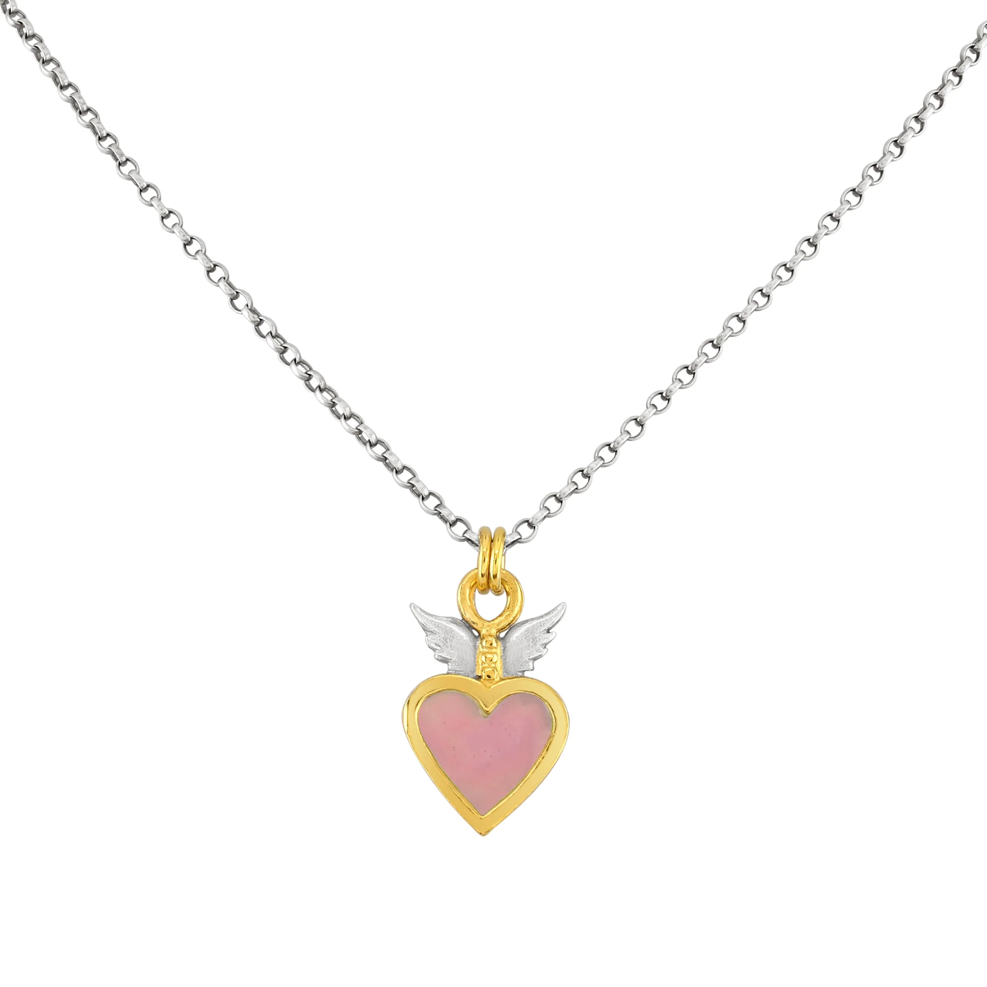 This beautiful fine chain necklace features the exquisite dusky pink “Highbury” winged heart enamel charm, made in silver with gold plated detail and kiln fired enamel. The heart looks as though it is flying with its wings fluttering high above the heart its a truly pretty piece with a difference.