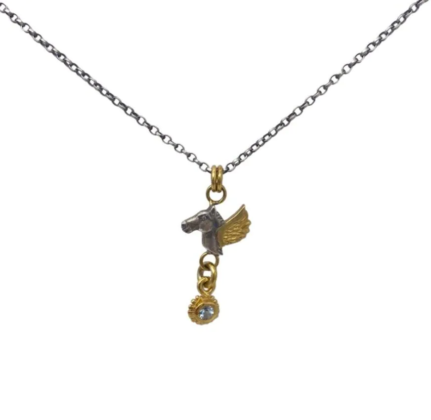 This beautiful necklace features a winged pegasus charm with a 3mm London topaz set in a delicately beaded setting hanging from the pegasus charm.  Handmade in Sophies studio in London  This necklace is silver with gold plated detailing. It would be a fabulous piece to own and start a new collection of this designers work.