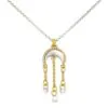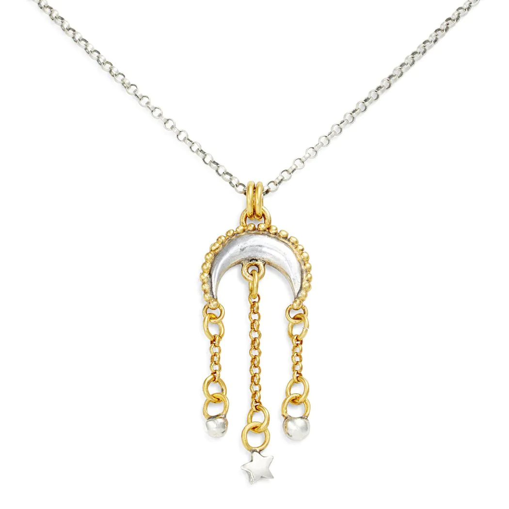 Beautiful necklace that features a luna charm with dainty silver drops and a central silver star drop. Made in this designers studio in London, it is made from sterling silver with gold detailing and features an extra-fine belcher chain that attaches with a carabiner clasp and heart catch. This stunning piece is sure to make an impact and complement any outfit.  Treat yourself or buy as a gift for a loved one, we don’t think you will be disappointed.