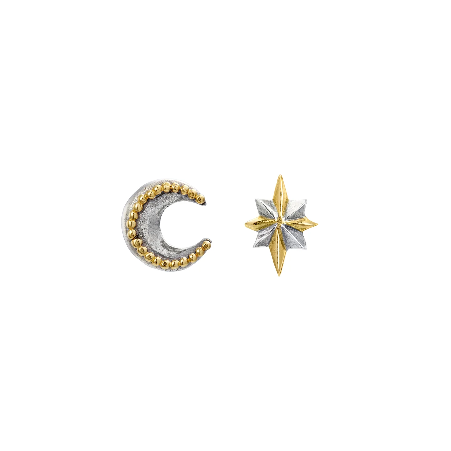 This pair of mix- matched stud earrings features the little 8 pointed north star and the mini moon and are made in sterling silver with gold plated detail.
