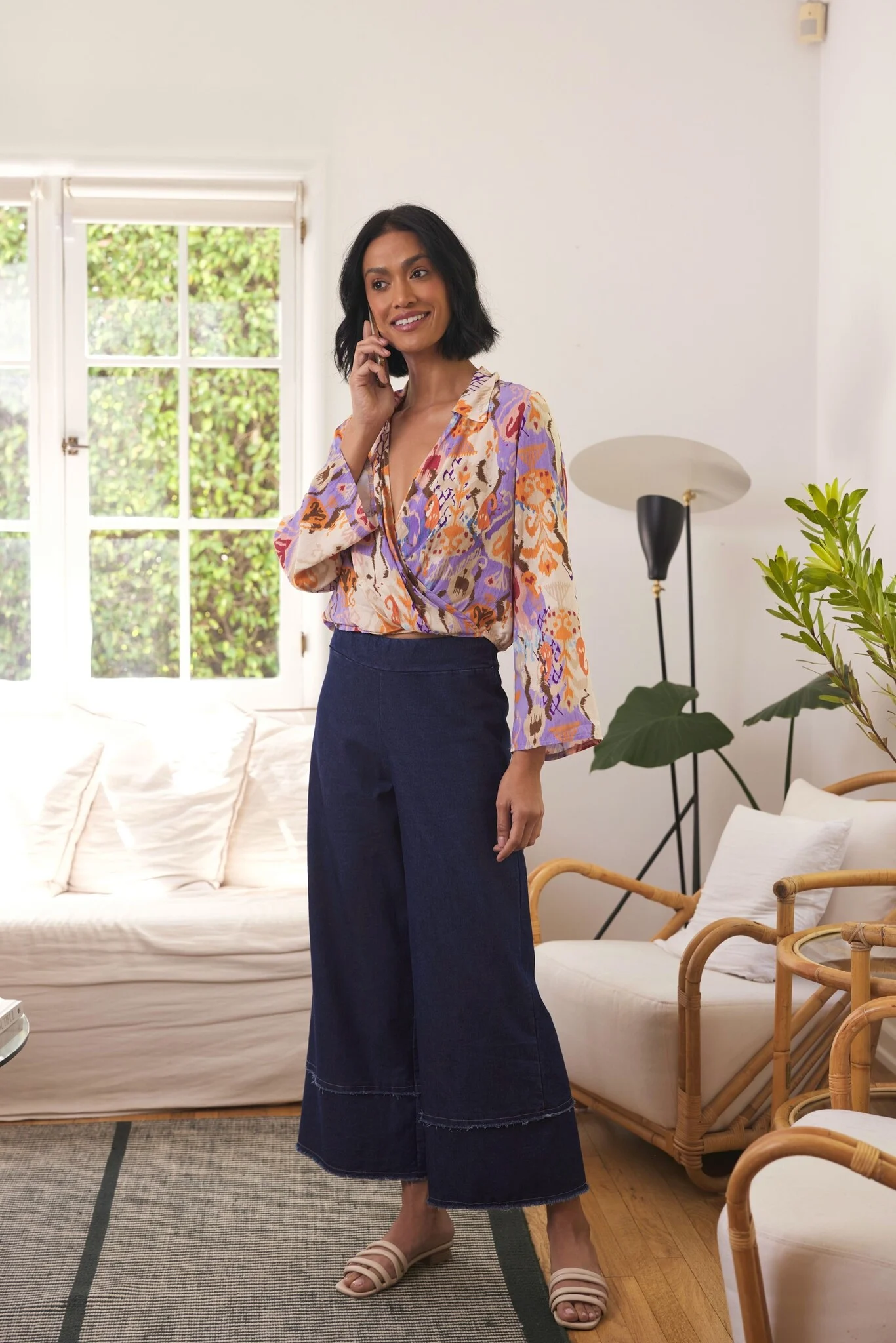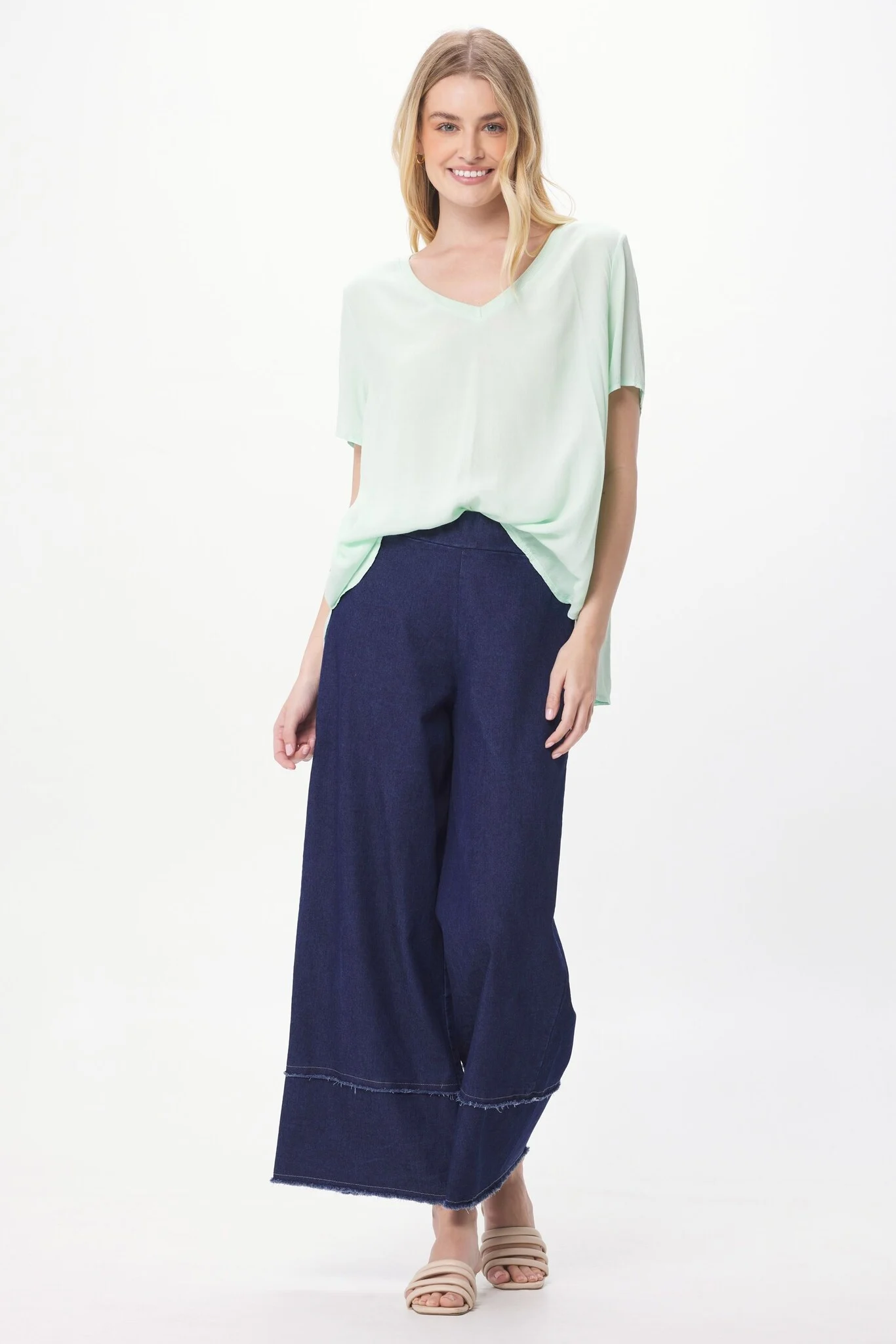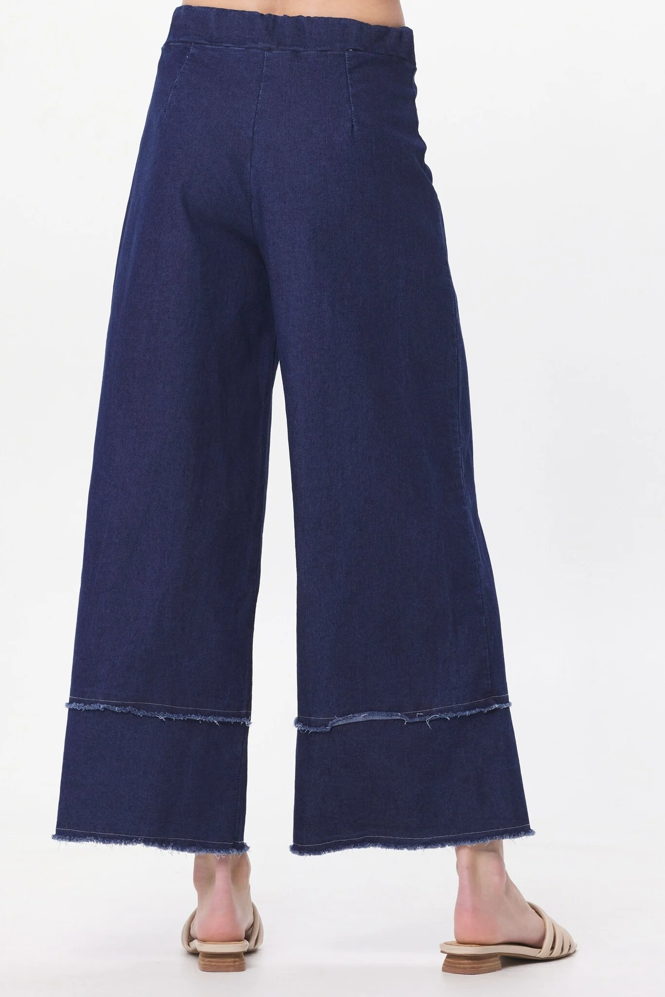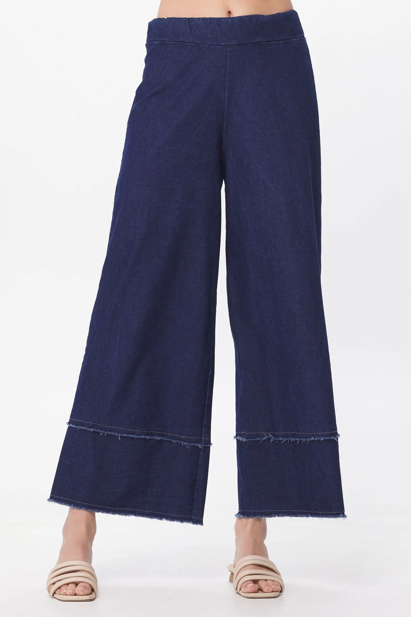 Pull on these palazzo trousers in a soft, lightweight denim fabric with fringing detail on the ankle.