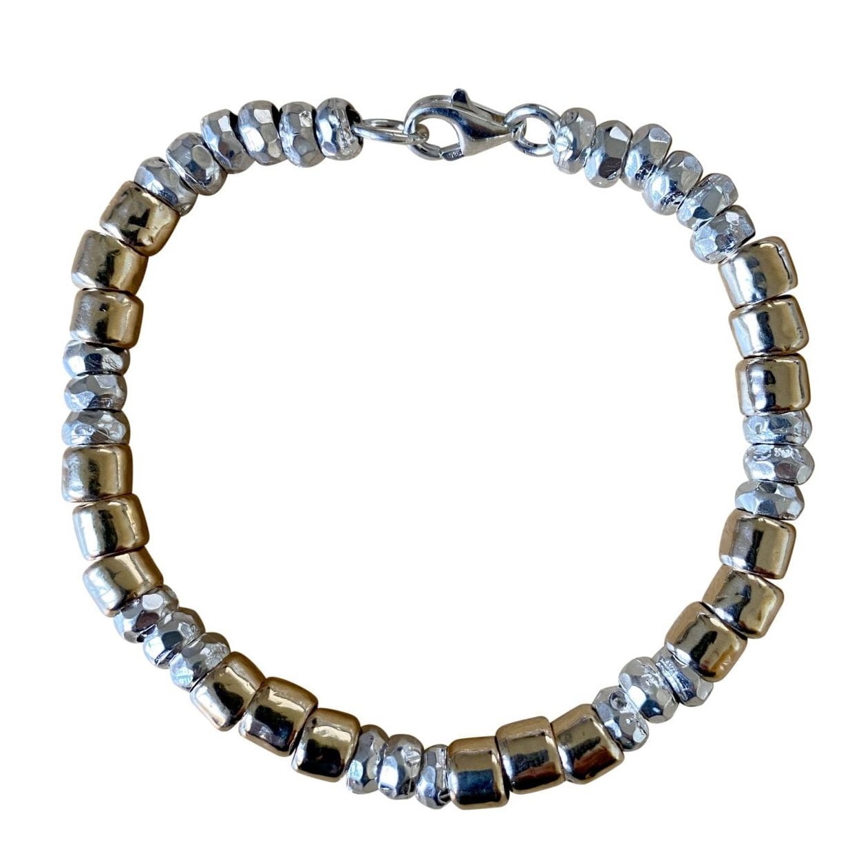 An eloquent mixed metals bracelet featuring 14ct rolled gold and hammered sterling silver beads. A piece sure to add some luxe to your everyday look.