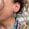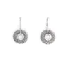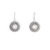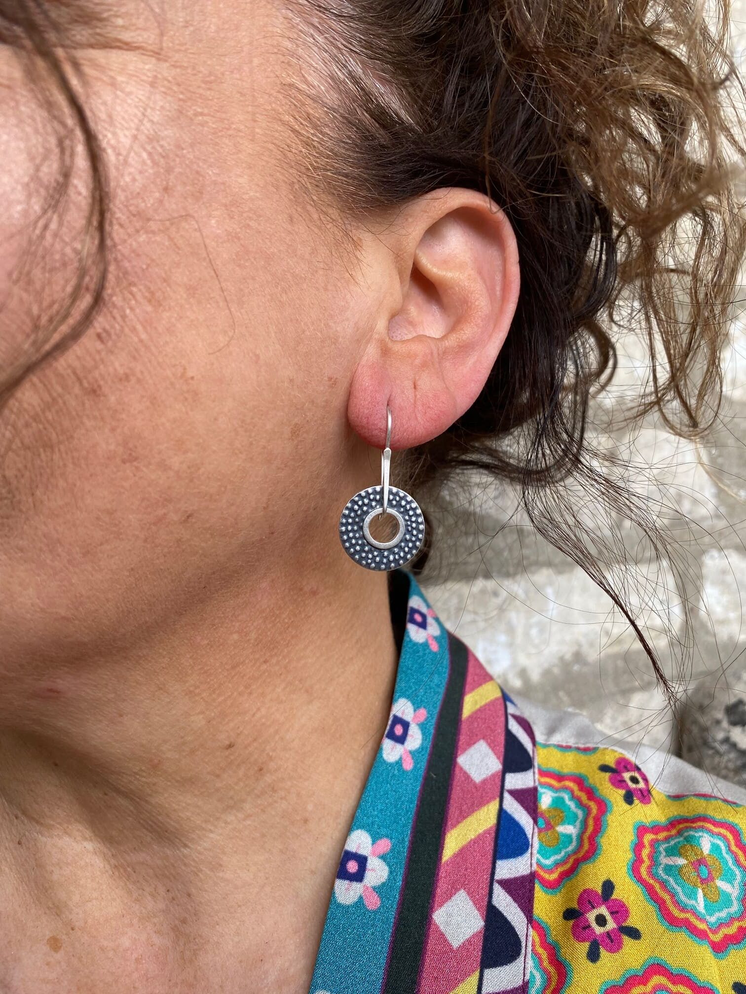Textured oxidised sterling silver discs freely hanging on silver wire hooks.