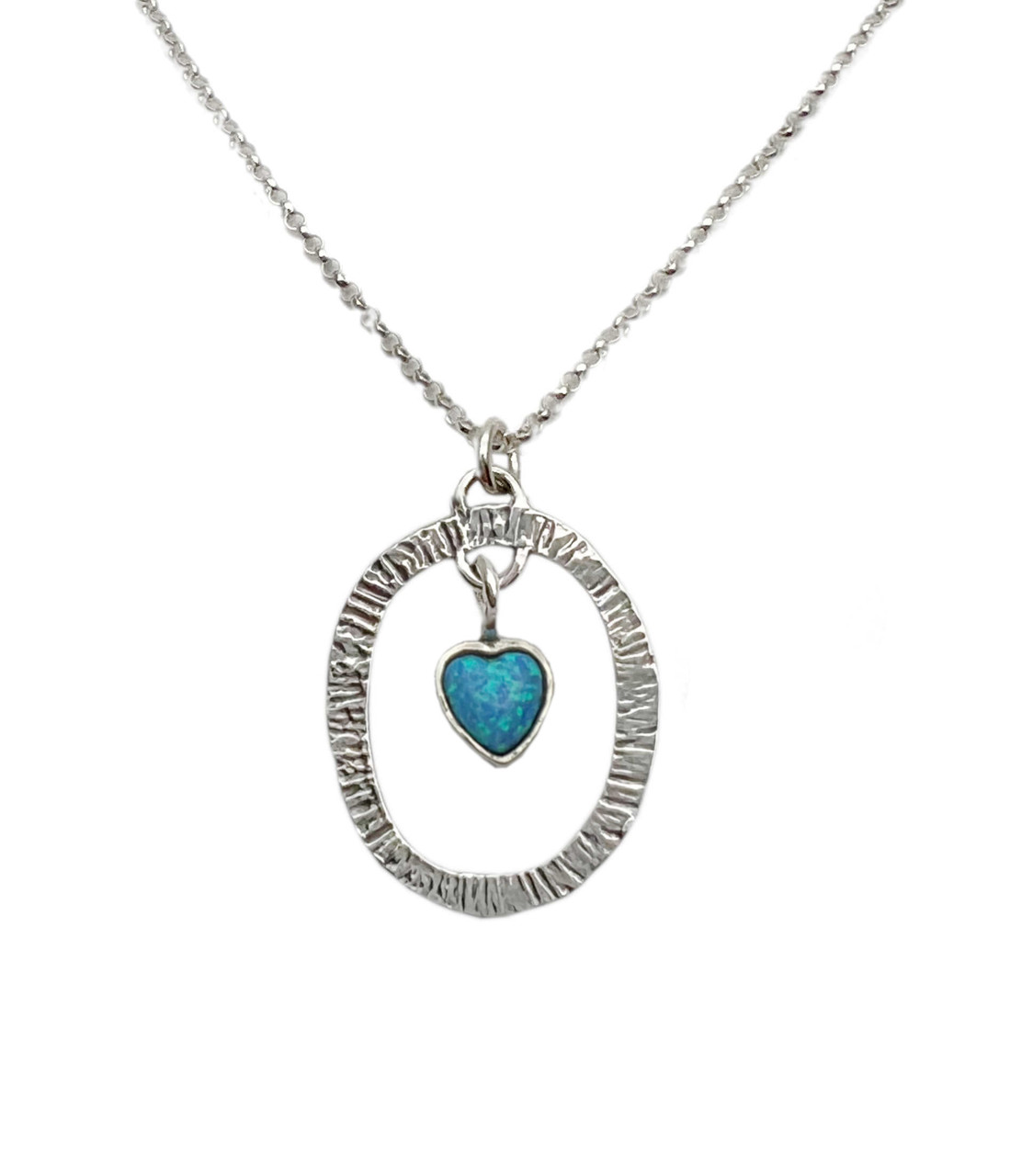 Sterling silver texture pendant with a hanging opalite heart on a smooth ____ chain.