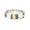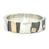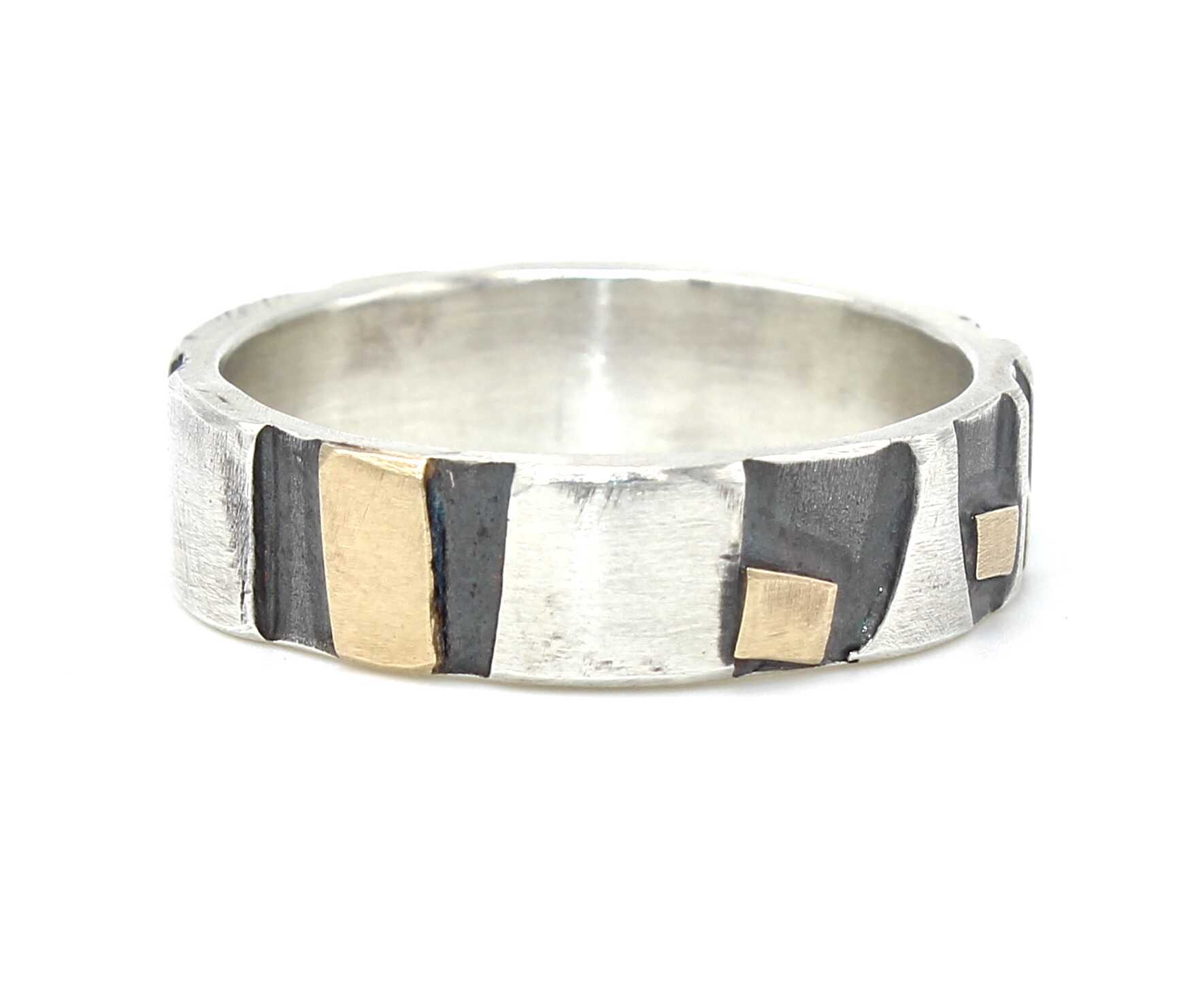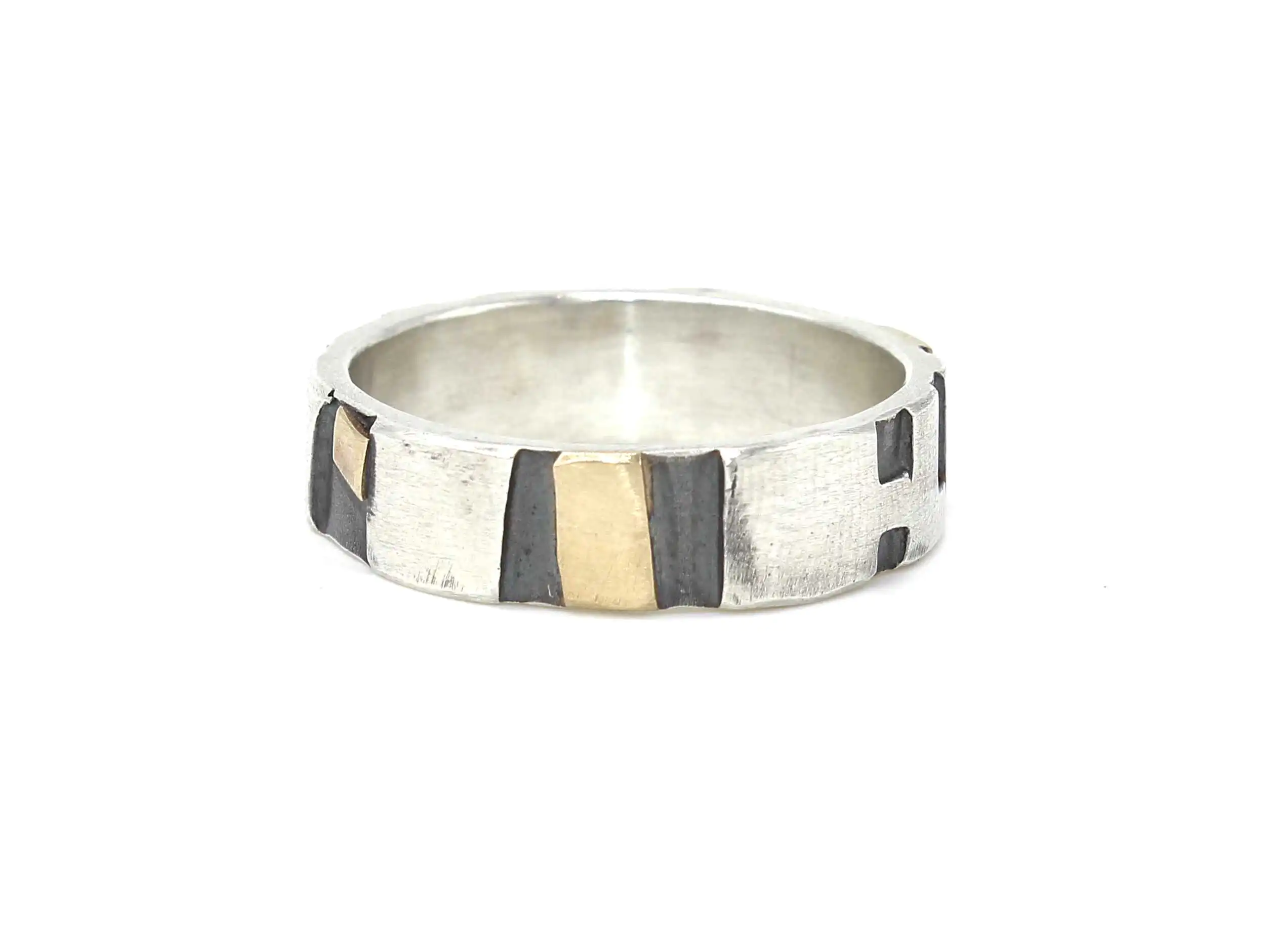 A unique ring, patterned with stripes and shapes of plain silver, oxidised sterling silver and 18ct solid gold. Each ring is individually made, two won’t be the exact same.
