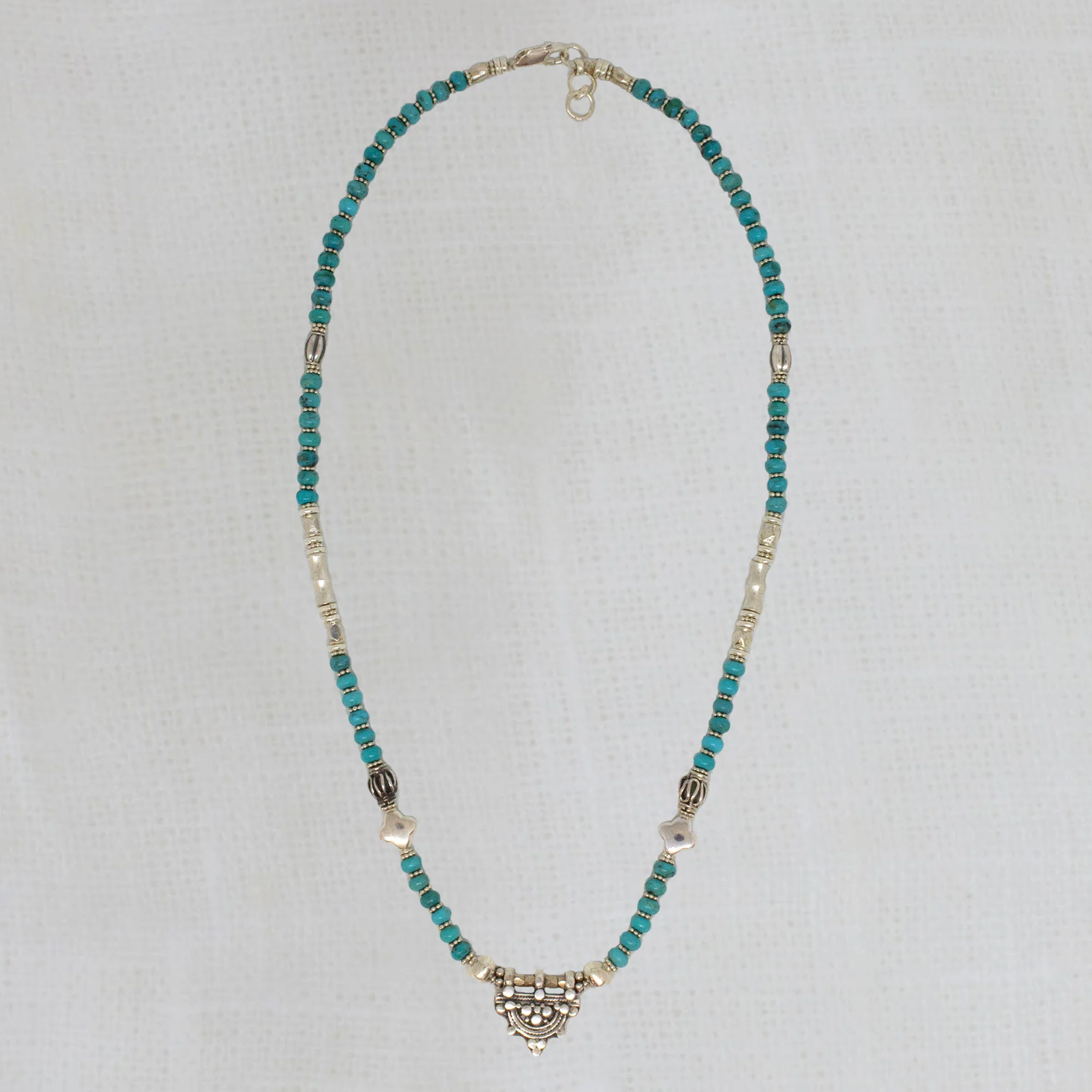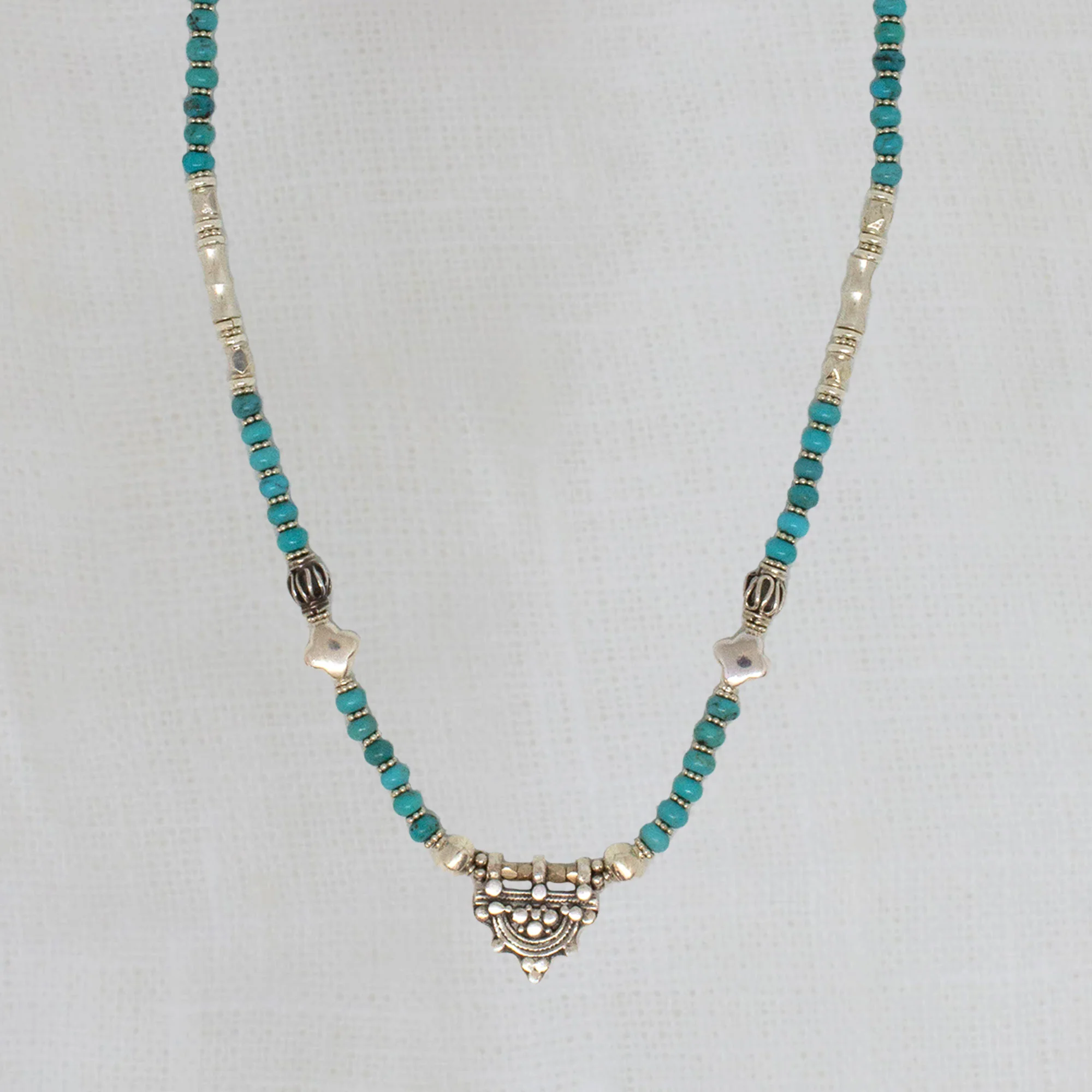 Natural Gemstone and Sterling Silver ‘Telsum’ Necklace. A striking necklace with semi-precious beads – choose from Lapis Lazuli or Turquoise – and a handmade sterling silver central pendant inspired by a tribal design from Ethiopia.
