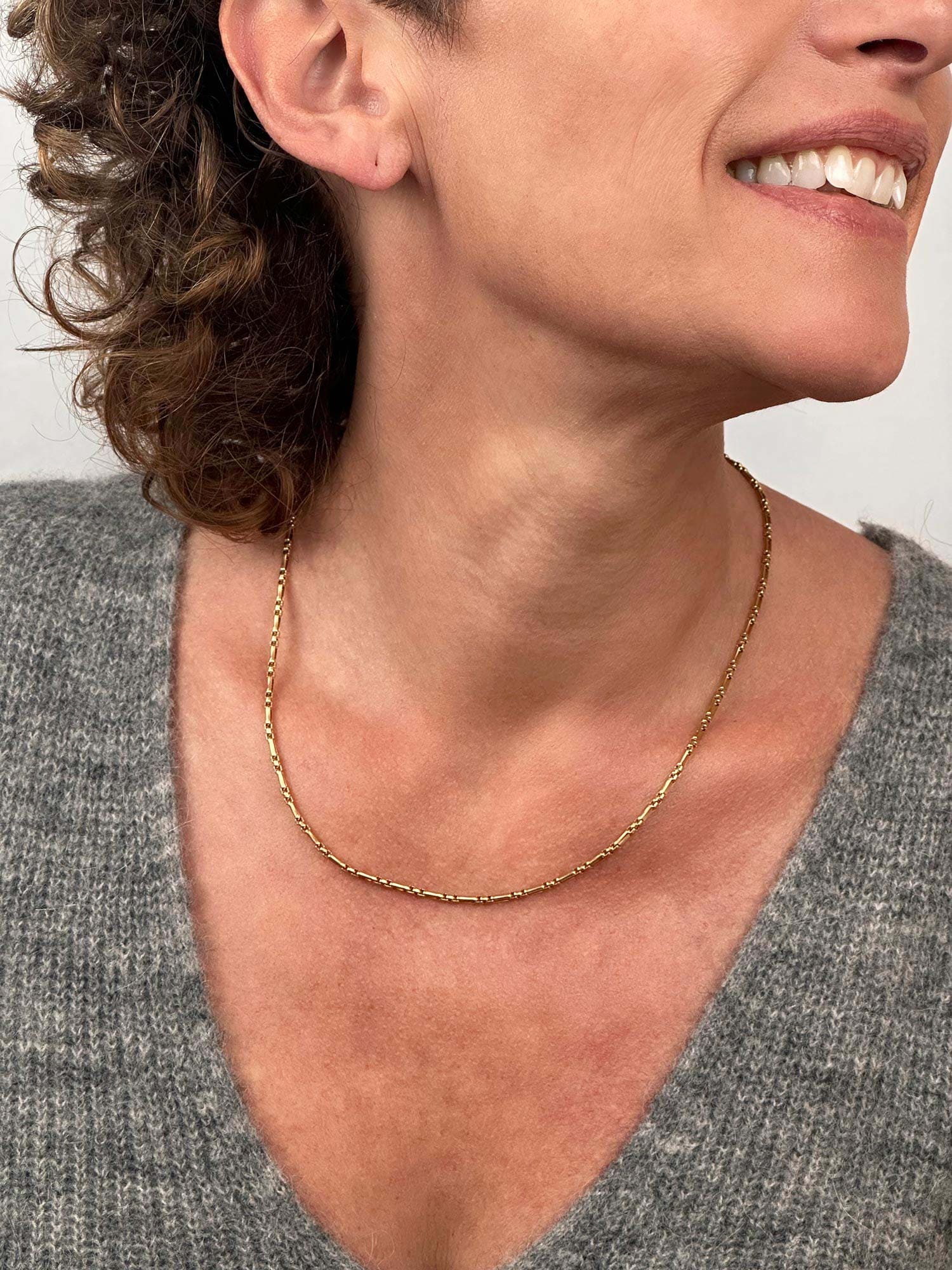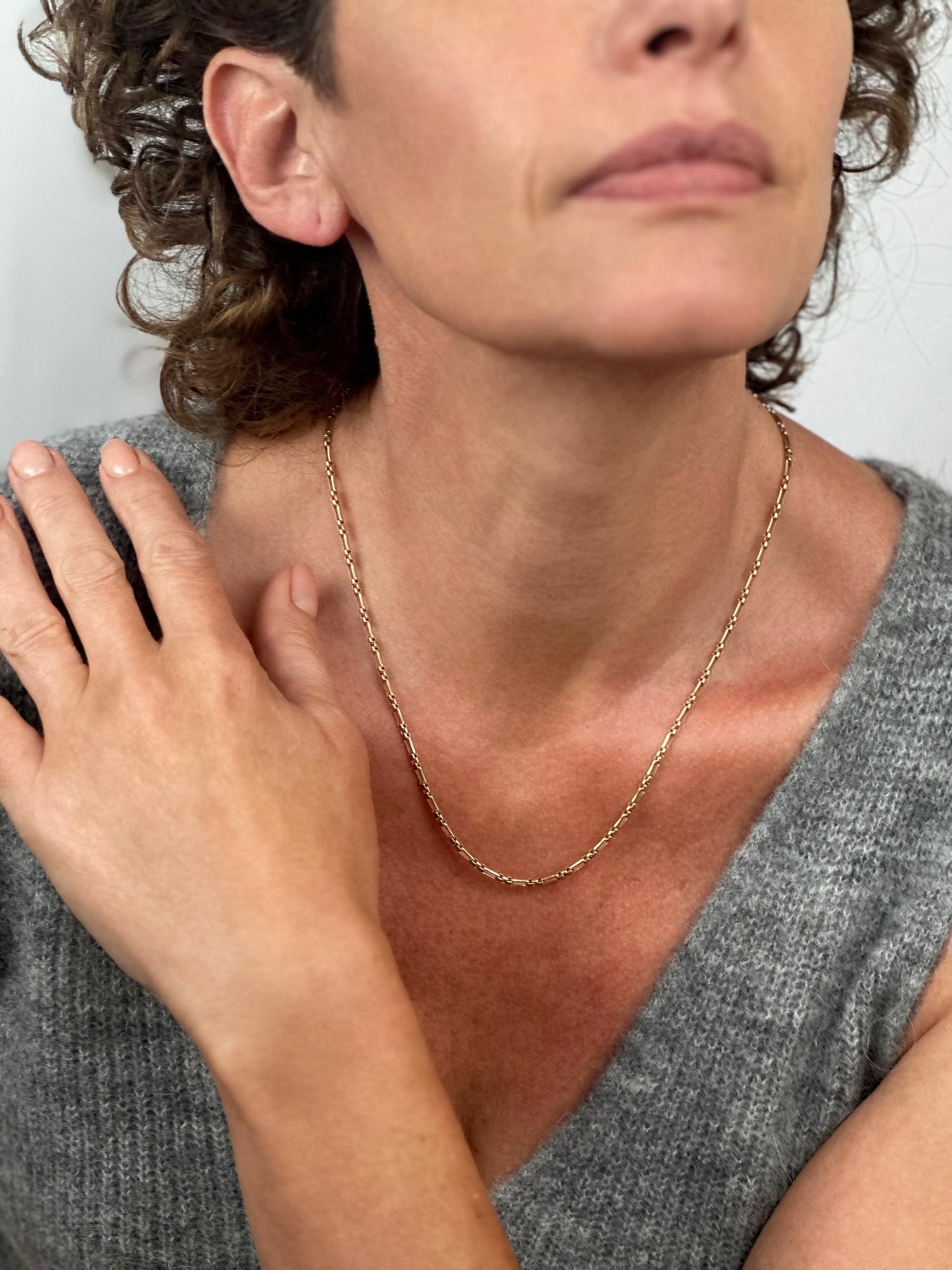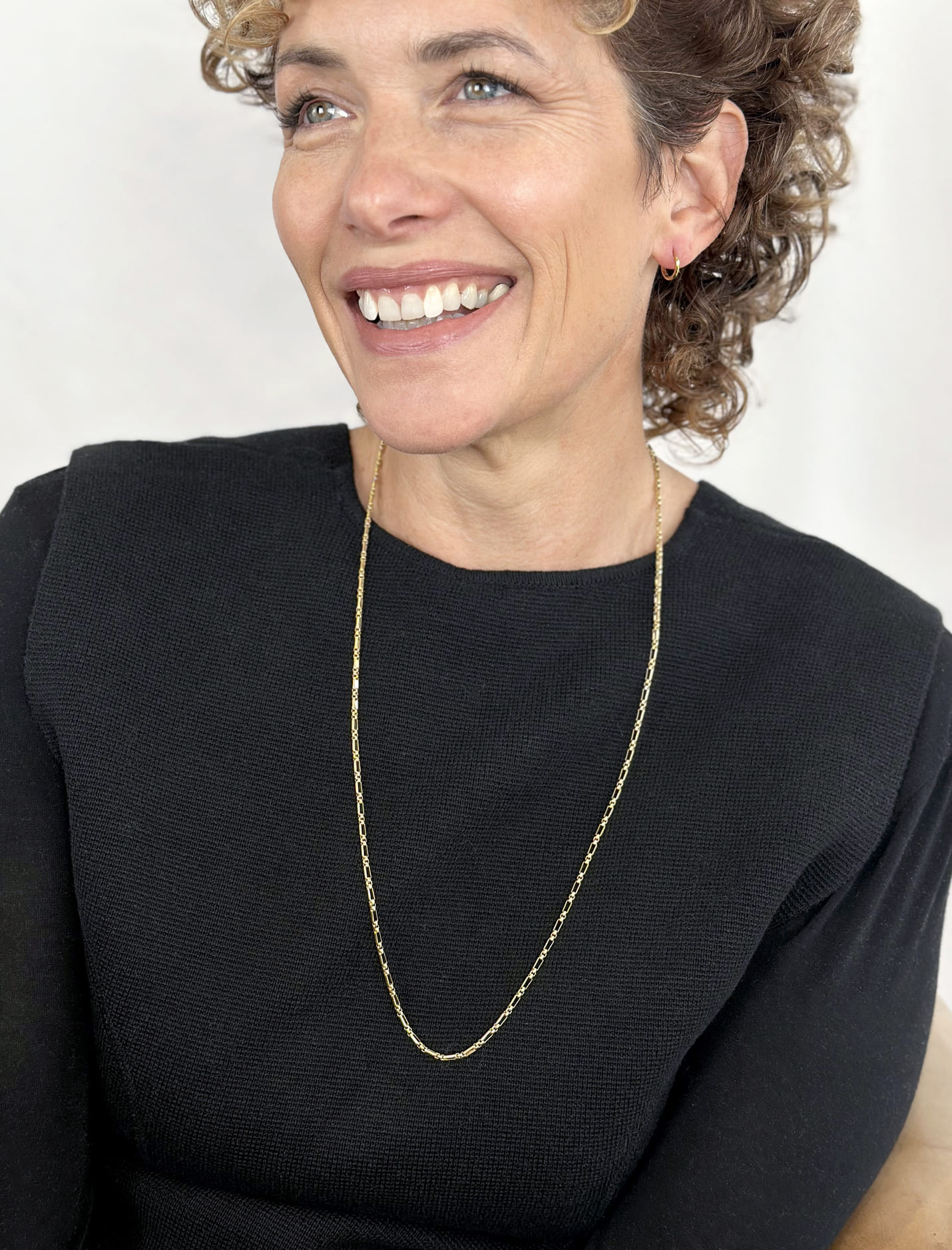 Striking and structured, the Bar Link Necklace features polished gold bars connected by delicate links for a look that’s both modern and timeless. Its clean lines and subtle shine make it perfect for elevating everyday outfits—effortless, elegant, and just a little bit edgy.