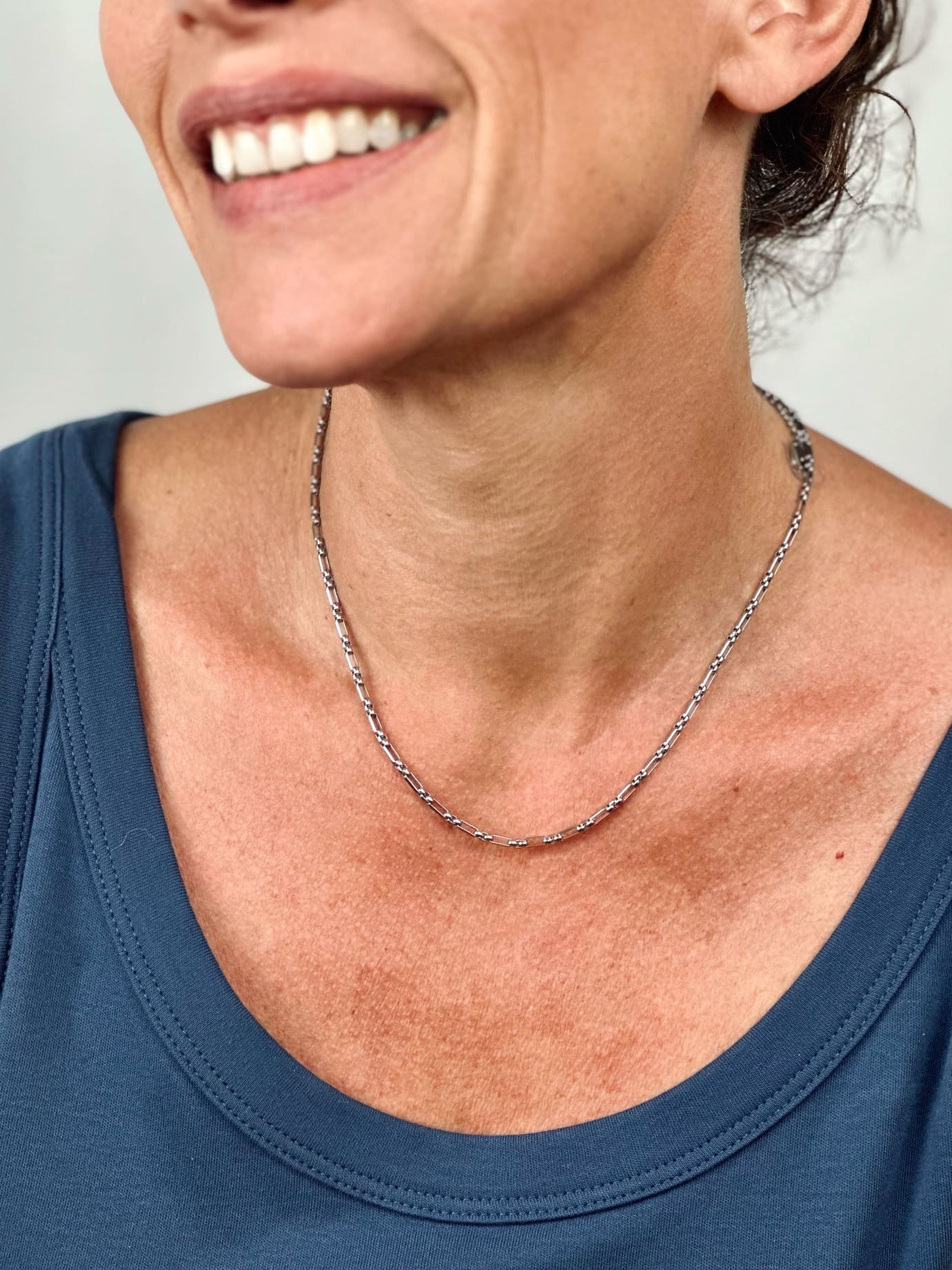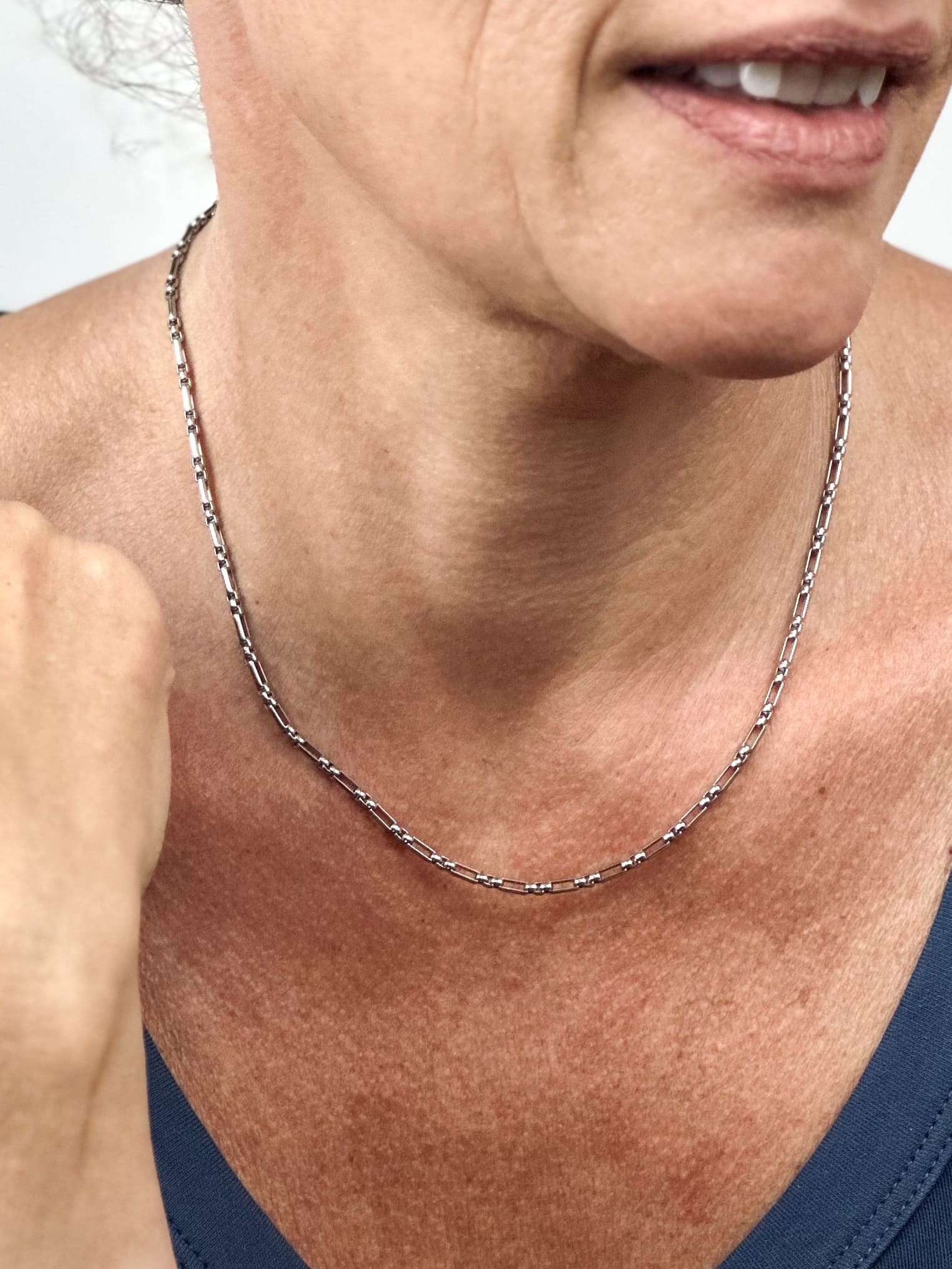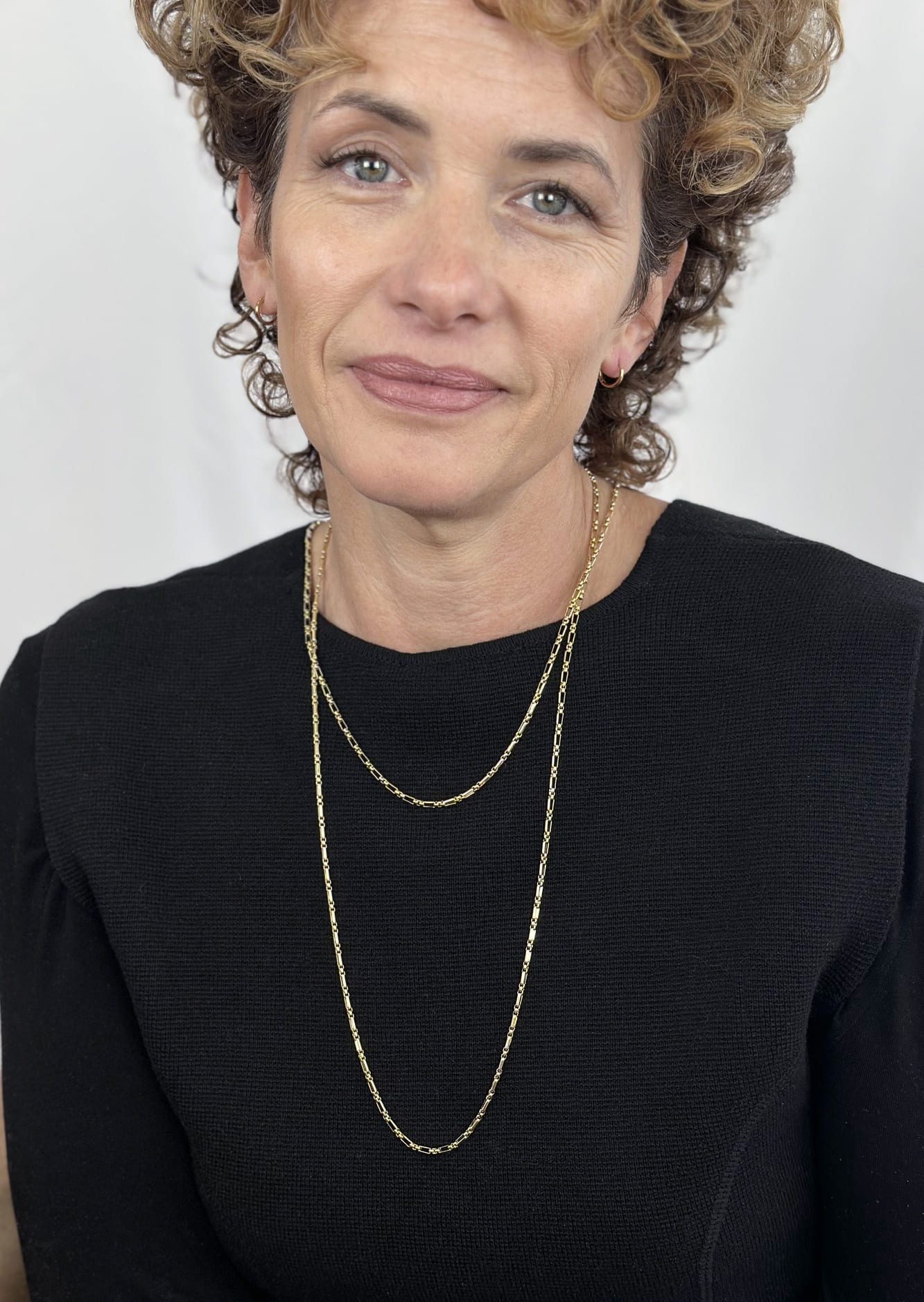 Striking and structured, the Bar Link Necklace features polished gold bars connected by delicate links for a look that’s both modern and timeless. Its clean lines and subtle shine make it perfect for elevating everyday outfits—effortless, elegant, and just a little bit edgy.