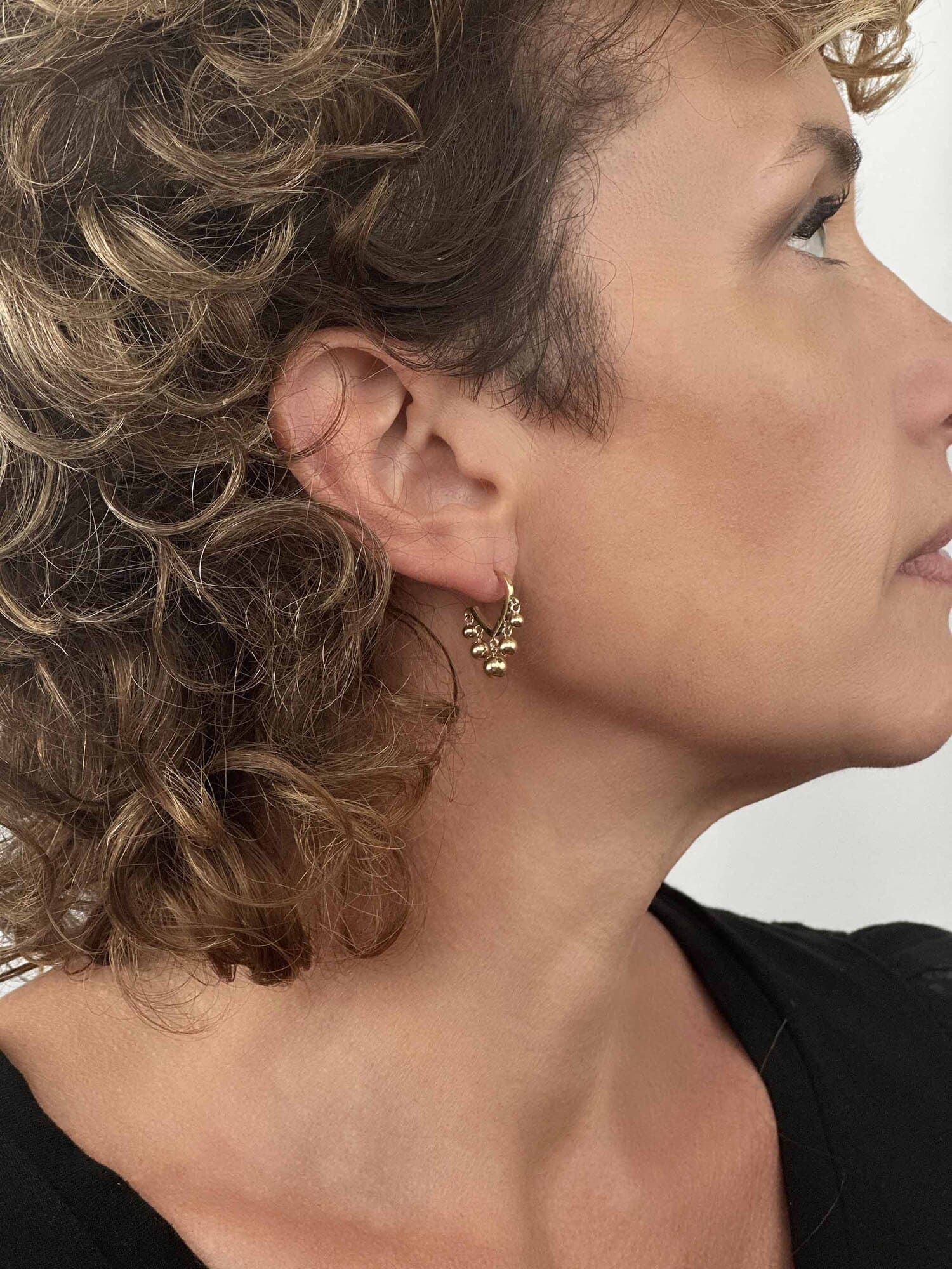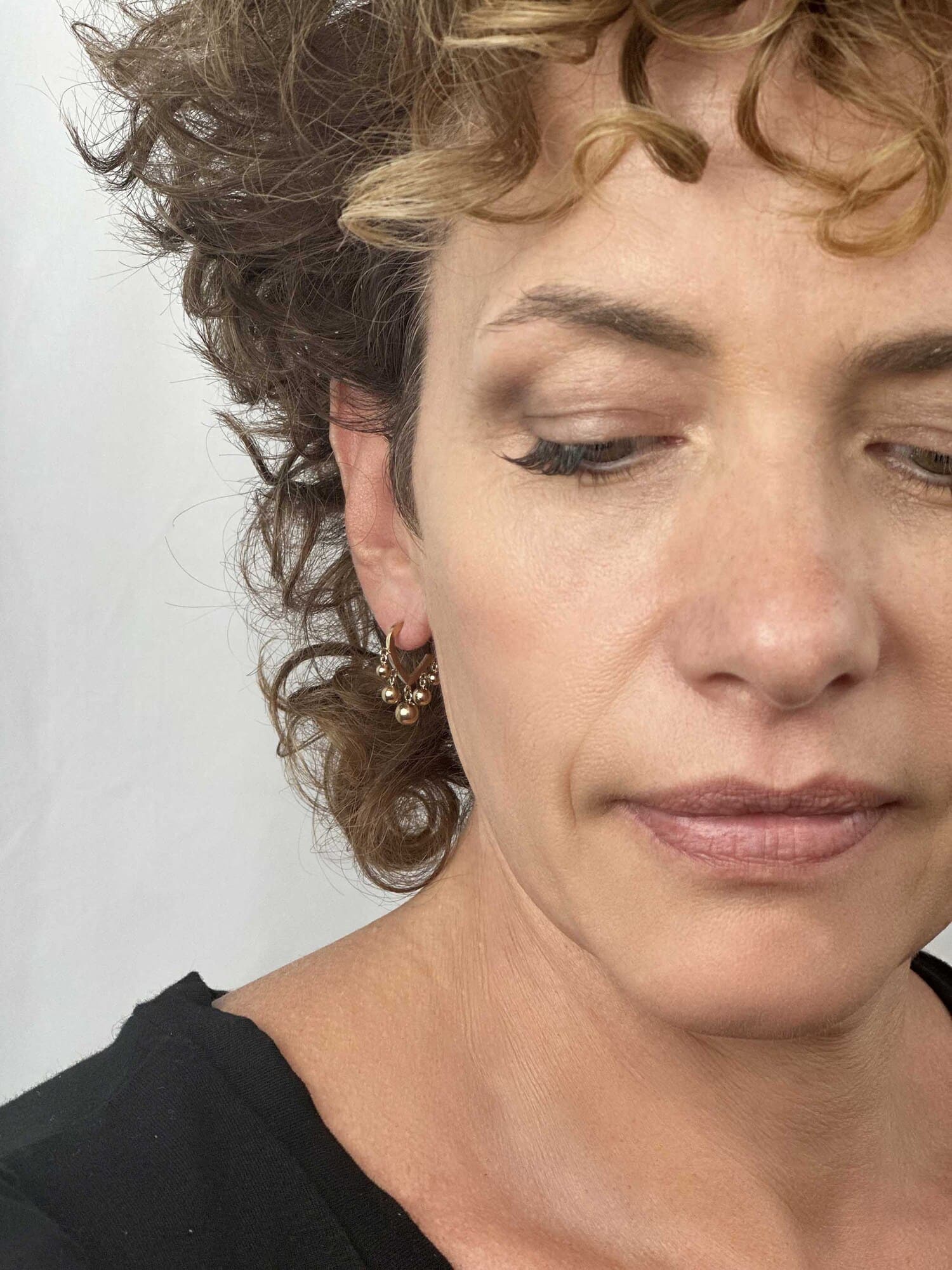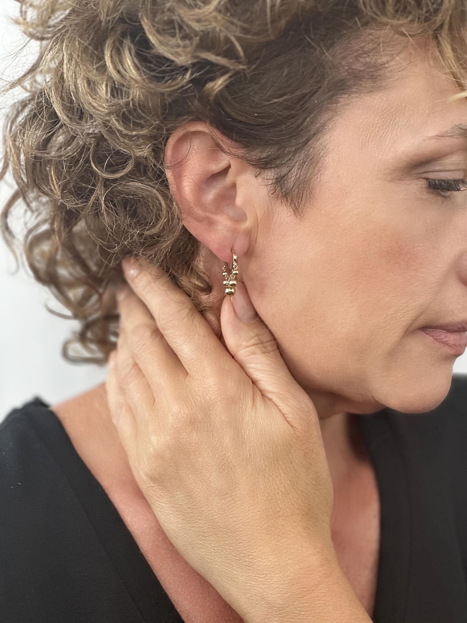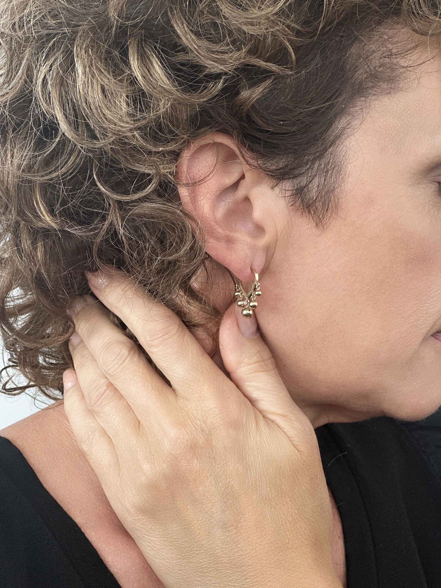 Full of movement and modern charm, the Cascade Hoops feature a sculptural V-shaped base with a playful fringe of golden drops. Light-catching and full of personality, they bring rhythm and elegance to any outfit. For days when you want your jewellery to dance with you.