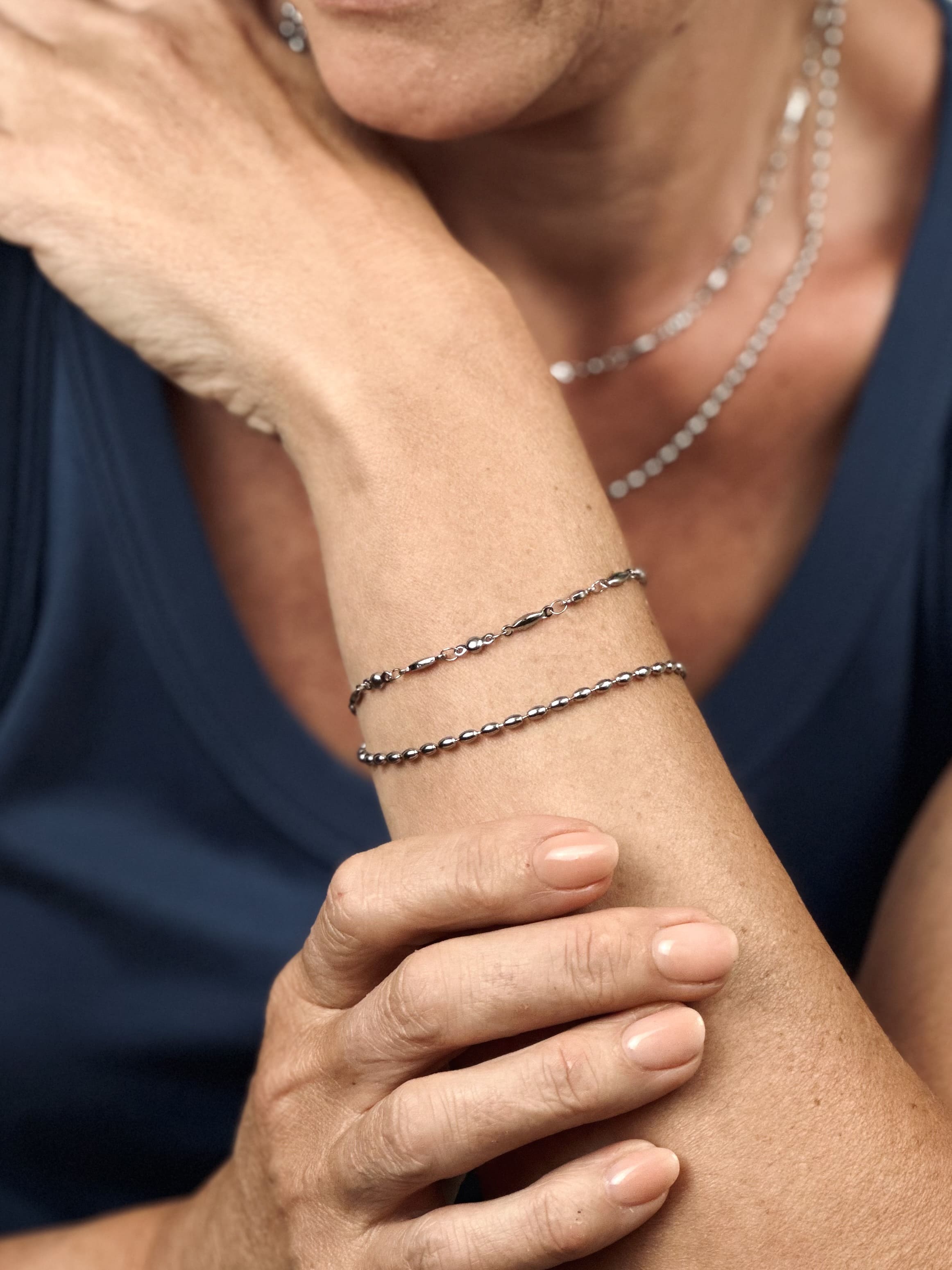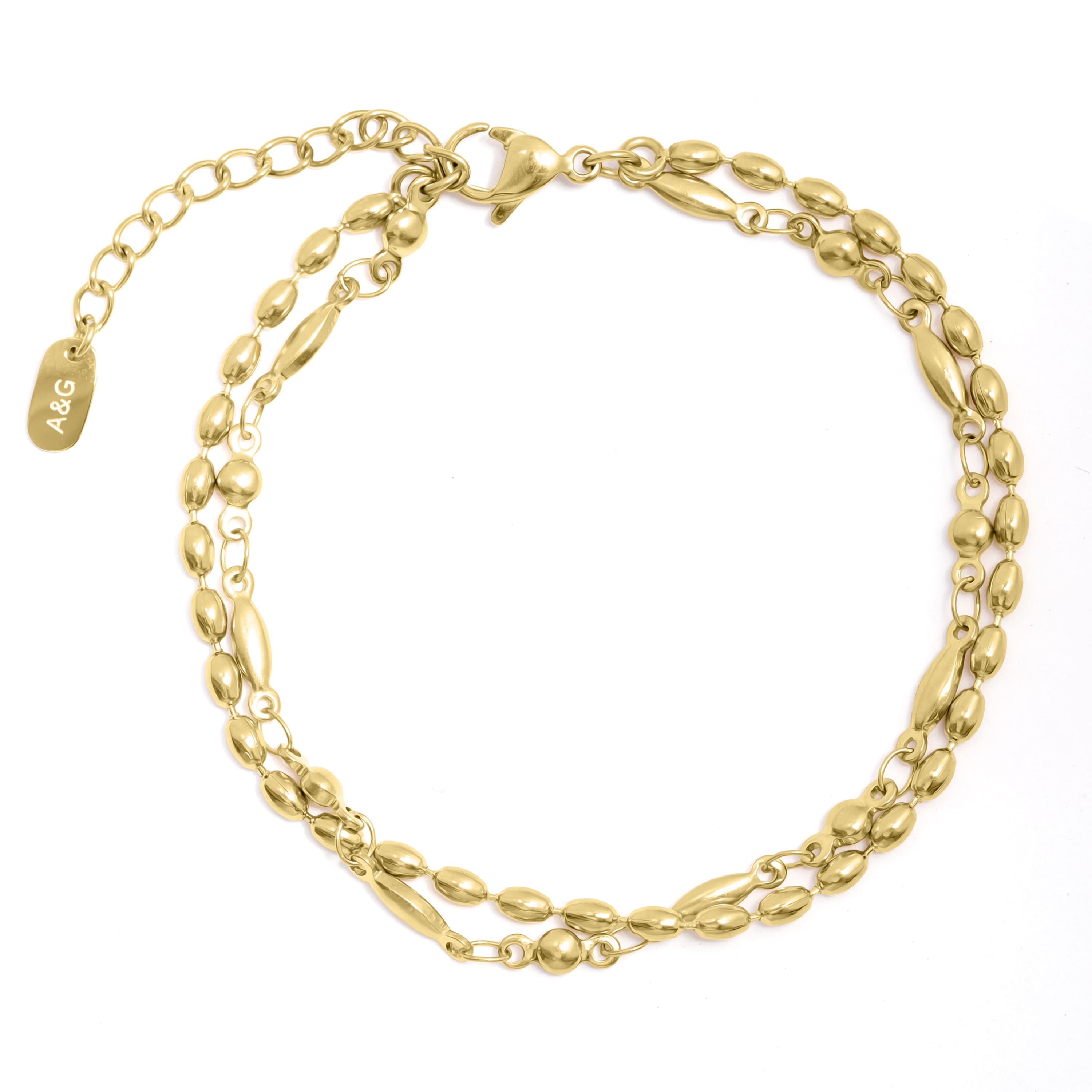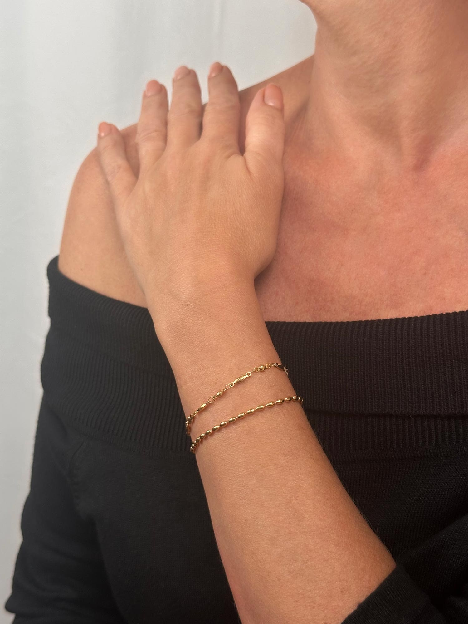 Twice the charm in one easy piece—the Double Beaded Bracelet features two delicate beaded chains joined together for a ready-made layered look. With its soft, golden shine and elegant detail, it’s perfect for adding polish without the fuss. Effortless, timeless, and beautifully balanced.