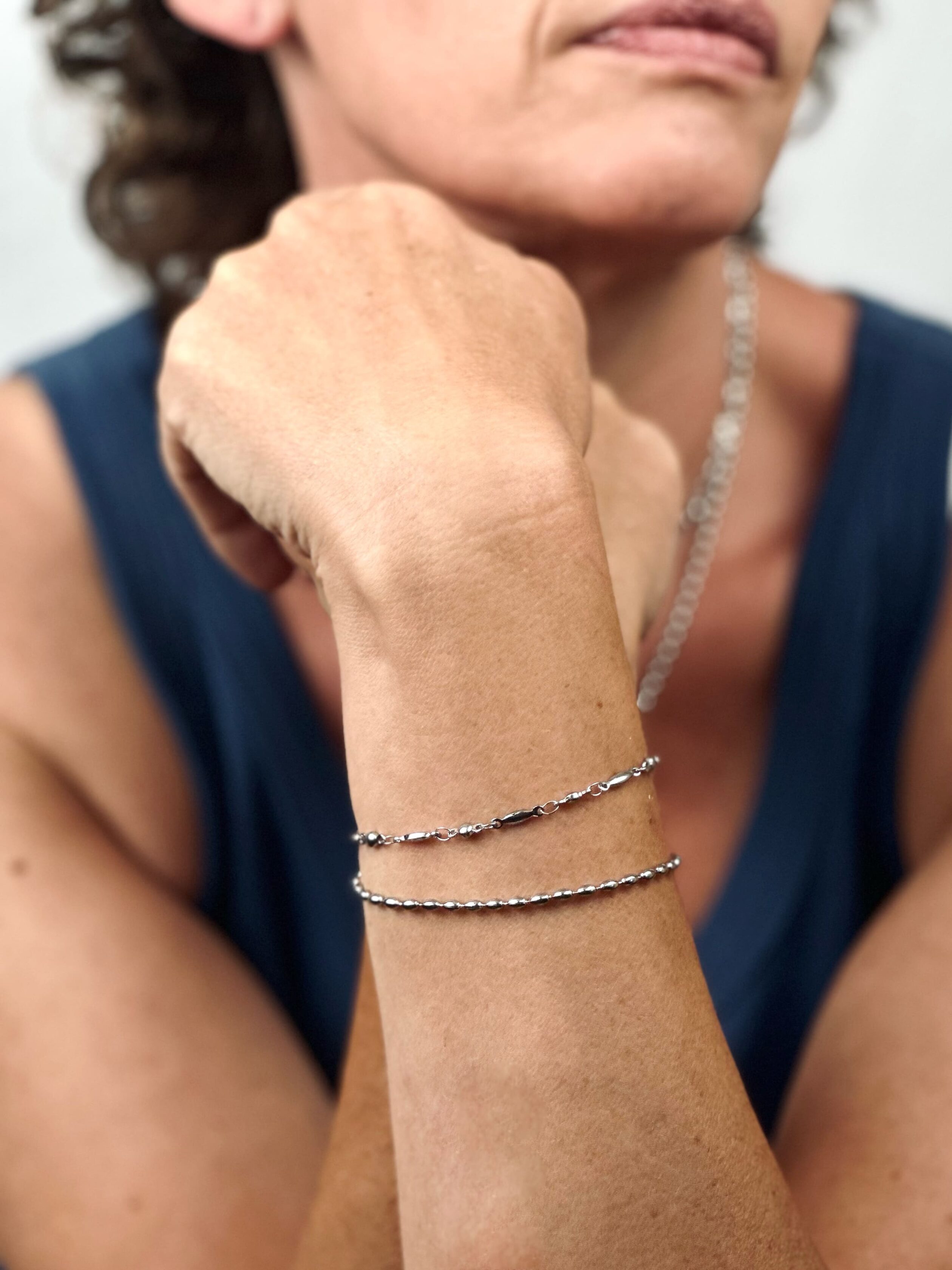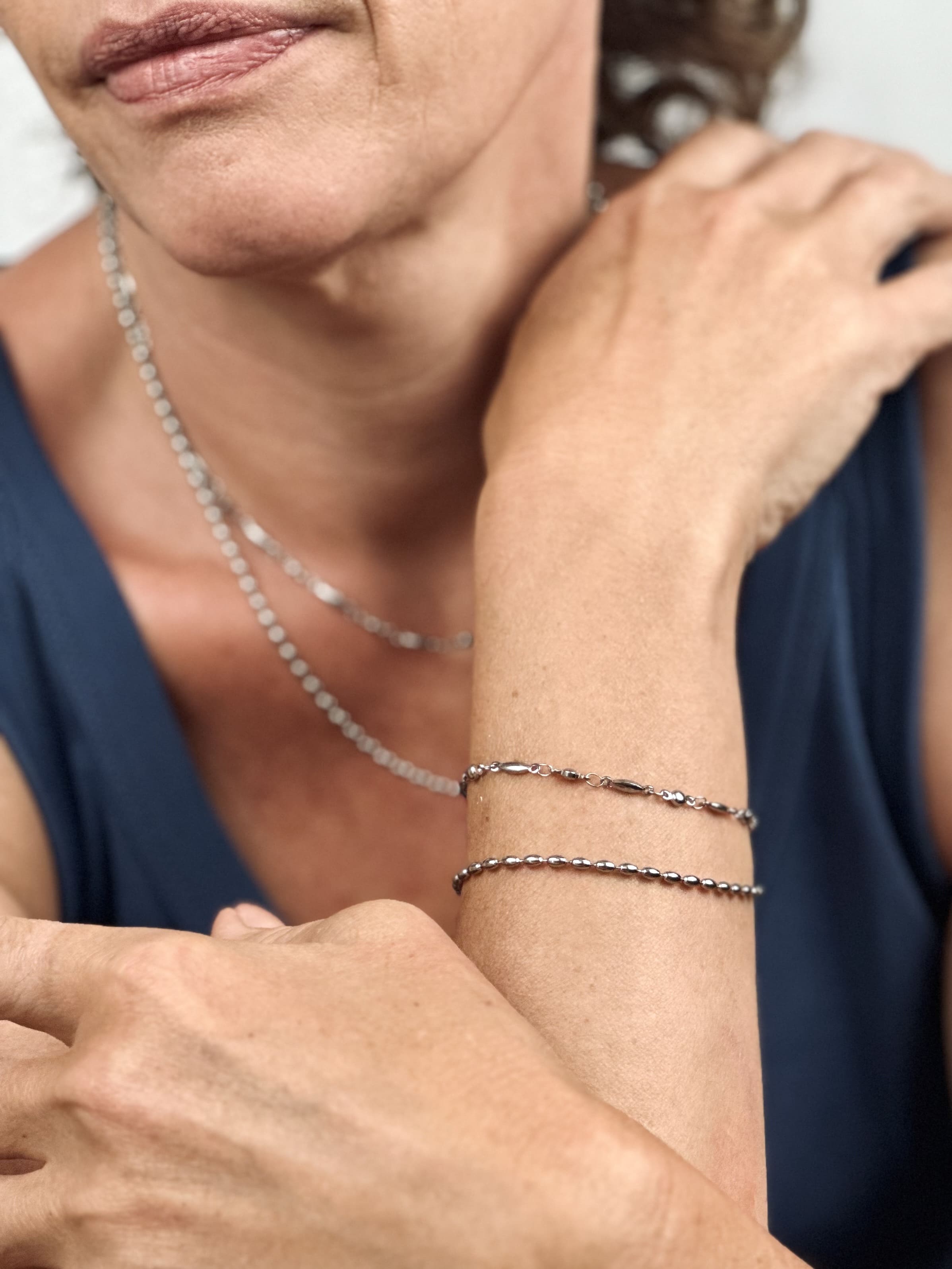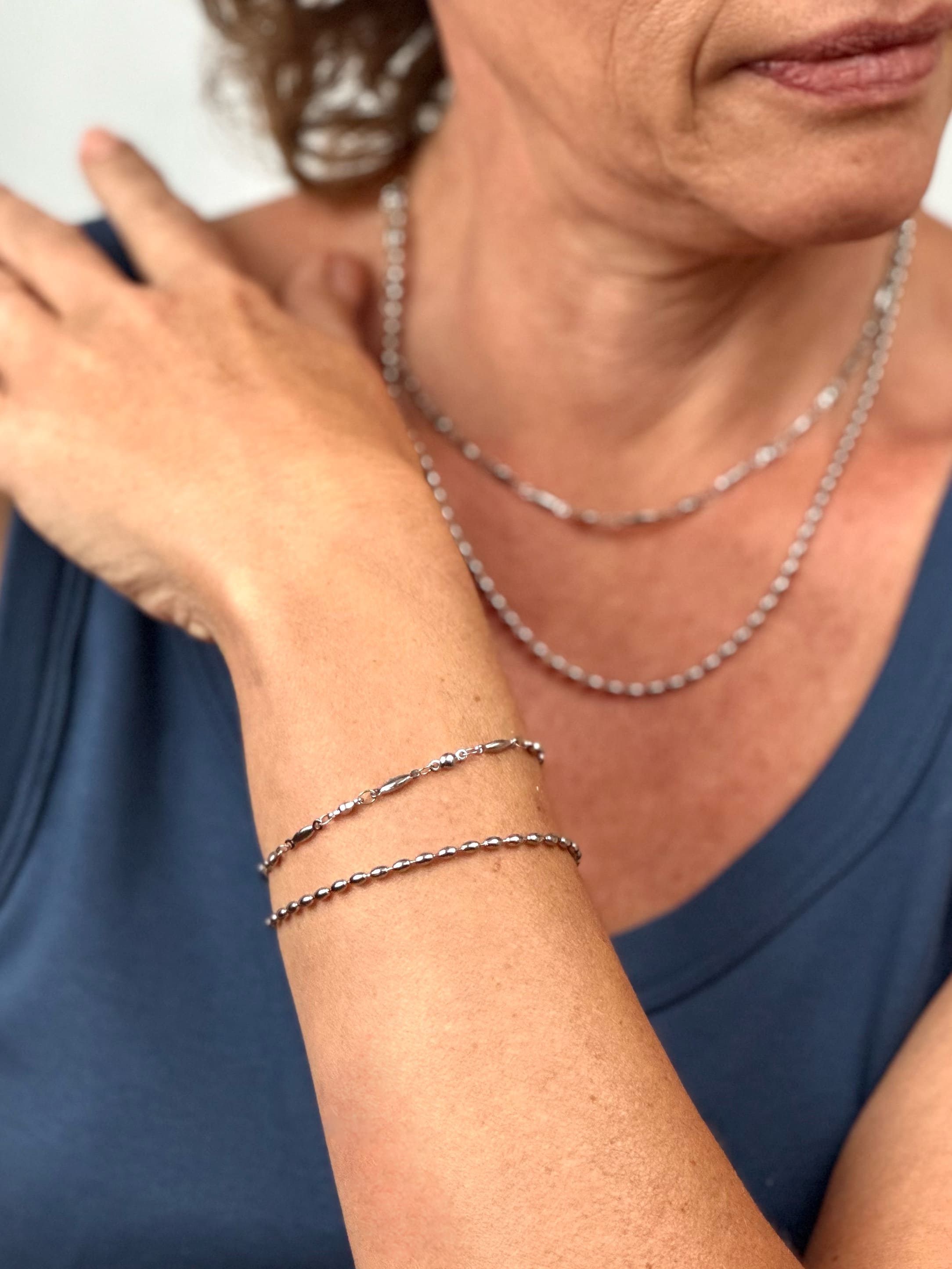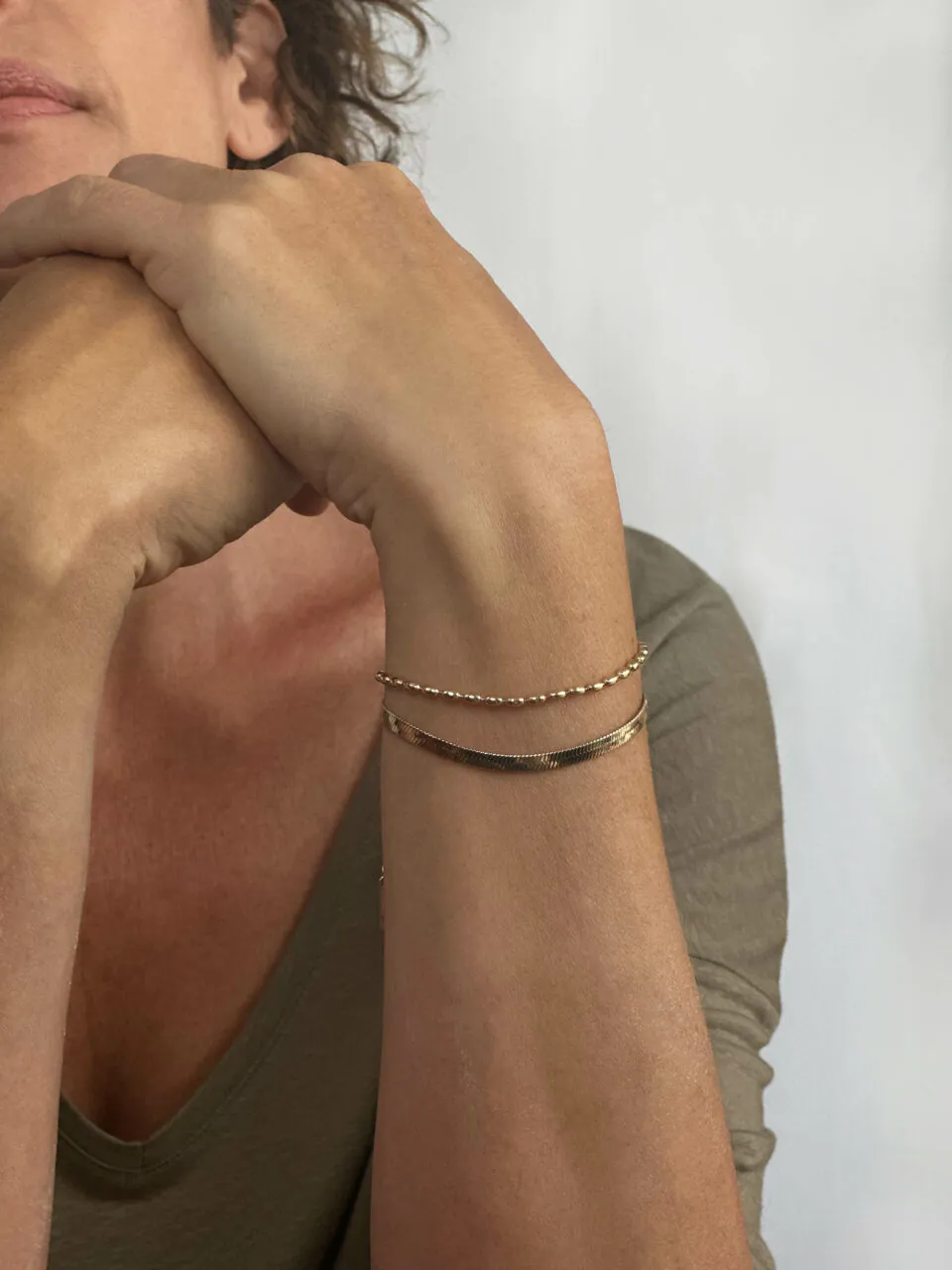 Twice the charm in one easy piece—the Double Beaded Bracelet features two delicate beaded chains joined together for a ready-made layered look. With its soft, golden shine and elegant detail, it’s perfect for adding polish without the fuss. Effortless, timeless, and beautifully balanced.