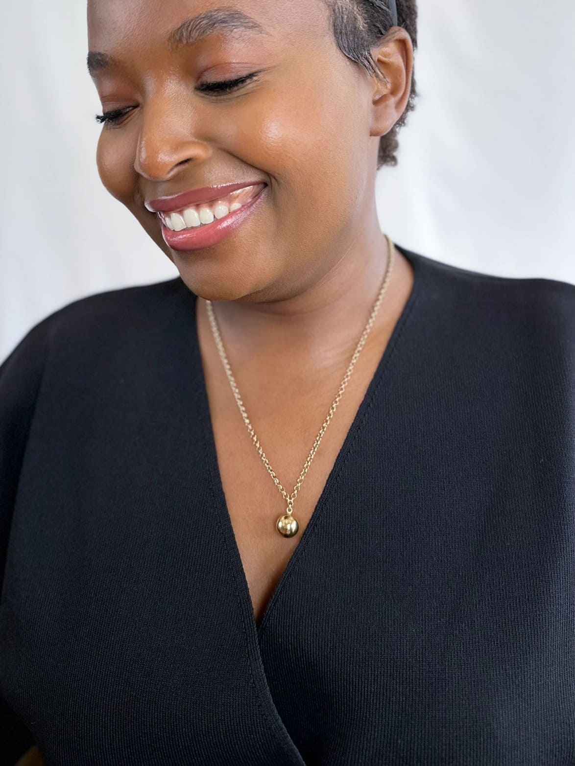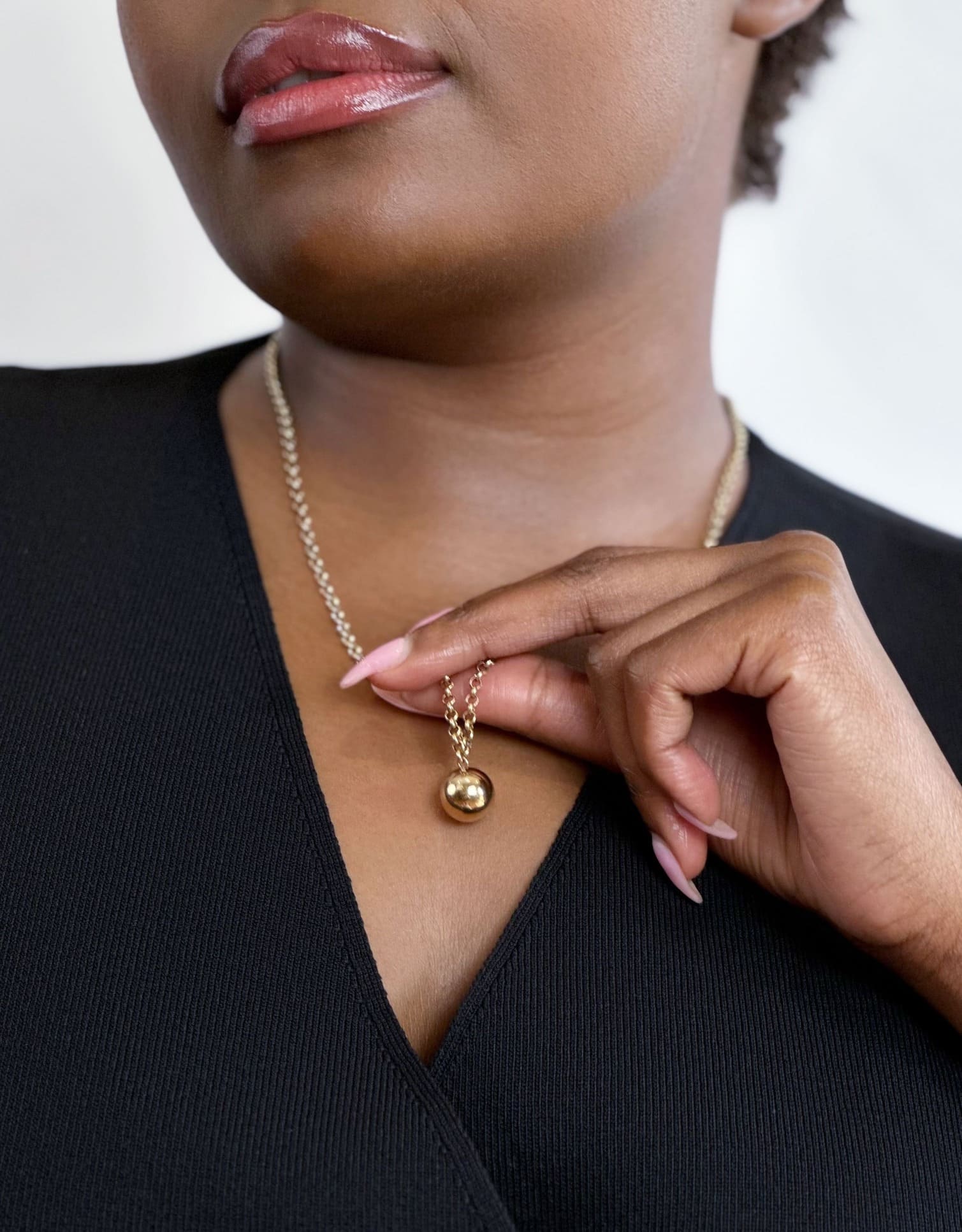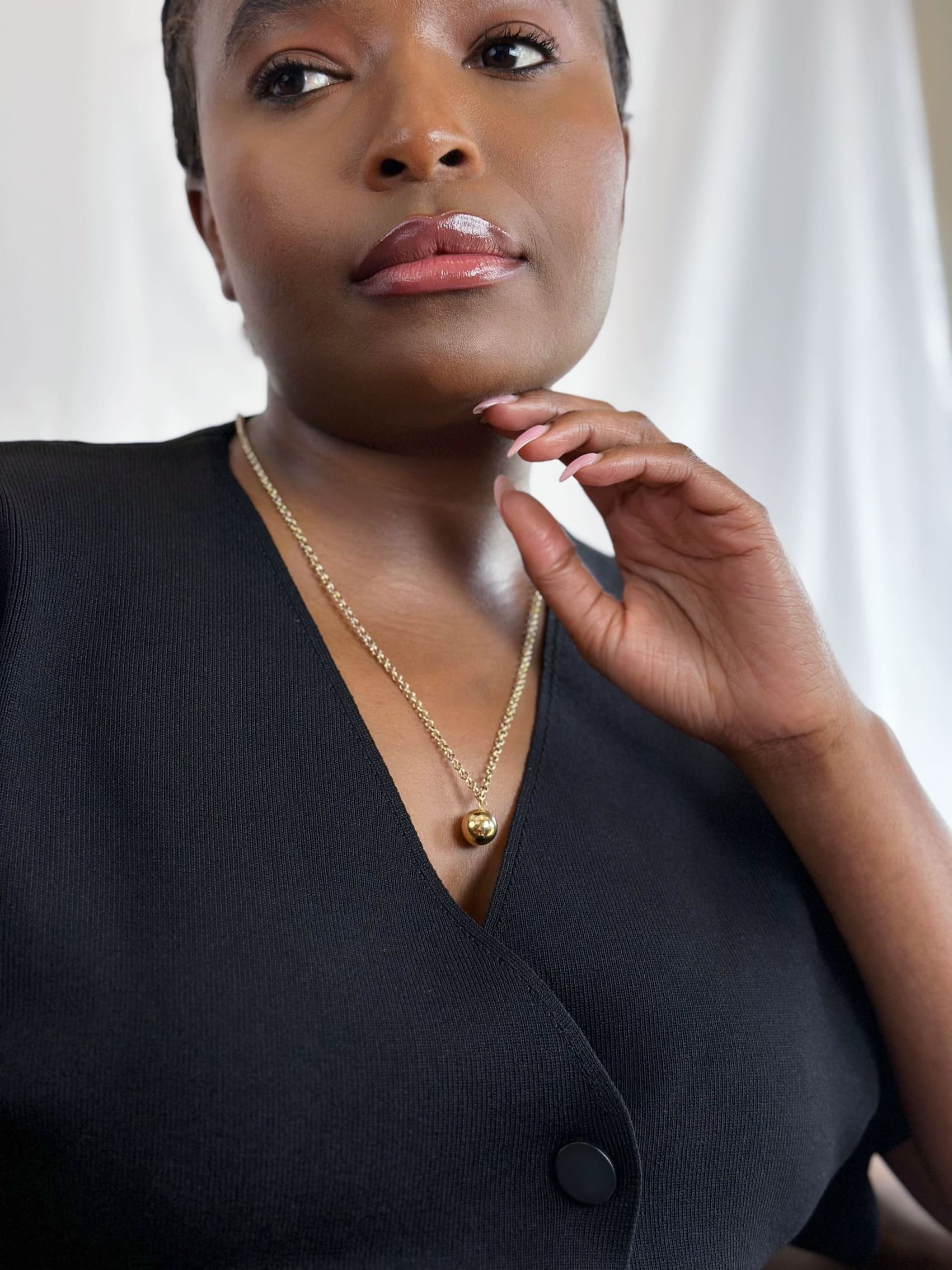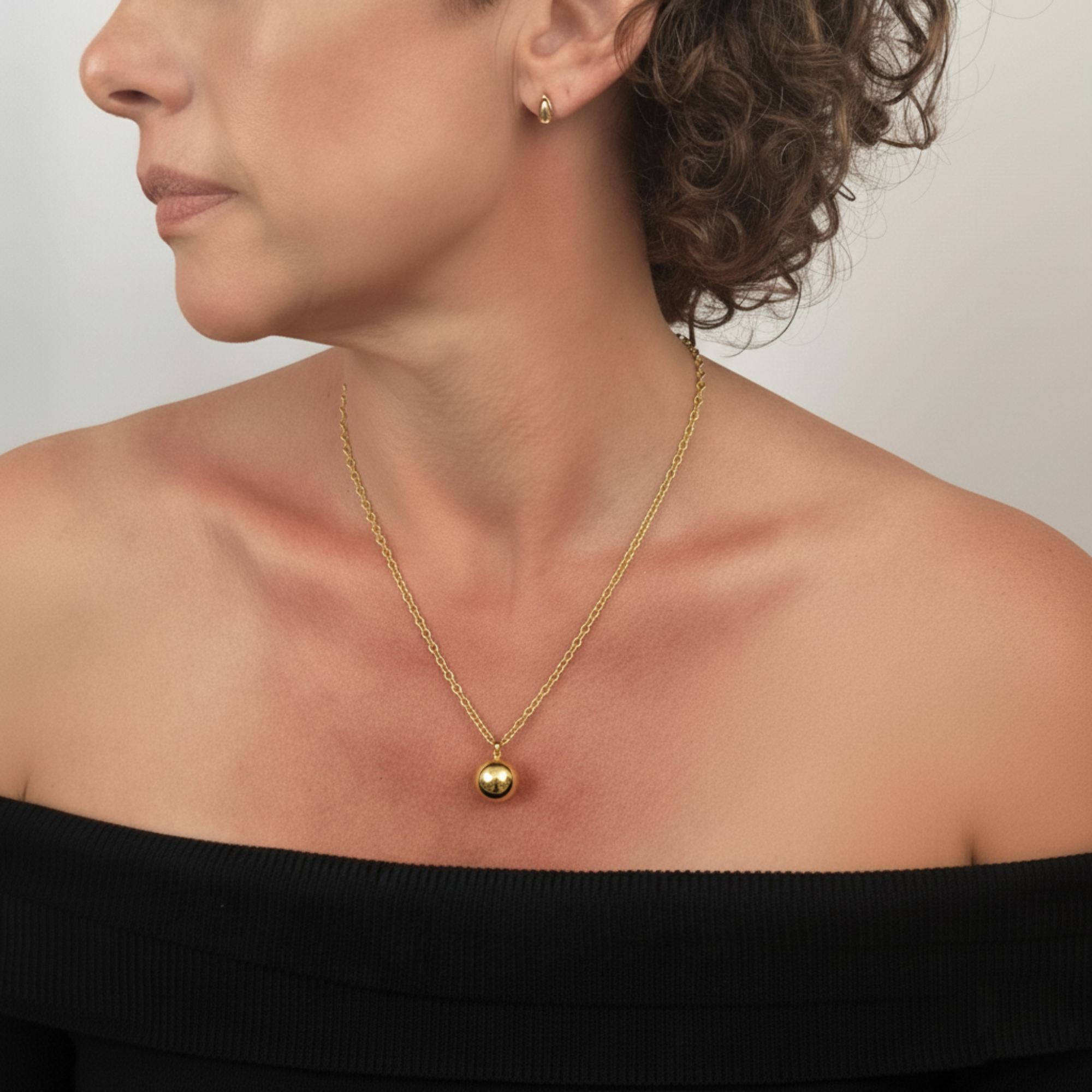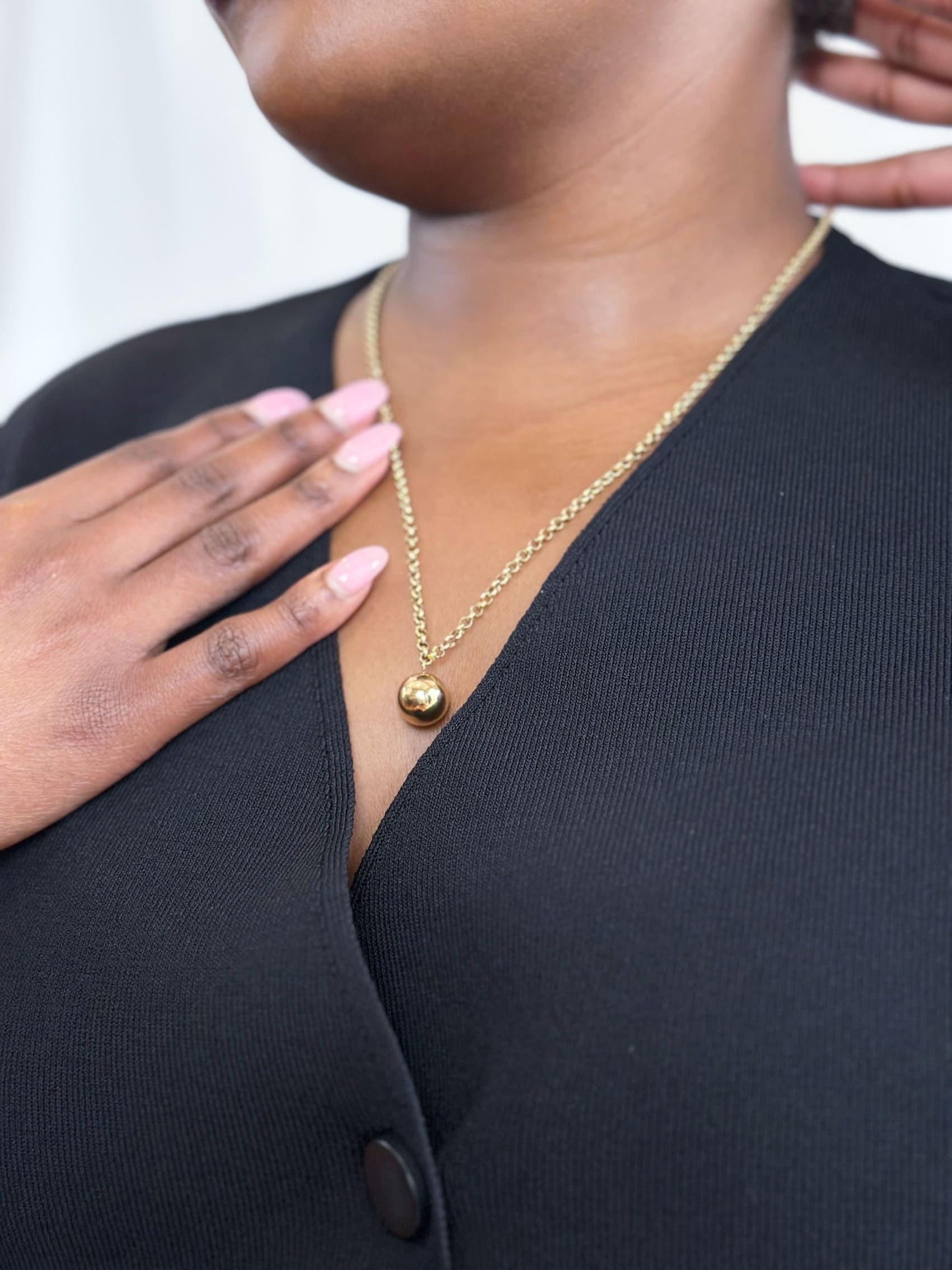 Minimalist and effortlessly chic, the Golden Drop Necklace features a smooth gold orb pendant on a longer 20–22 inch chain. Designed to sit gracefully below the collarbone, it’s perfect for layering or wearing solo for a clean, modern finish. Timeless simplicity, made to shine every day.